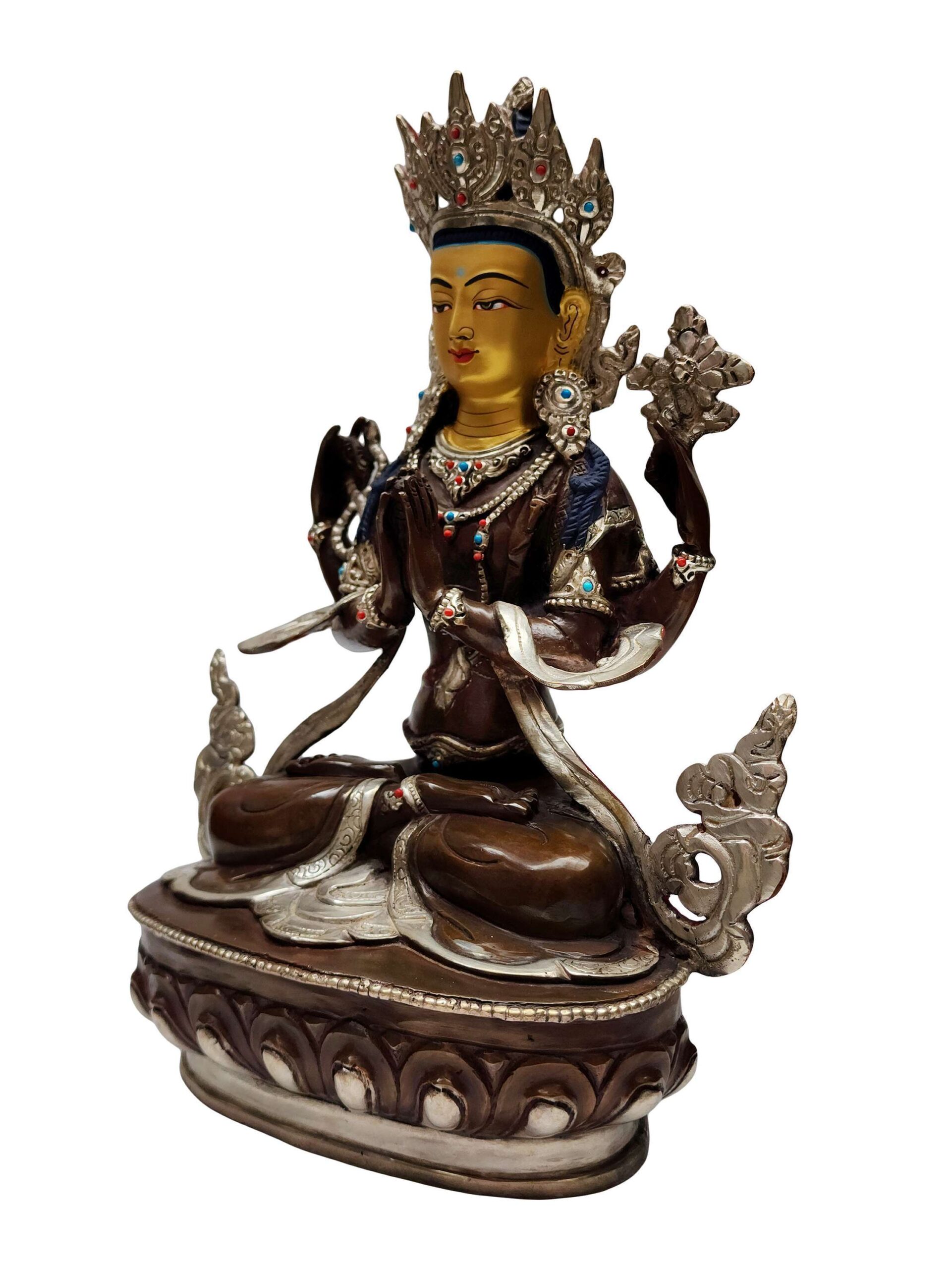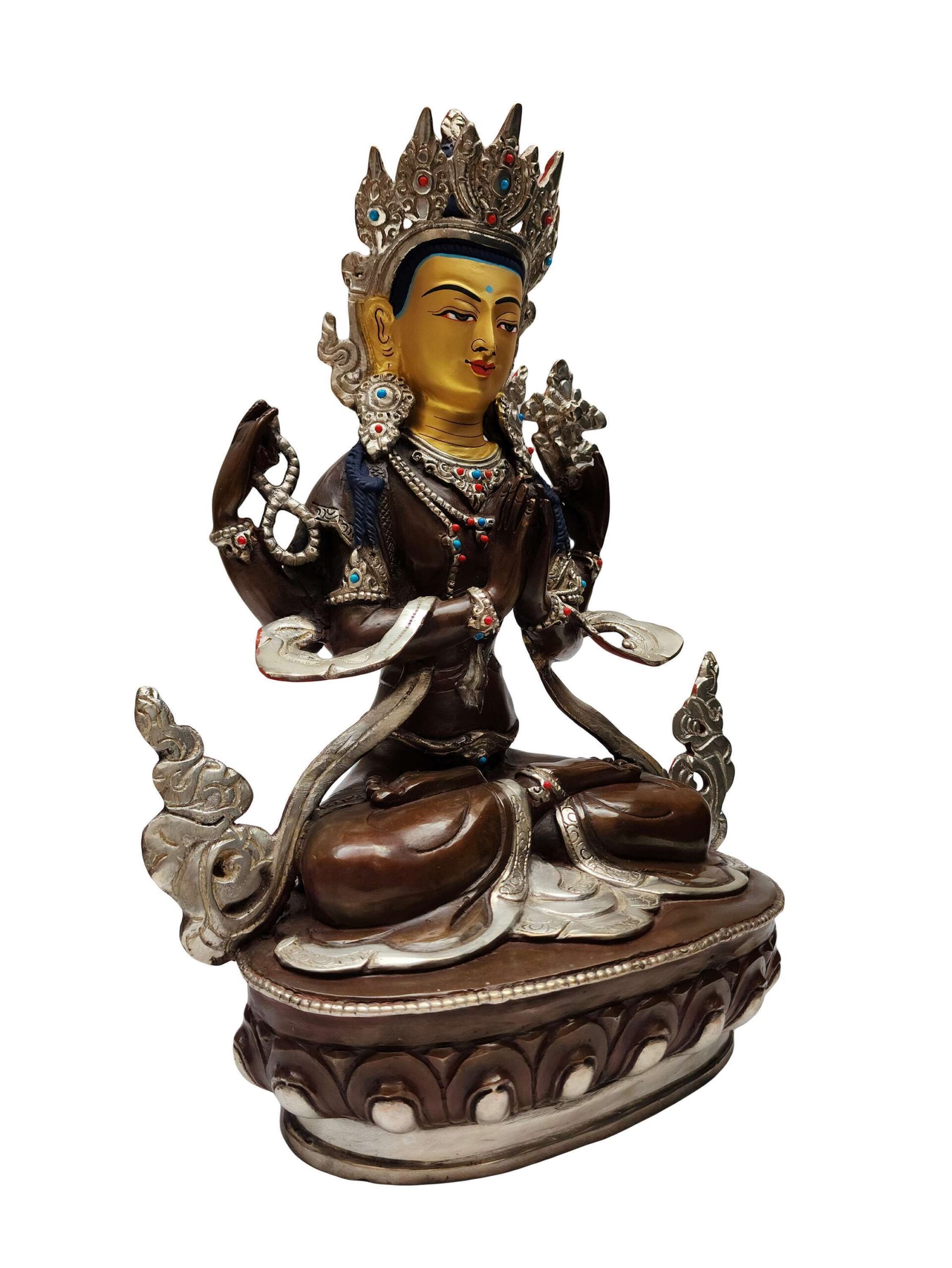 Handmade Chenrezig Statue – Silver Plated & Chocolate Oxidized Finish – Gold-Painted Face