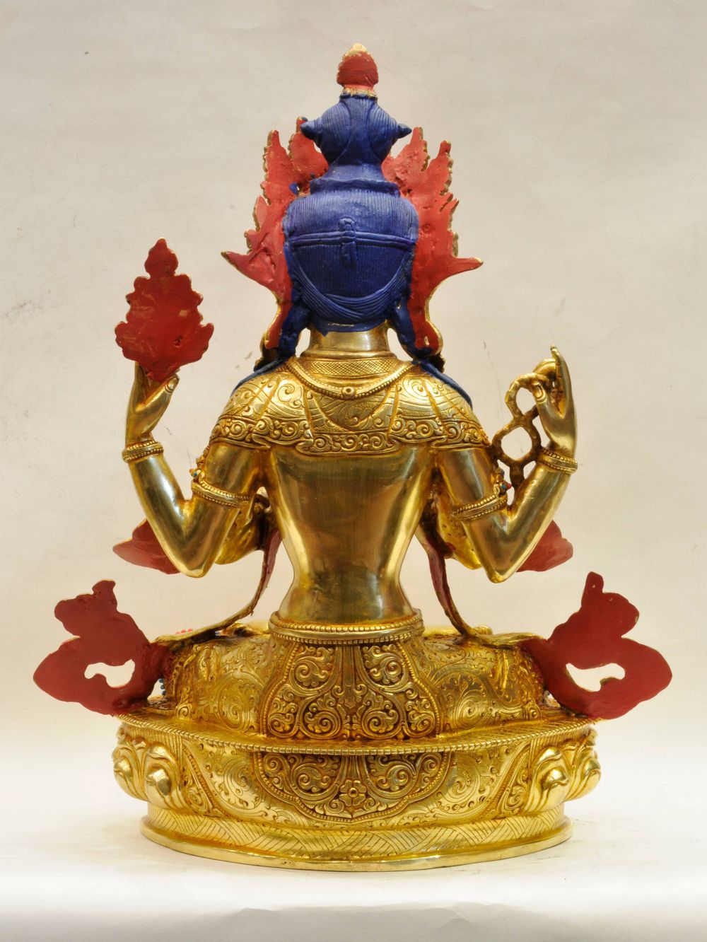The face of Chenrezig is delicately painted with pure gold, emphasizing his eyes and lips, which convey compassion and peace. This sacred painting ritual is an essential part of Buddhist consecration, believed to breathe life into the statue and imbue it with spiritual presence. This level of craftsmanship speaks to both artistic excellence and devotional reverence, enhancing the statue’s value as a spiritual object.