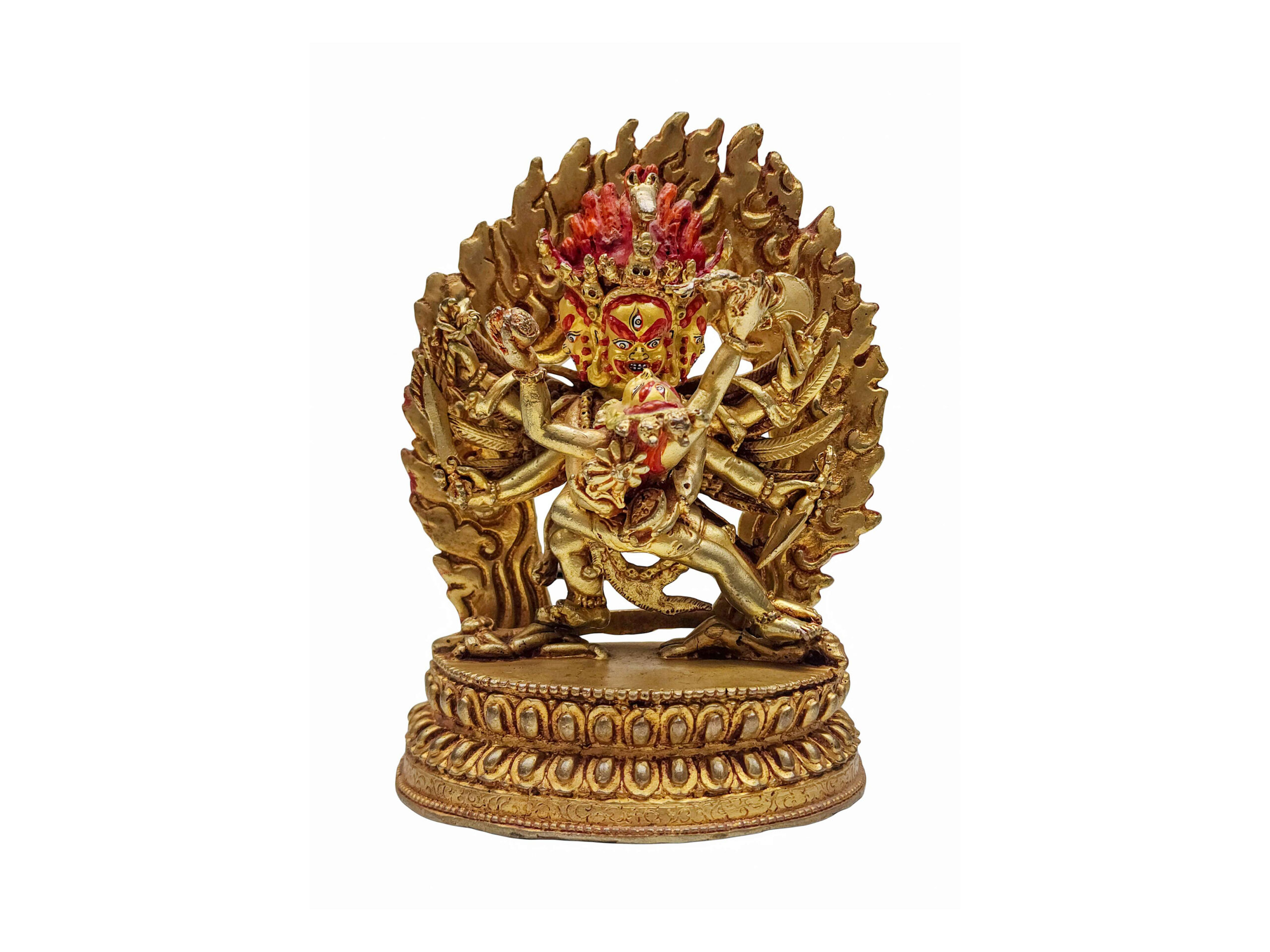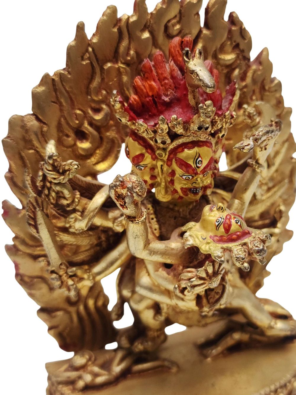 The face of the statue is hand-painted in gold, highlighting the expressive power of Hayagriva’s eyes and features. This is not just decorative—face painting is an essential consecration step in Tibetan Buddhism, believed to breathe life and presence into the figure. Each brushstroke represents the devotion of the artisan and prepares the statue for spiritual practice or sacred display.