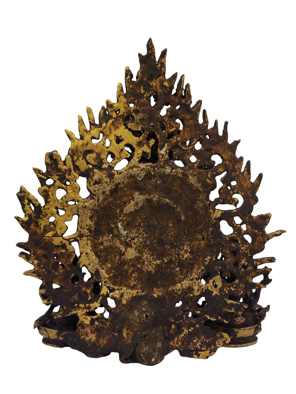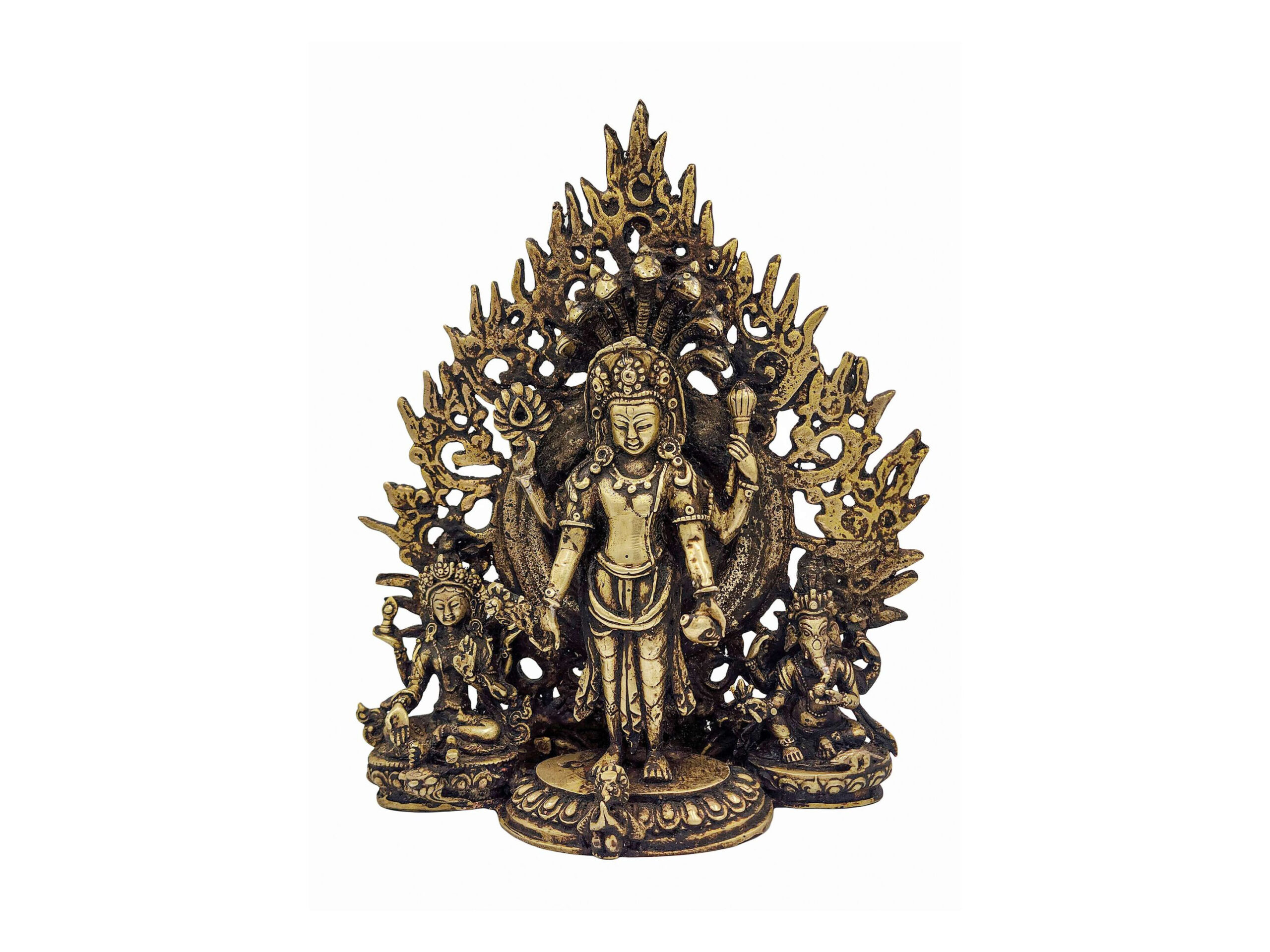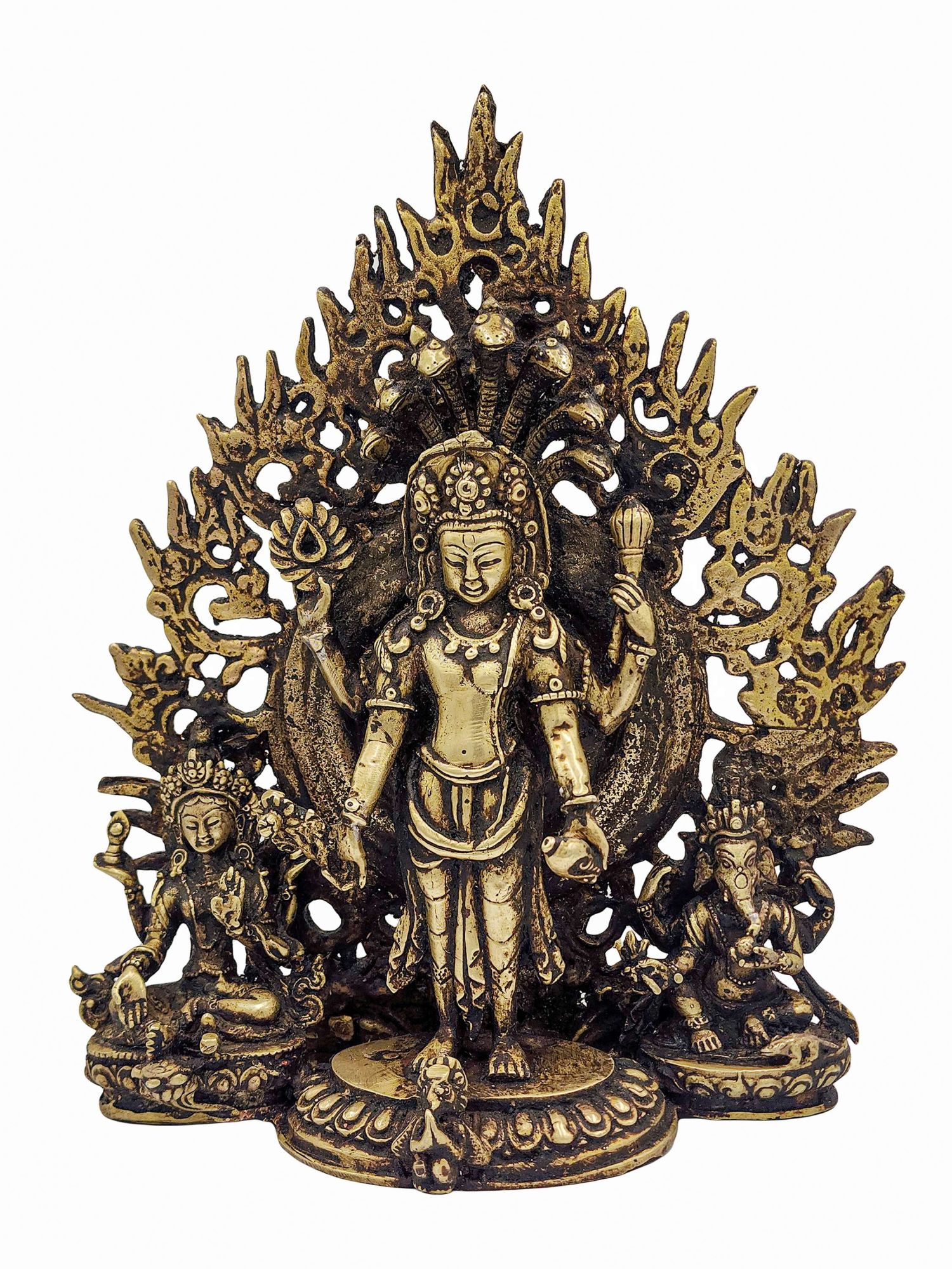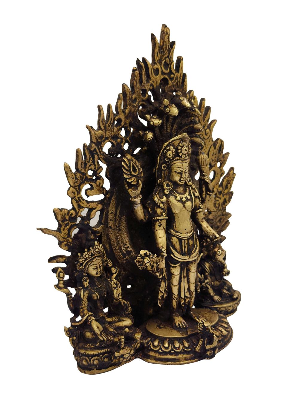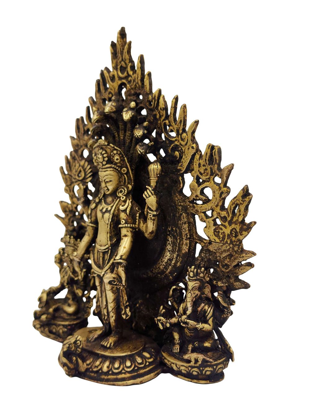 This statue is not an antique, but features a beautiful antique-style patina finish. Skilled artisans in Nepal apply a meticulous aging technique that enhances the sculpture with a timeworn, sacred appearance—reflecting the depth of divine timelessness and reverence. Every piece is slightly unique due to this handcrafted finishing.