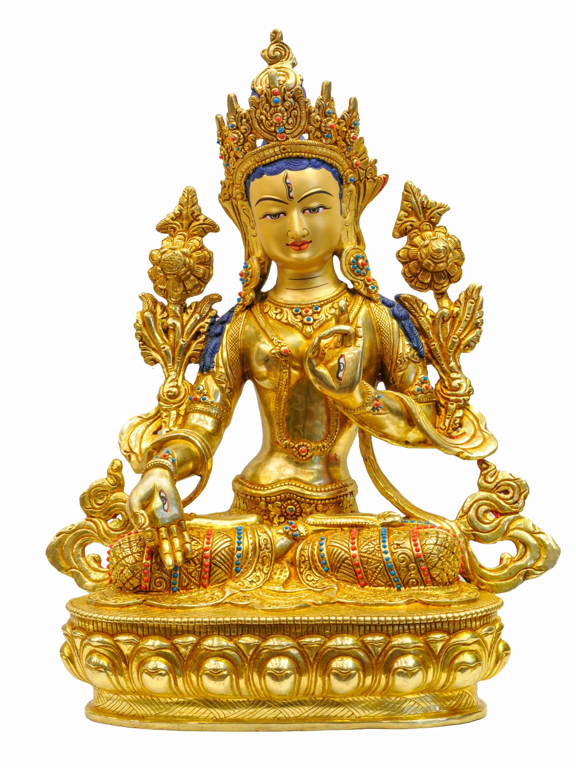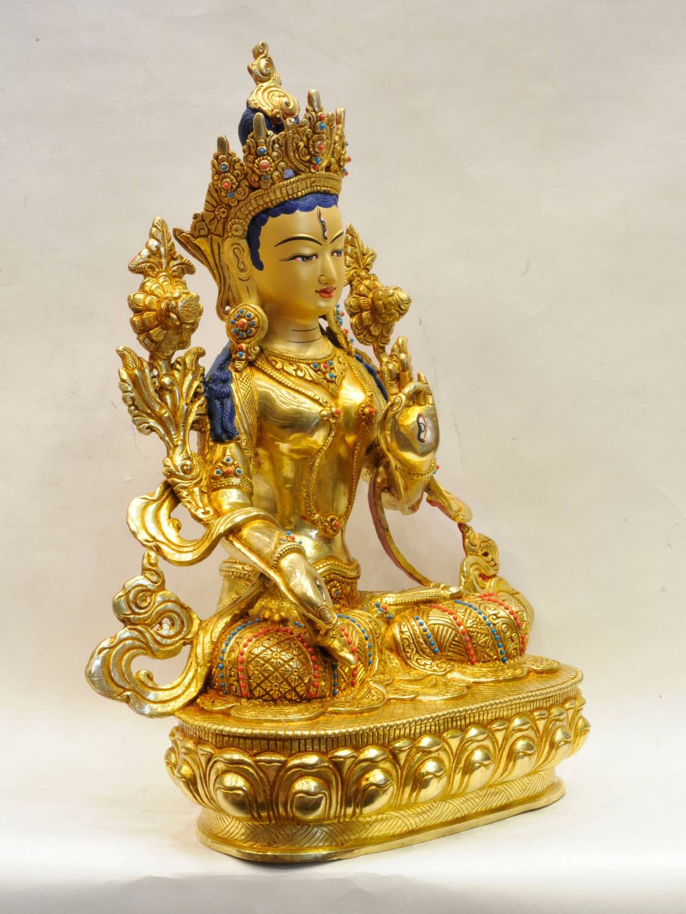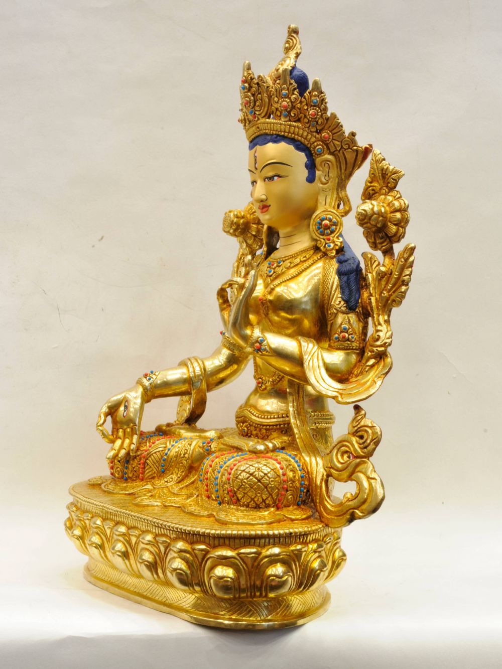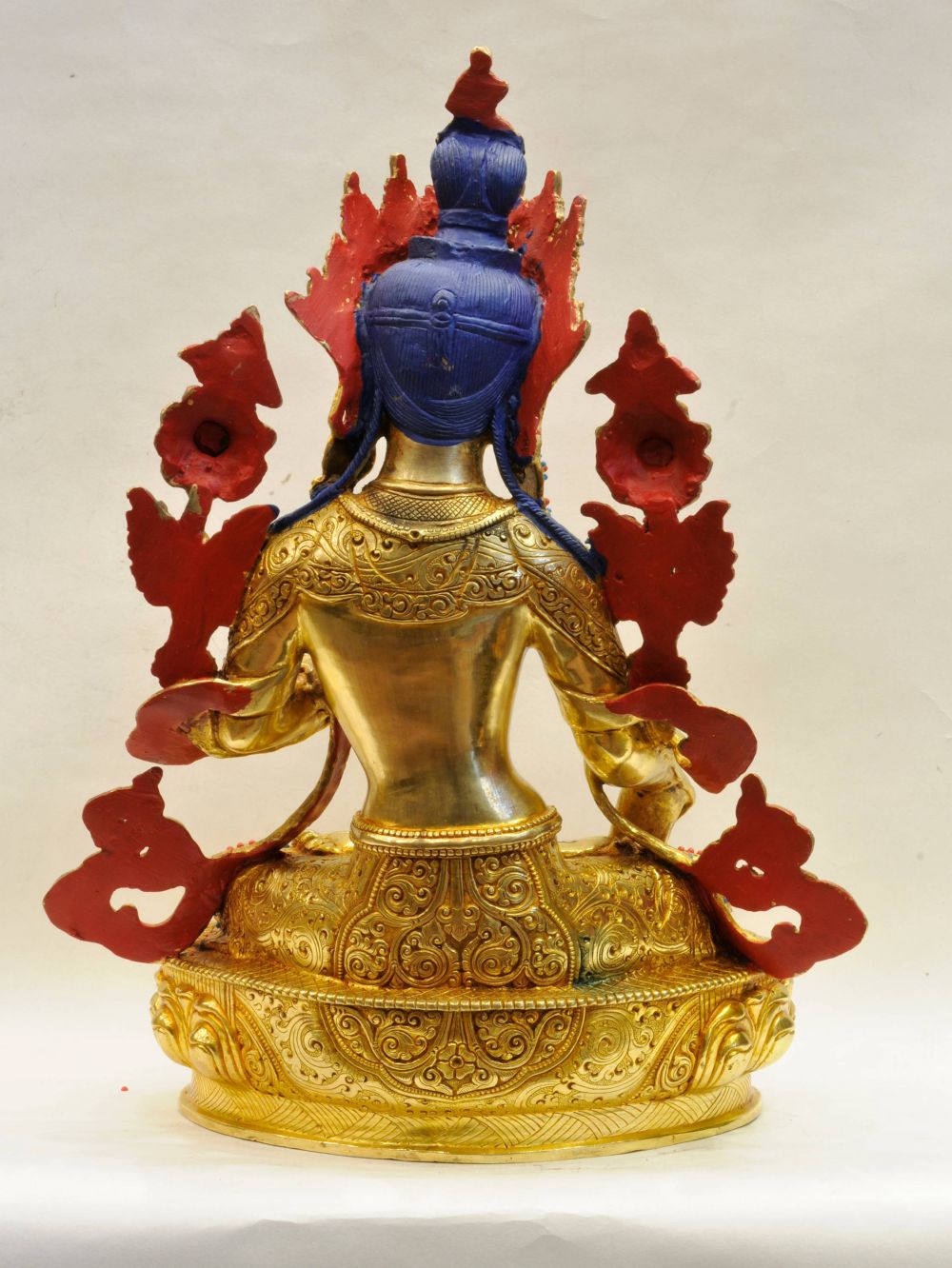 This statue is finished using the traditional fire gold plating method, also known as mercury gold plating. This time-honored technique involves applying a genuine layer of gold using heat and mercury, resulting in a luminous and enduring finish. Unlike modern electroplating, fire gold plating is highly valued for its authenticity, depth of color, and cultural significance. It has recently seen a revival in Nepal due to its superior quality and the heritage it represents.