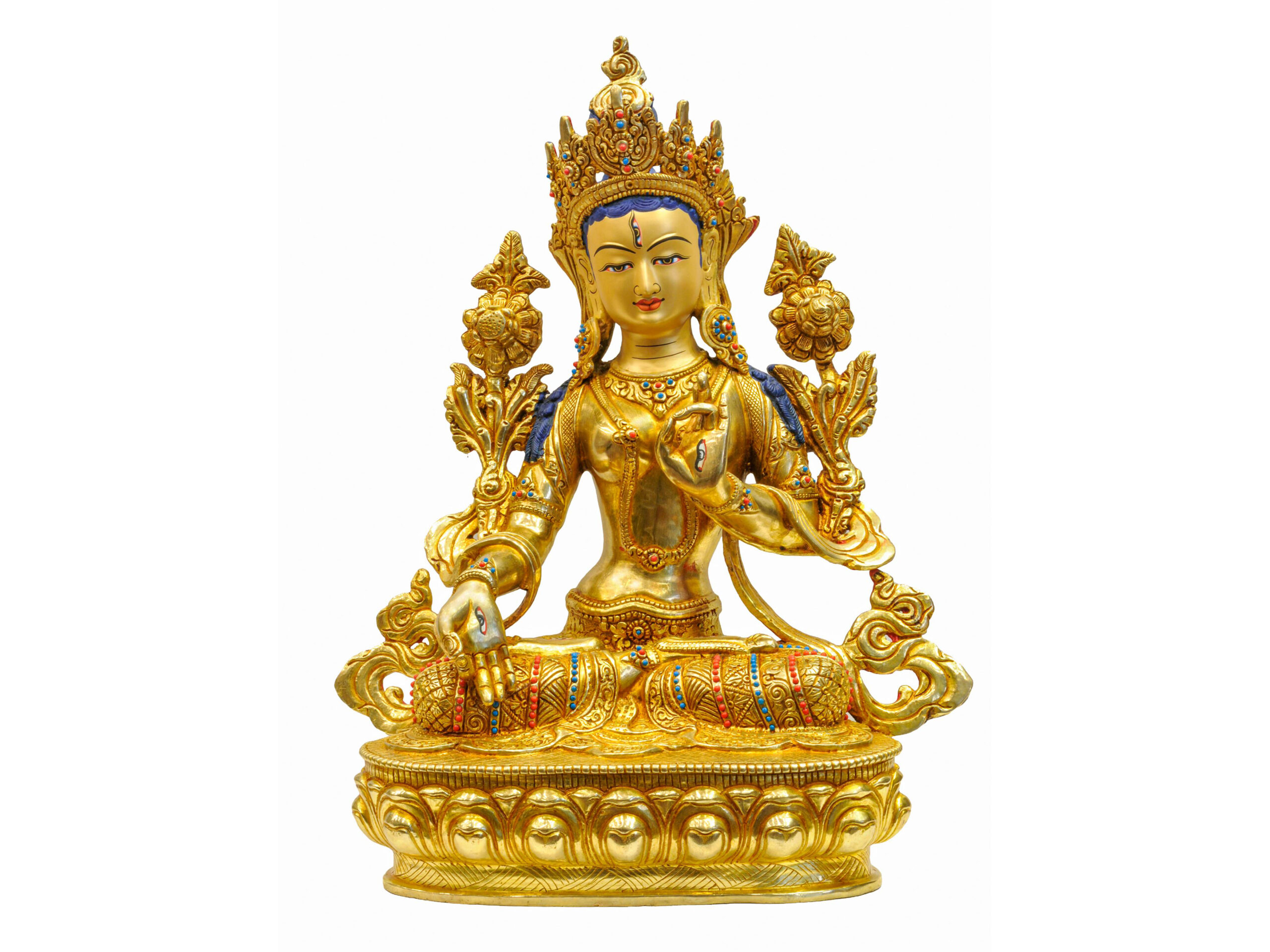 The face of White Tara is delicately hand-painted with gold to emphasize her most expressive features—especially the eyes and lips. This process is not merely decorative but holds deep ritual significance in Buddhist practice. The gold-painted face symbolizes the awakening of spiritual life within the statue, transforming it from an object into a consecrated presence. This sacred touch reflects the devotion and refined skill of the artisan, ensuring that each statue carries both visual impact and spiritual integrity.