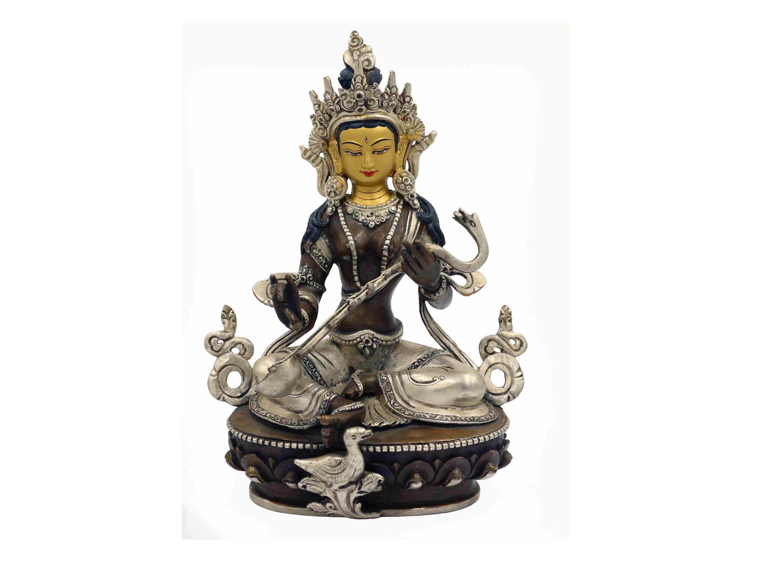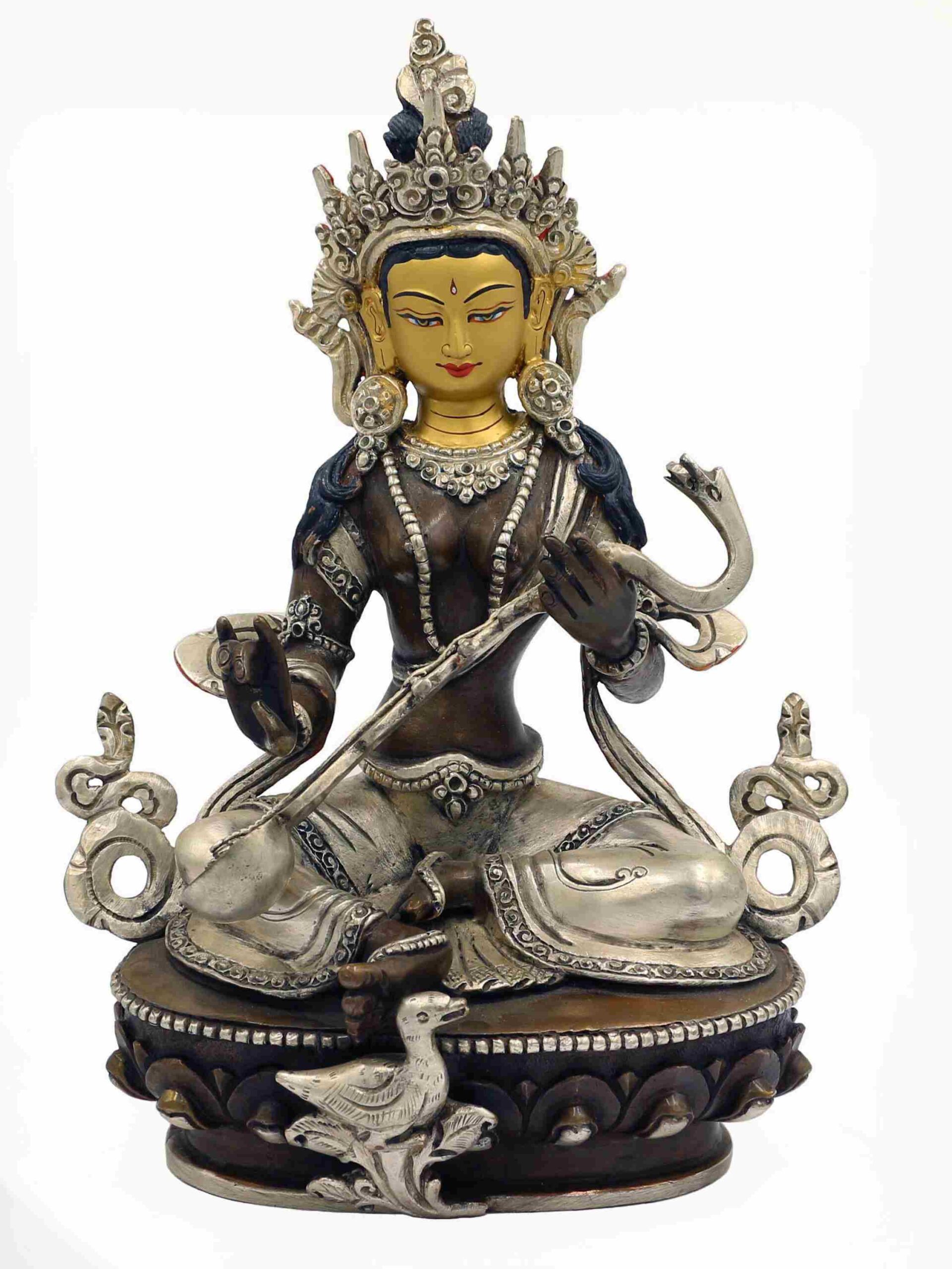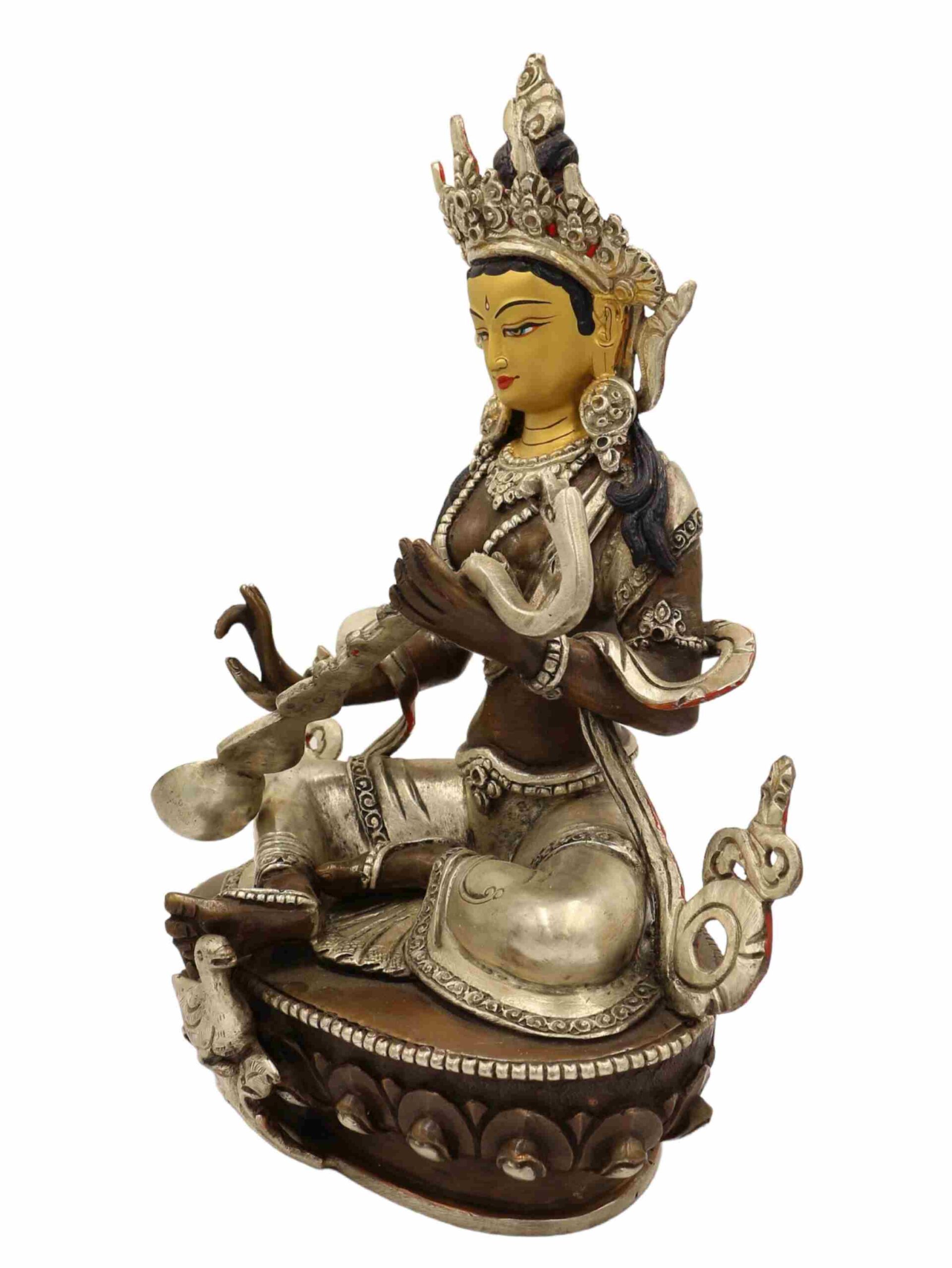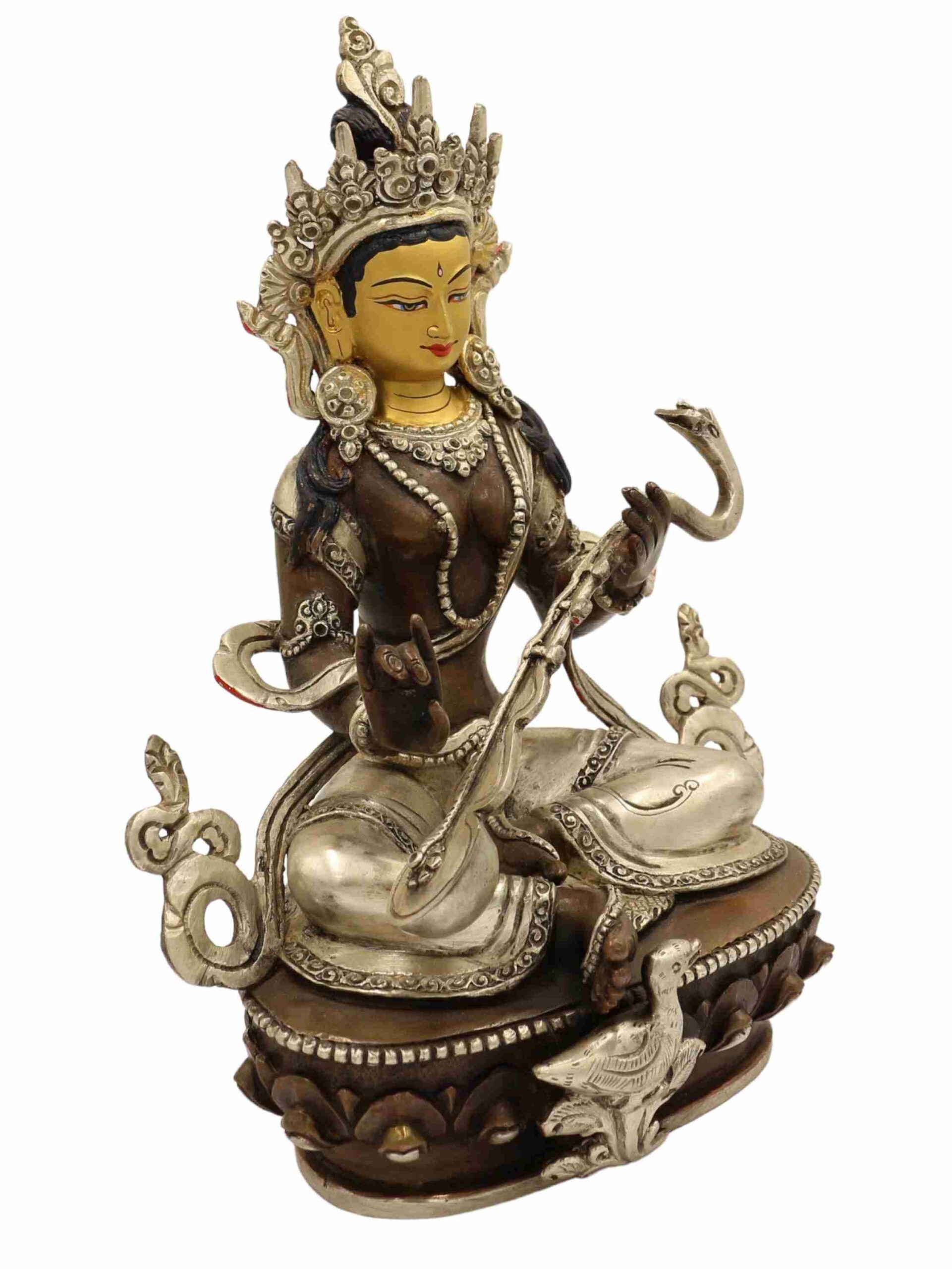In both Hindu and Buddhist craftsmanship, painting the face in gold is a ritual of consecration and devotion, believed to imbue the sculpture with vitality, awareness, and sacred energy. This careful detailing not only amplifies the visual elegance but also honors the divine essence of Saraswati.