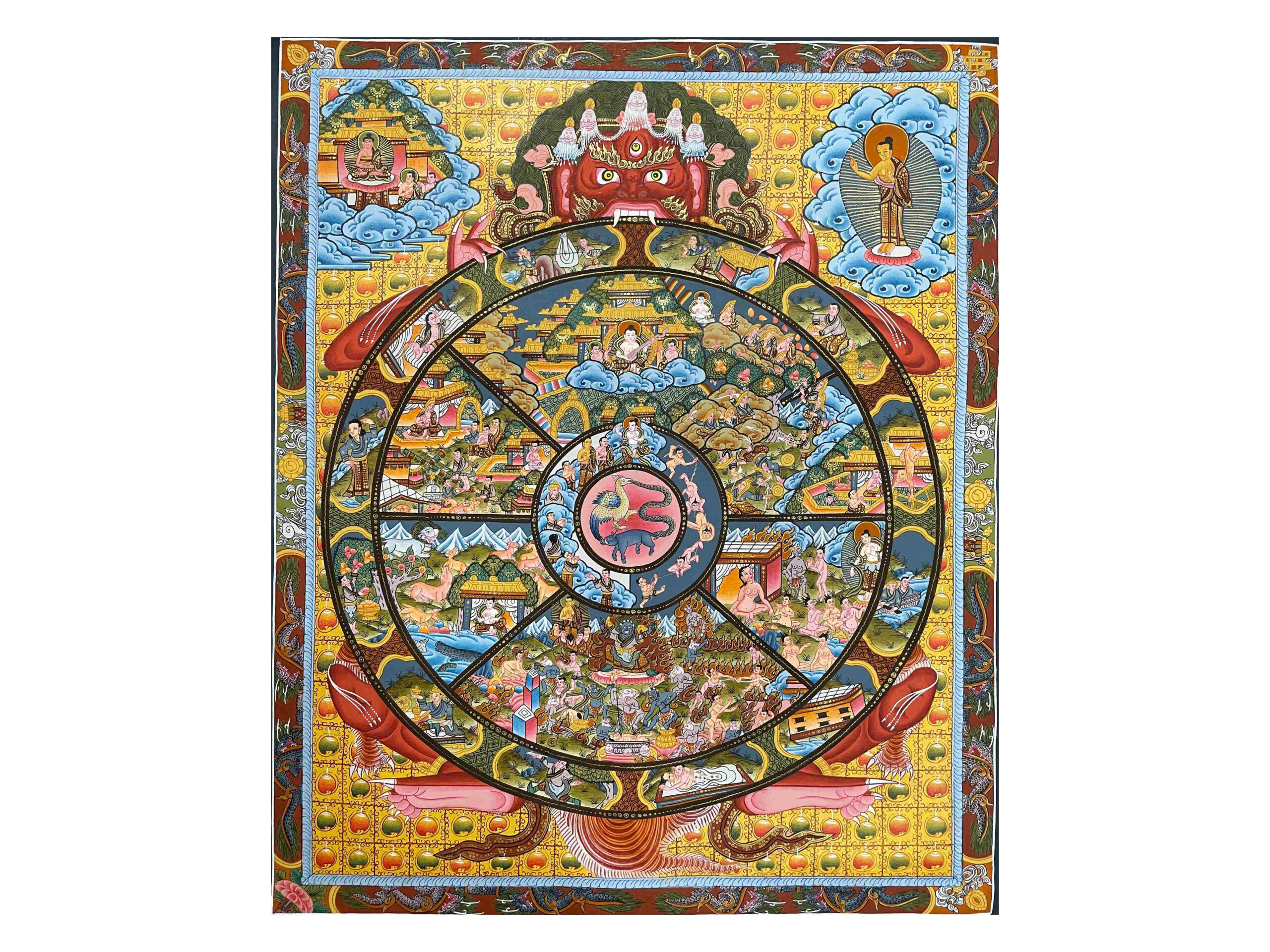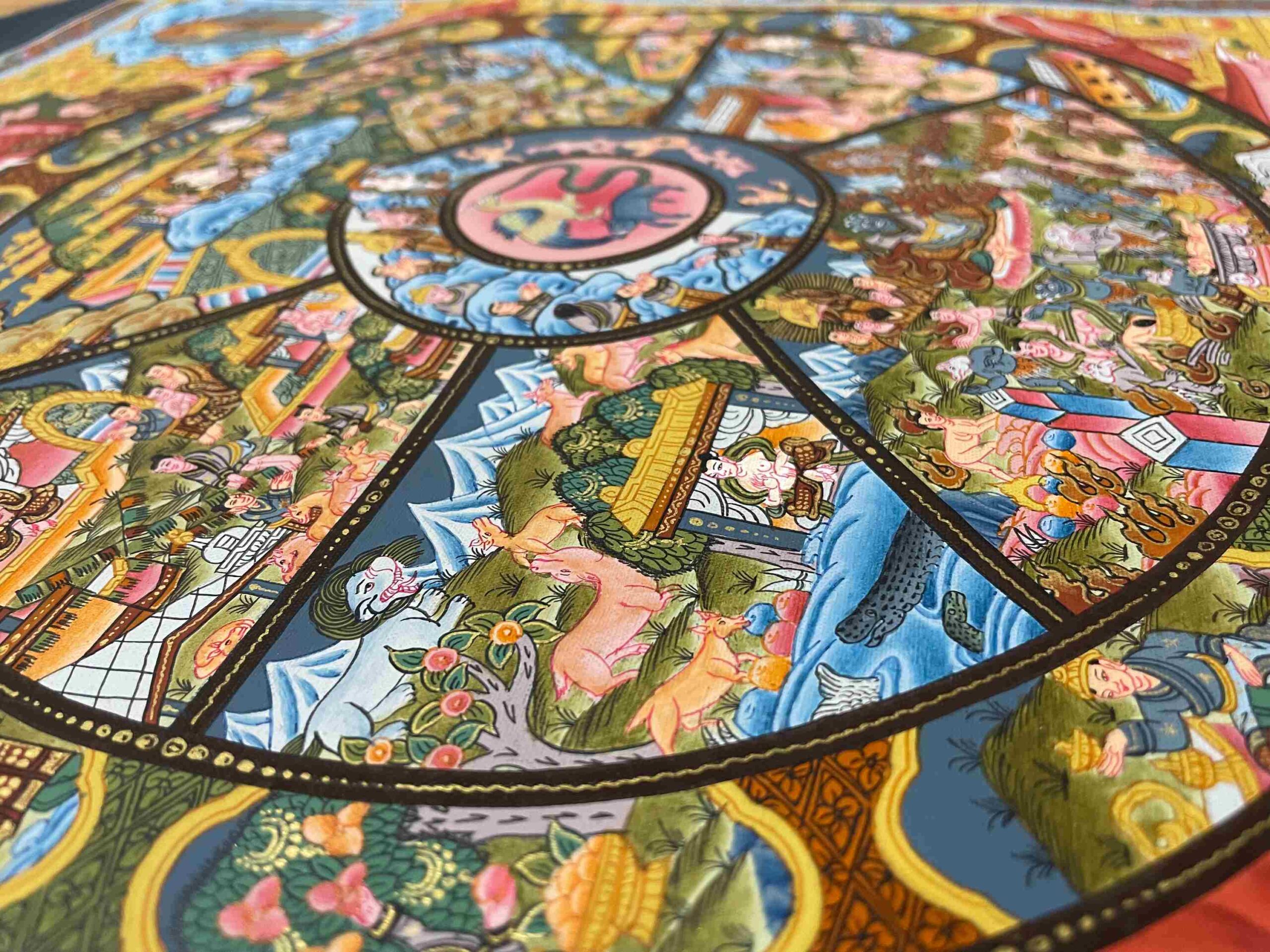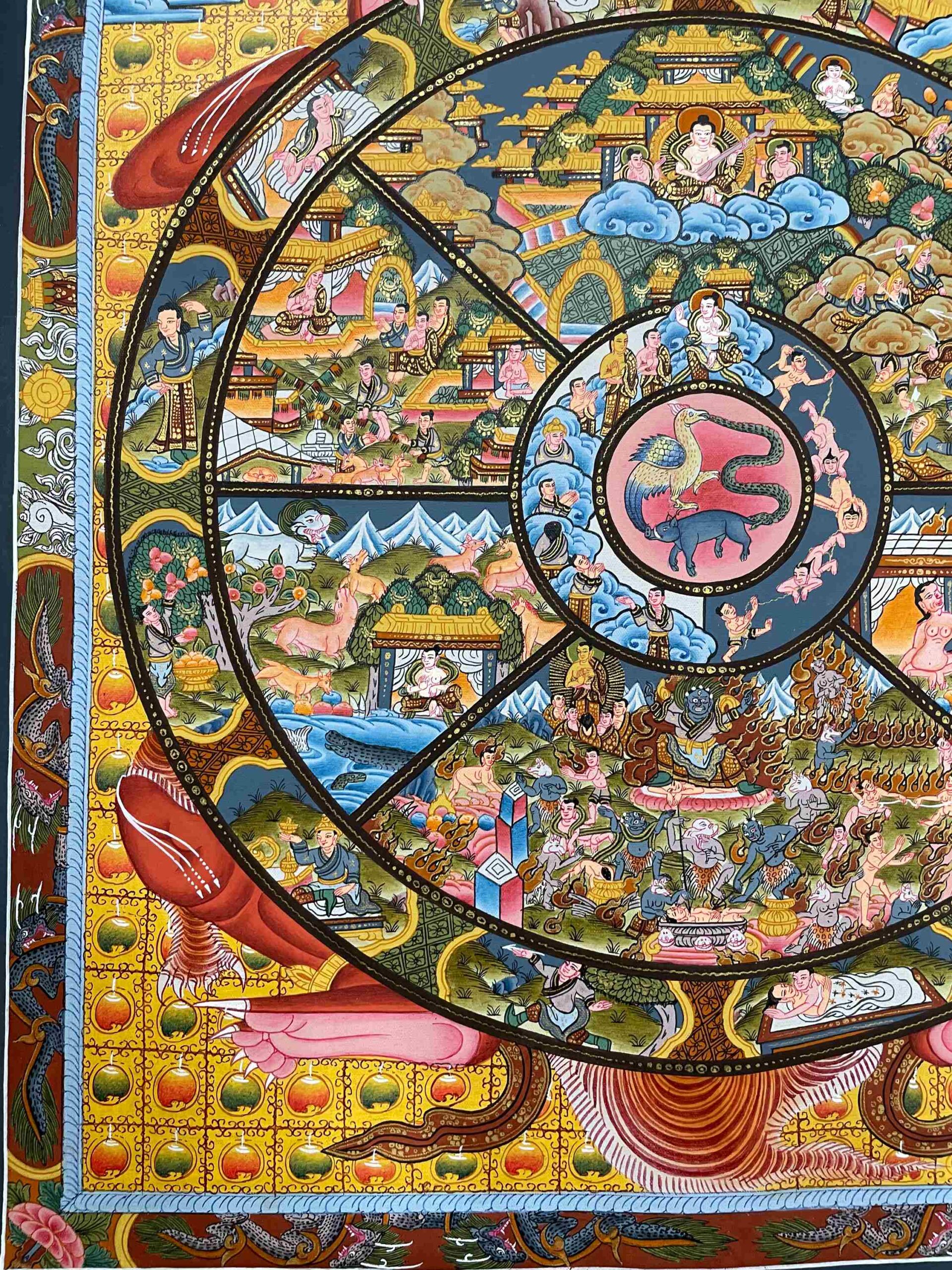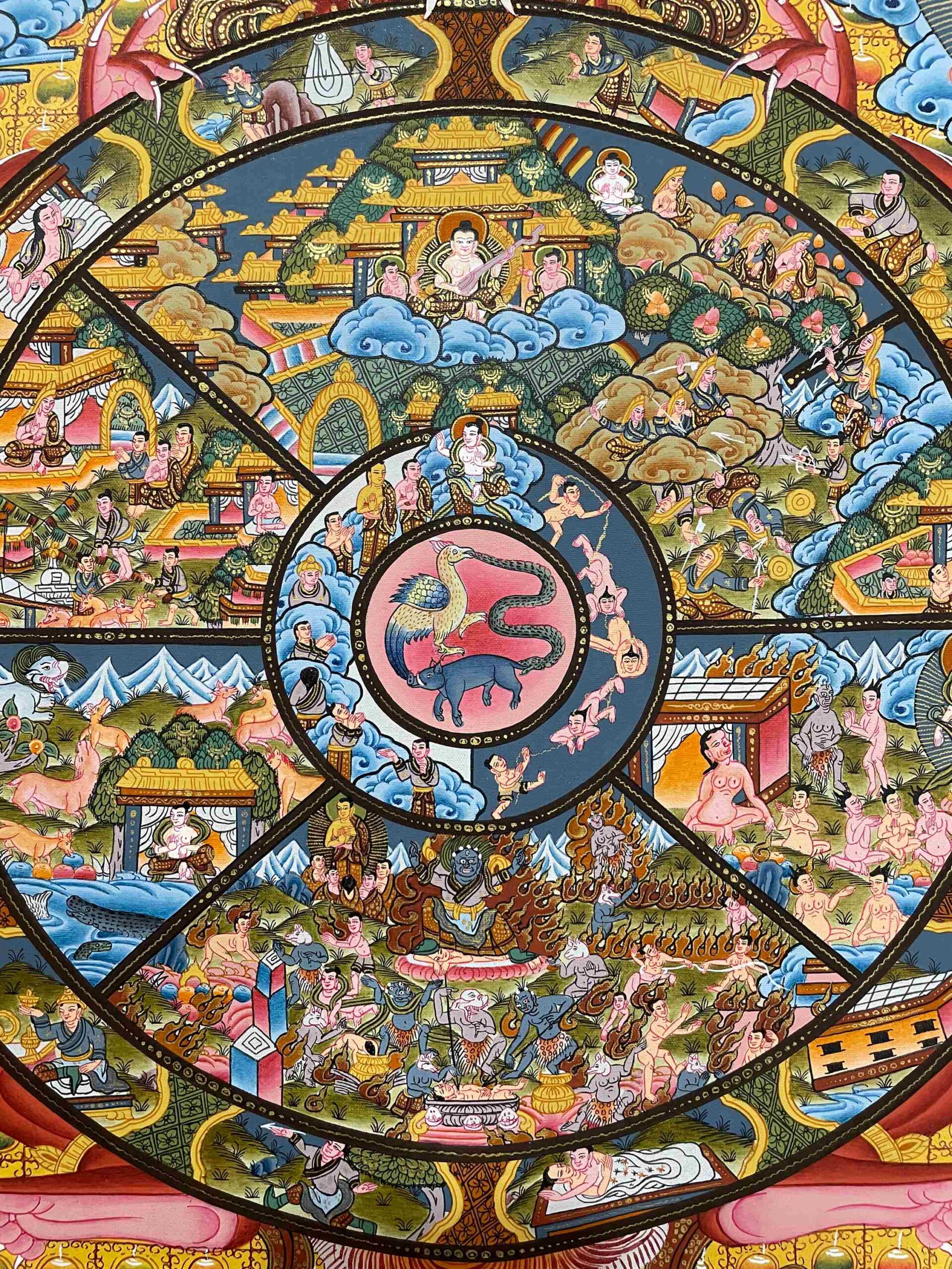 At the center of the wheel are the three fundamental poisons—ignorance, attachment, and aversion—that fuel the endless cycle of suffering (samsara). Surrounding this center are depictions of the six realms: god, demi-god, human, animal, hungry ghost, and hell realms, each representing a different state of existence shaped by one’s karma.