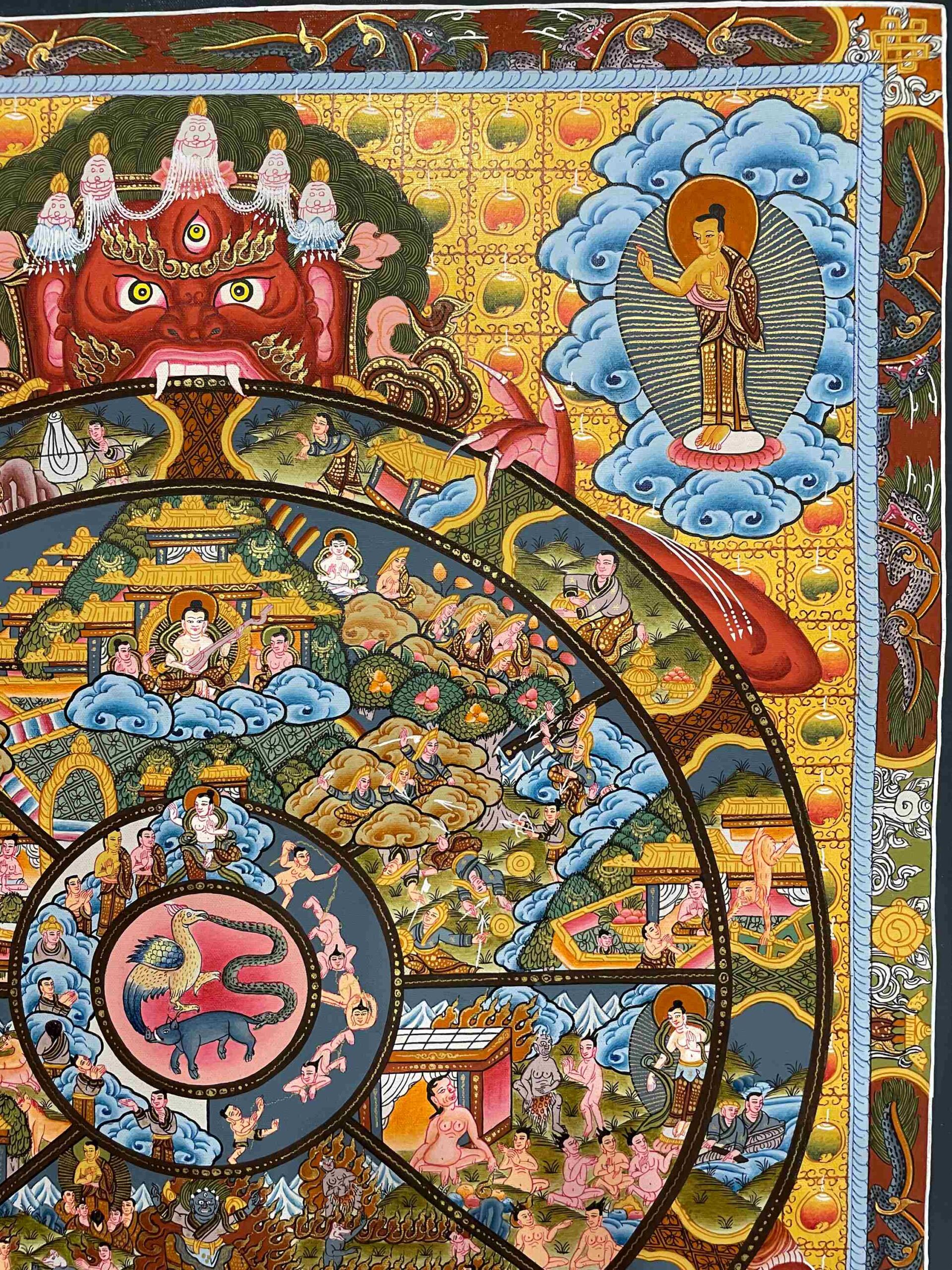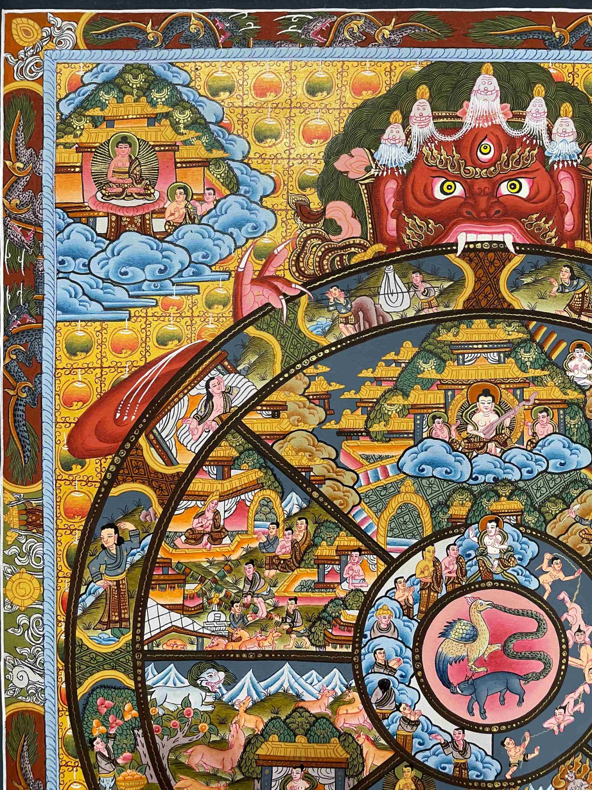 HQ Buddhist Hand-Painted Thangka of Wheel of Life | Real Gold Accents