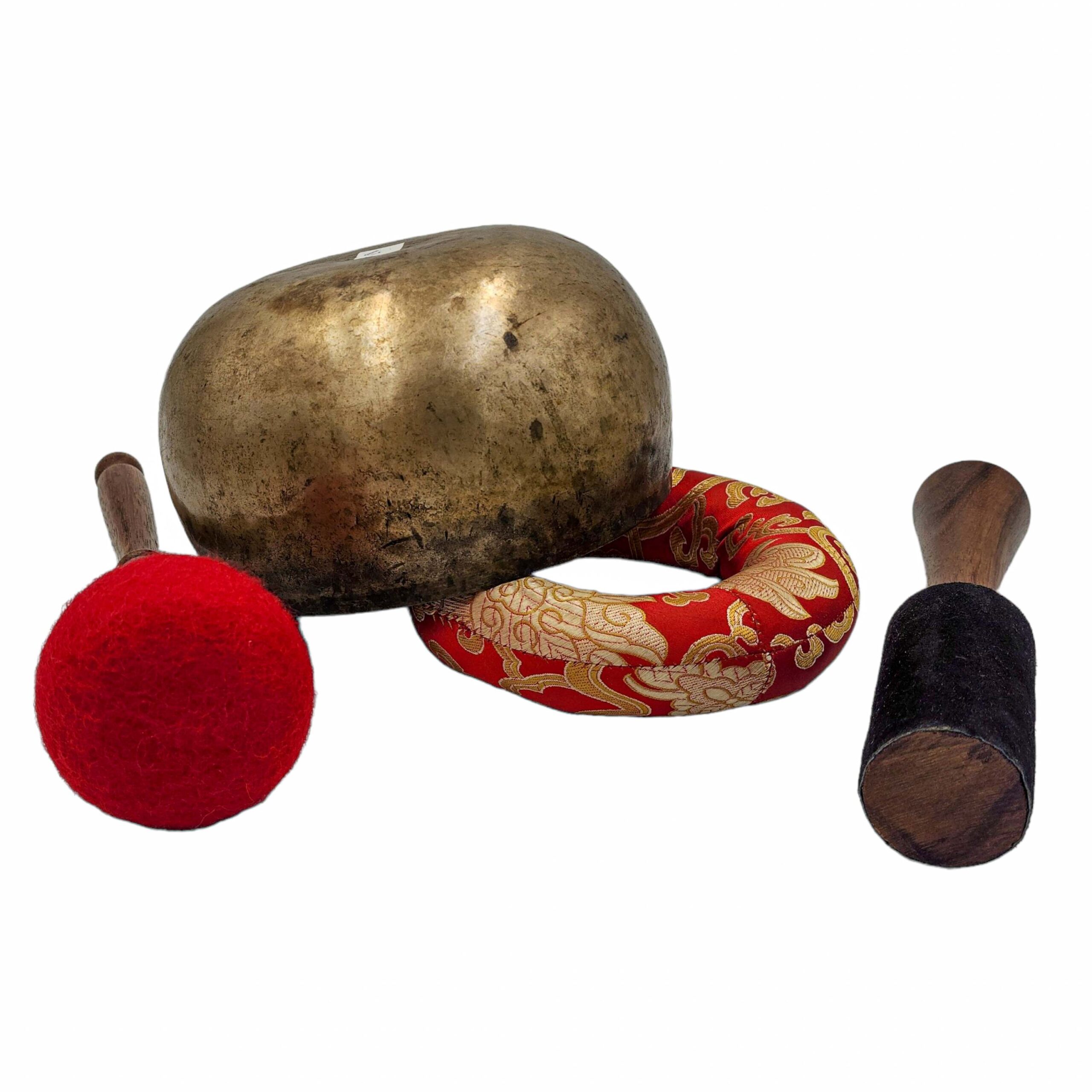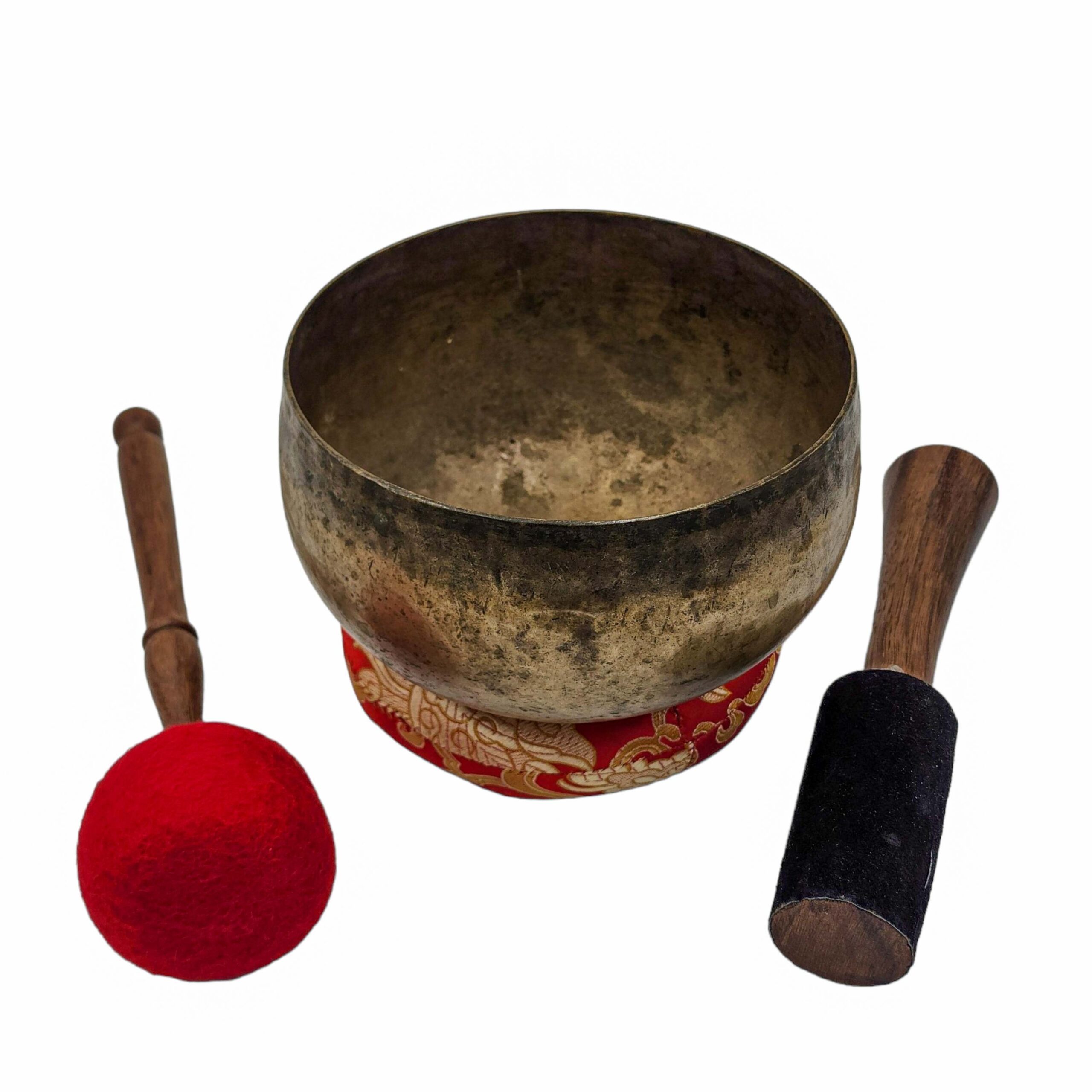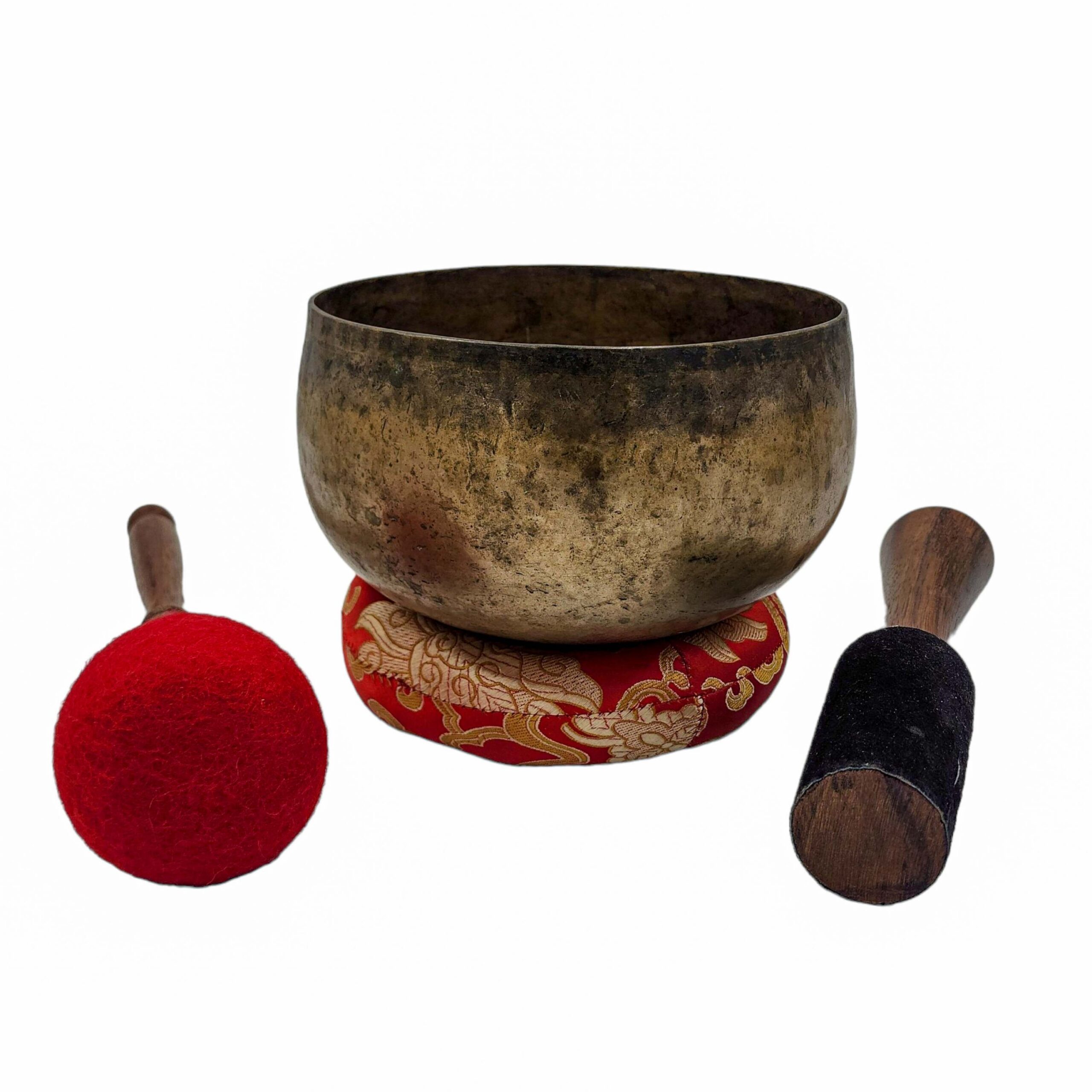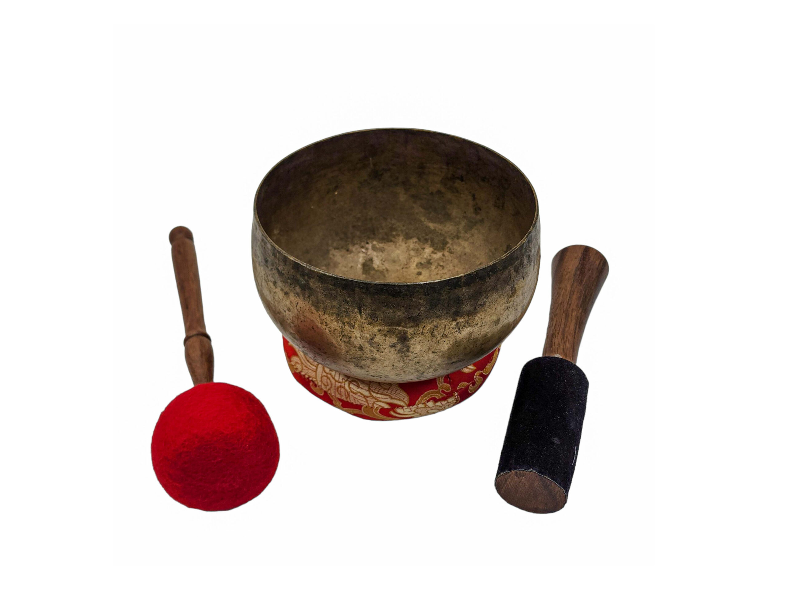 This bowl features an antique-style finish that beautifully highlights its traditional character. The natural patina and hand-finishing give it a timeless appearance while preserving the rich tones and resonance of the singing bowl.