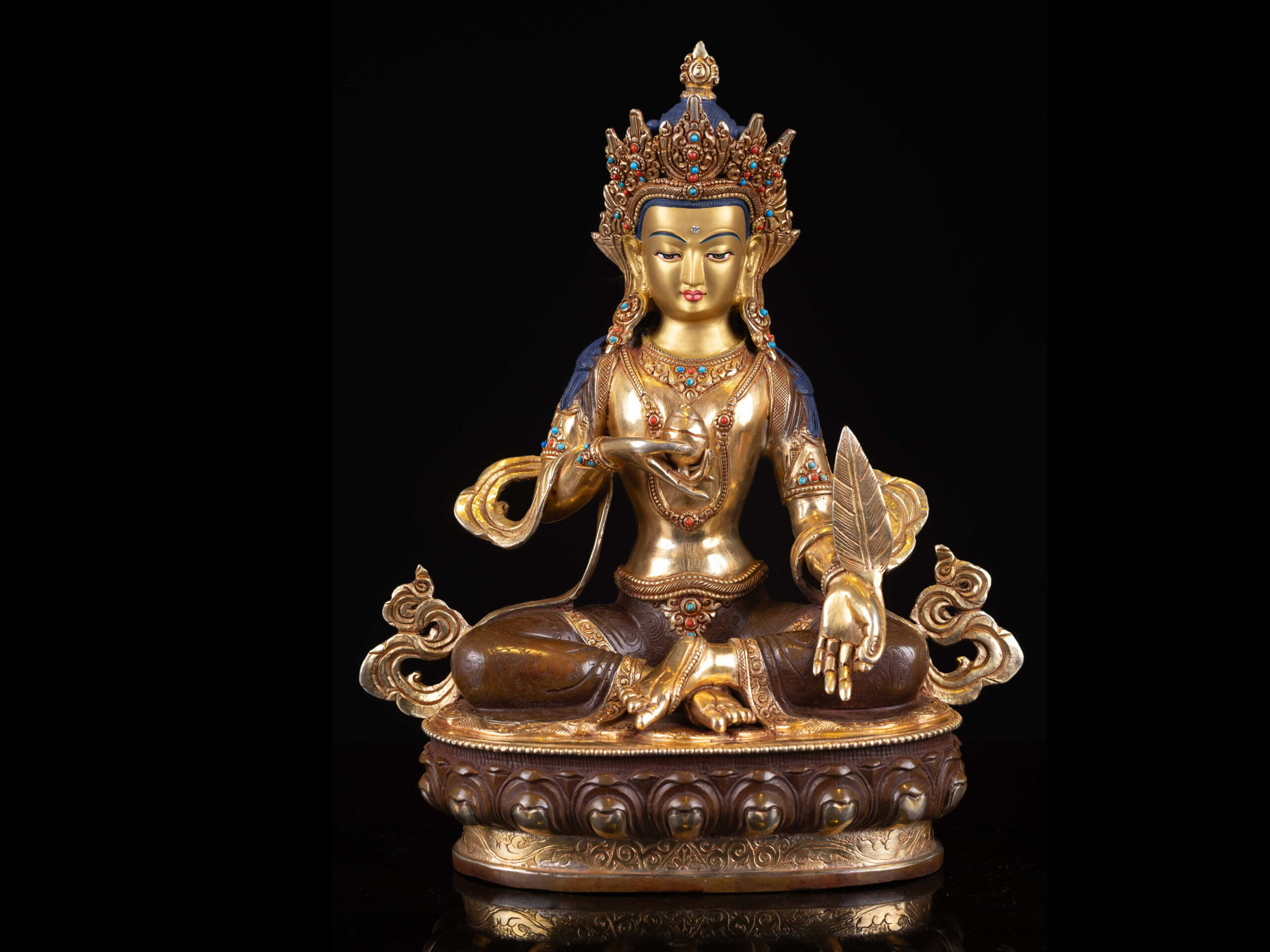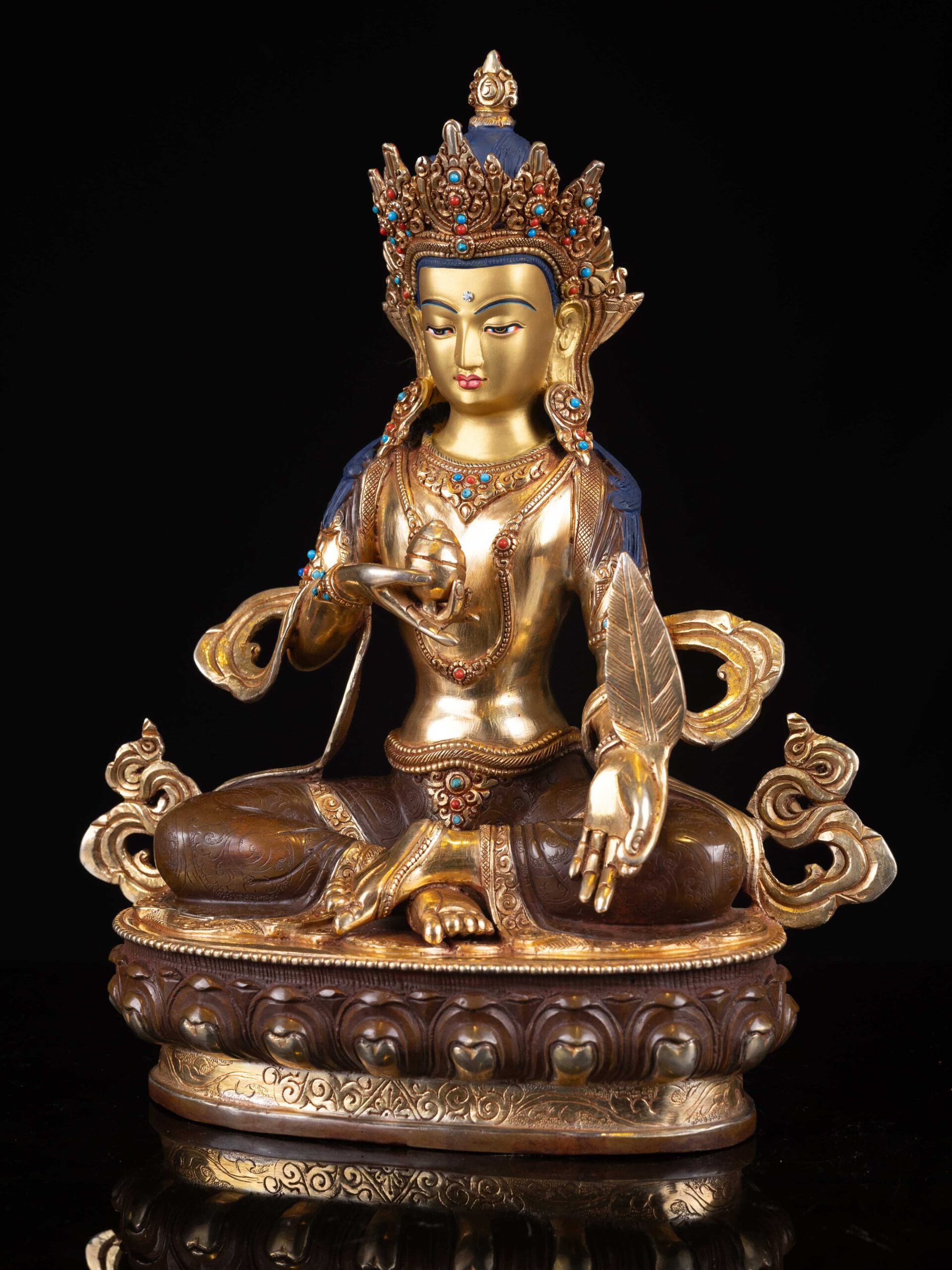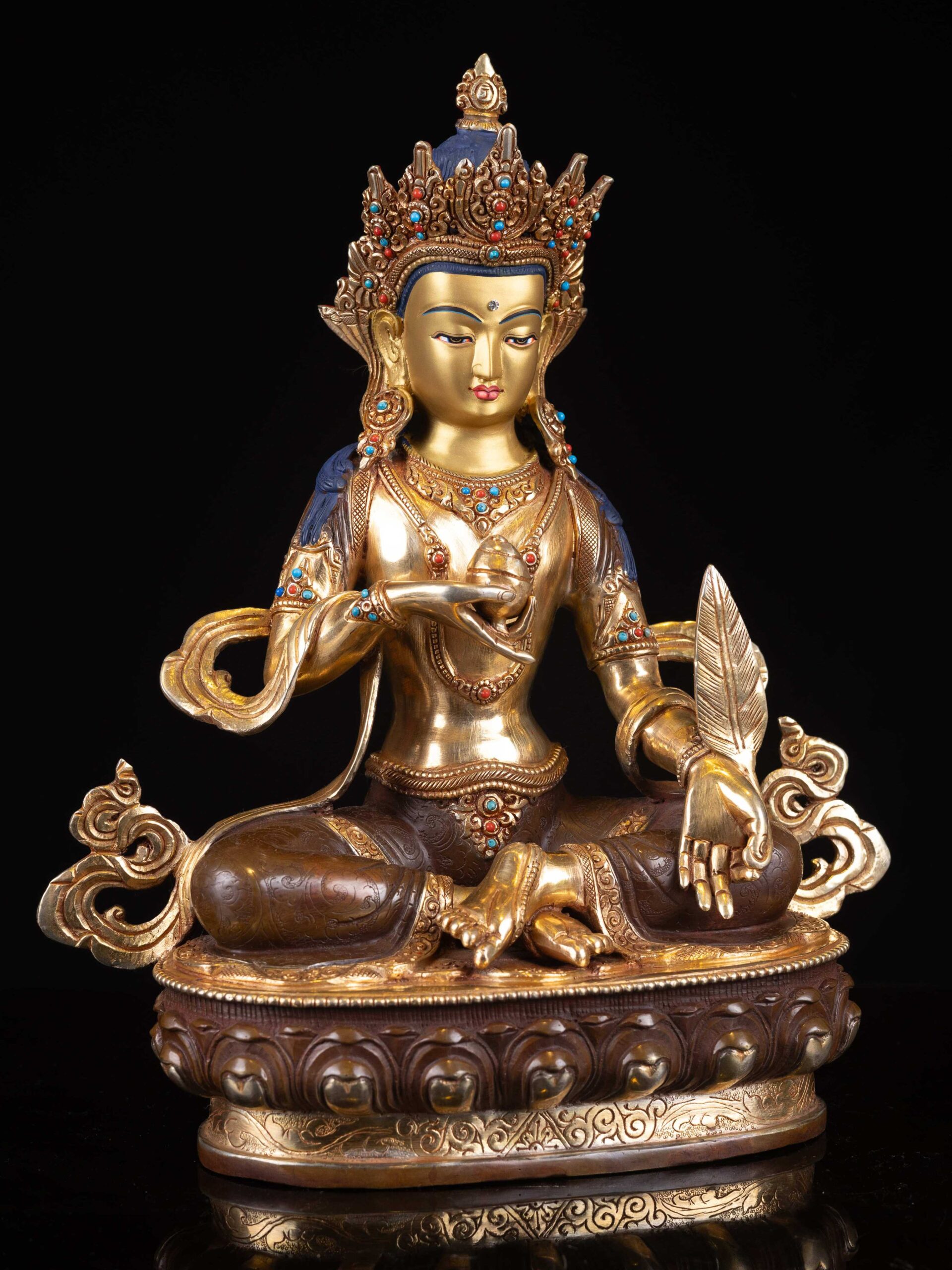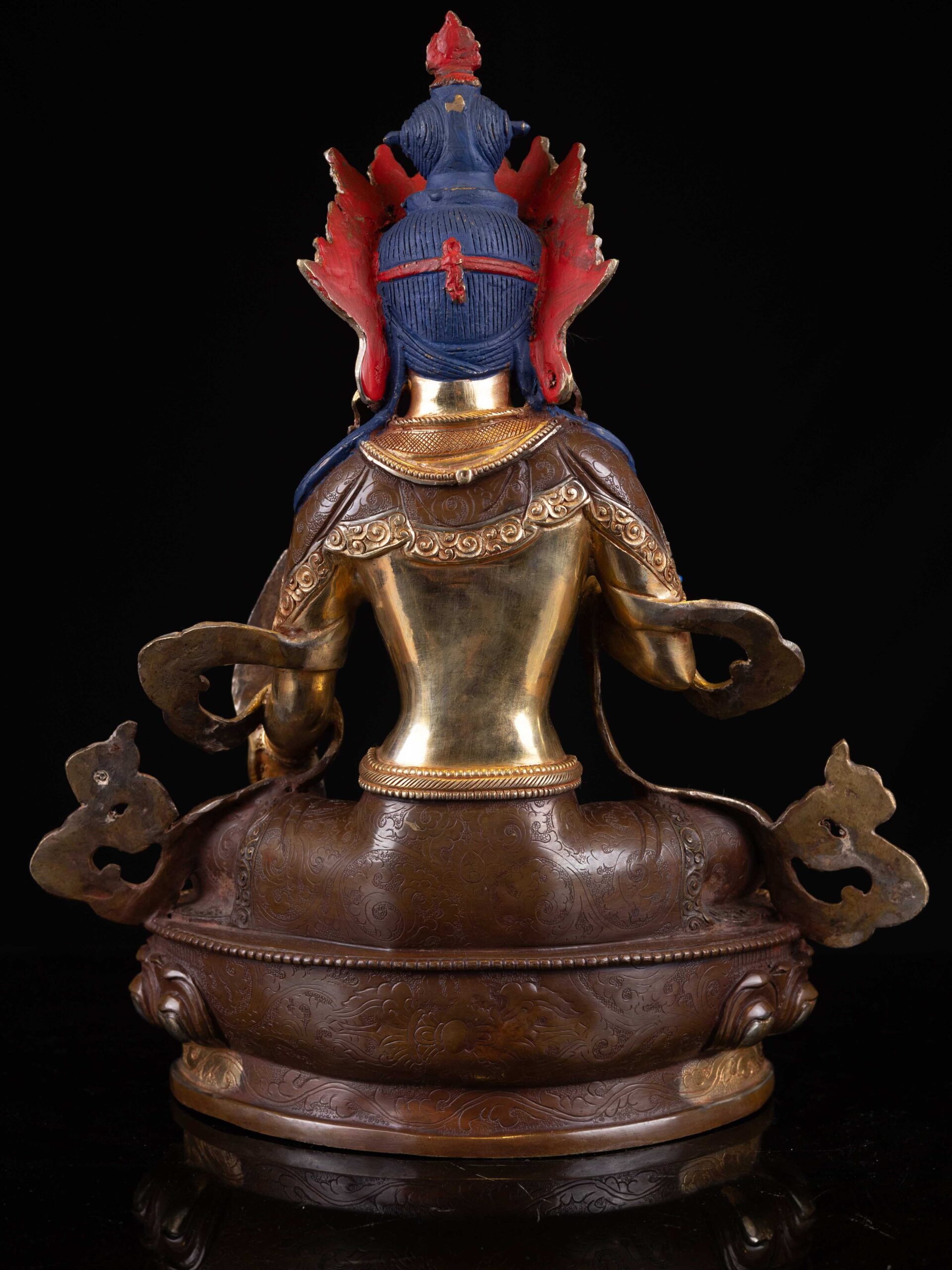 This statue features traditional fire gold plating, also known as mercury gold plating, ensuring authenticity, durability, and a radiant appearance. This time-honored technique, distinct from electroplating, reflects the cultural heritage and exceptional craftsmanship of Nepal, offering unmatched beauty and longevity.