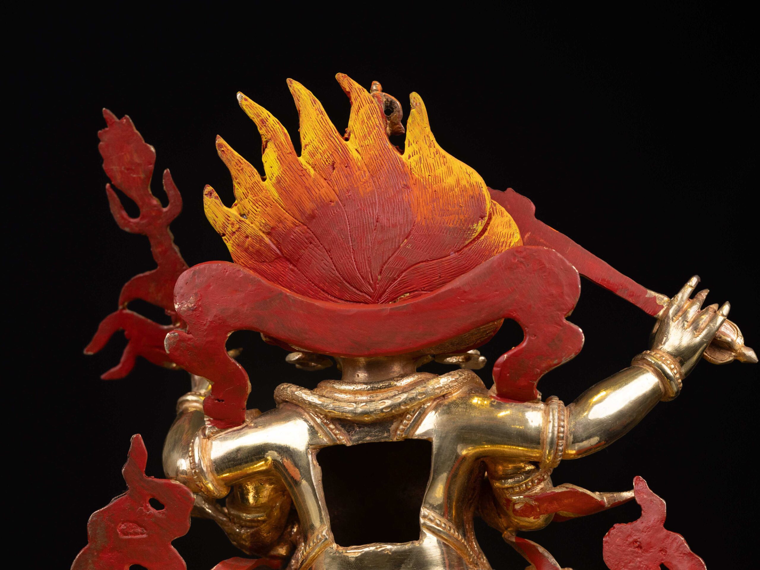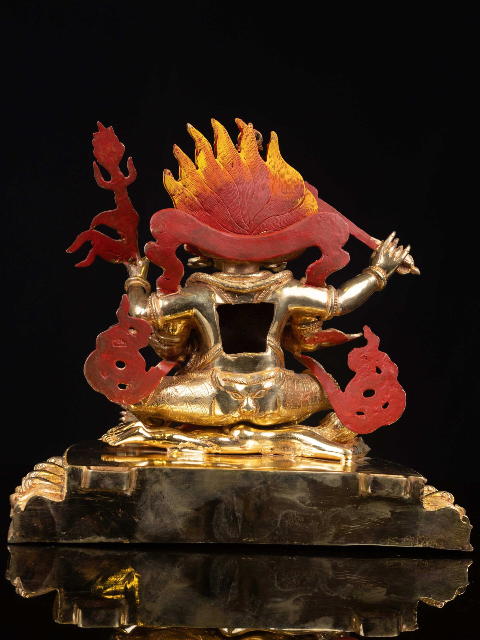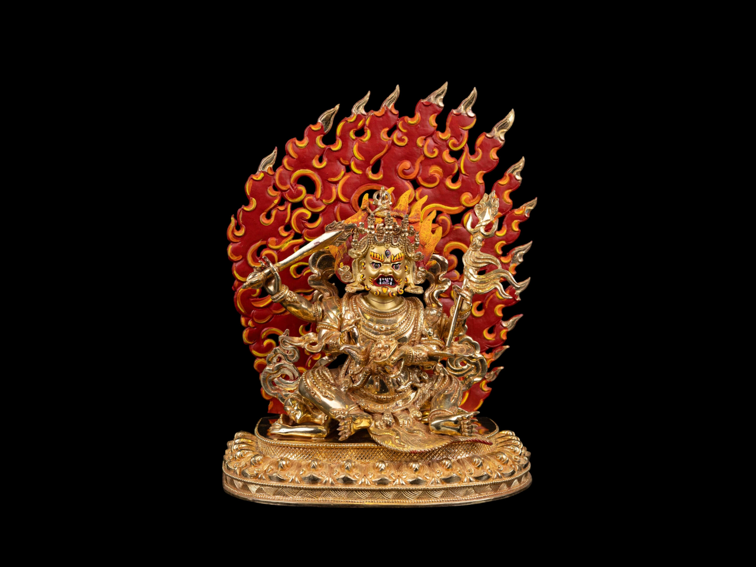 The face of Mahakala is hand-painted with gold, emphasizing its distinct features and expressions.