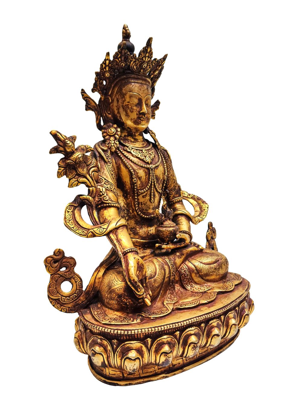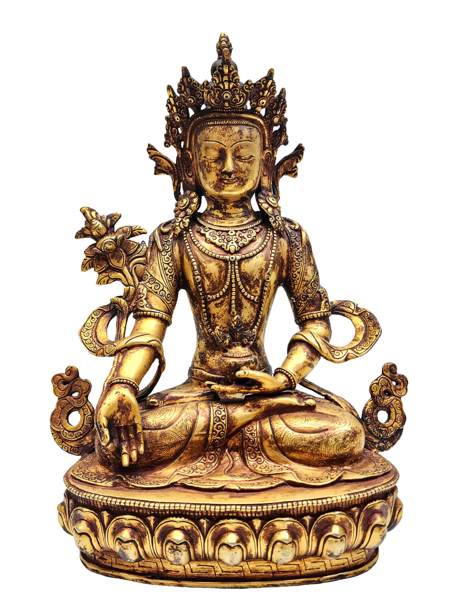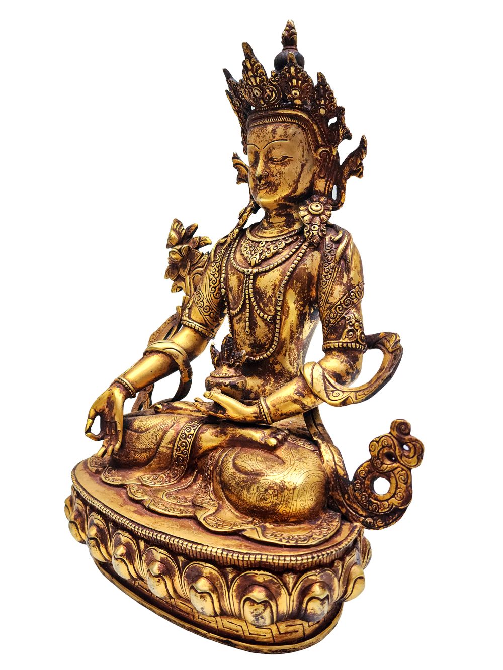 The statue is fully gold gilded using the ancient mercury fire gilding method, an authentic Nepali technique known for its durability, brilliance, and prestige. After gold application, an antique patina is layered, giving the surface a gracefully aged look, reminiscent of centuries-old devotional art. This fusion of gold brilliance and antique finish brings out a warm, time-worn glow that speaks of sacred age and timelessness.