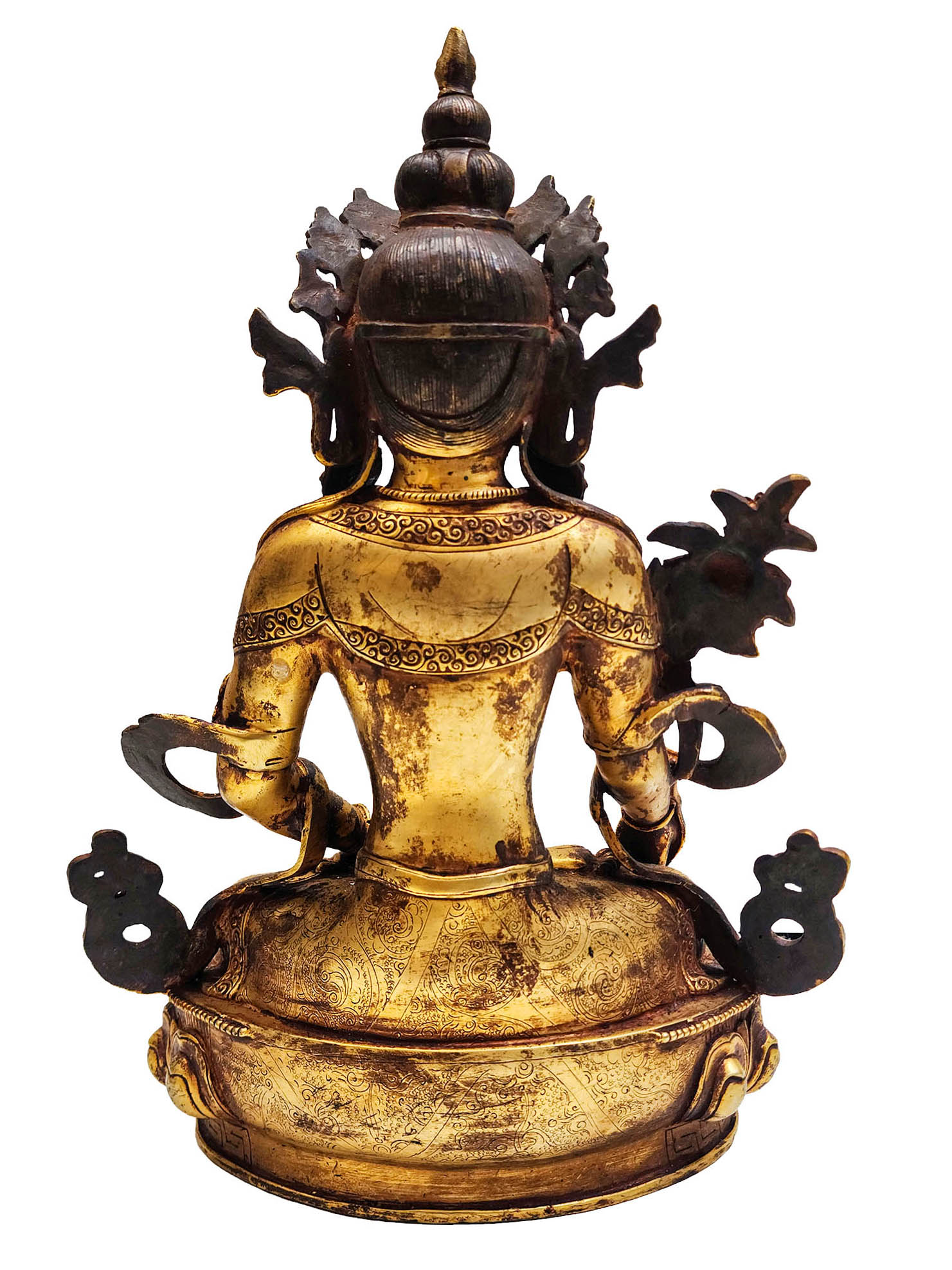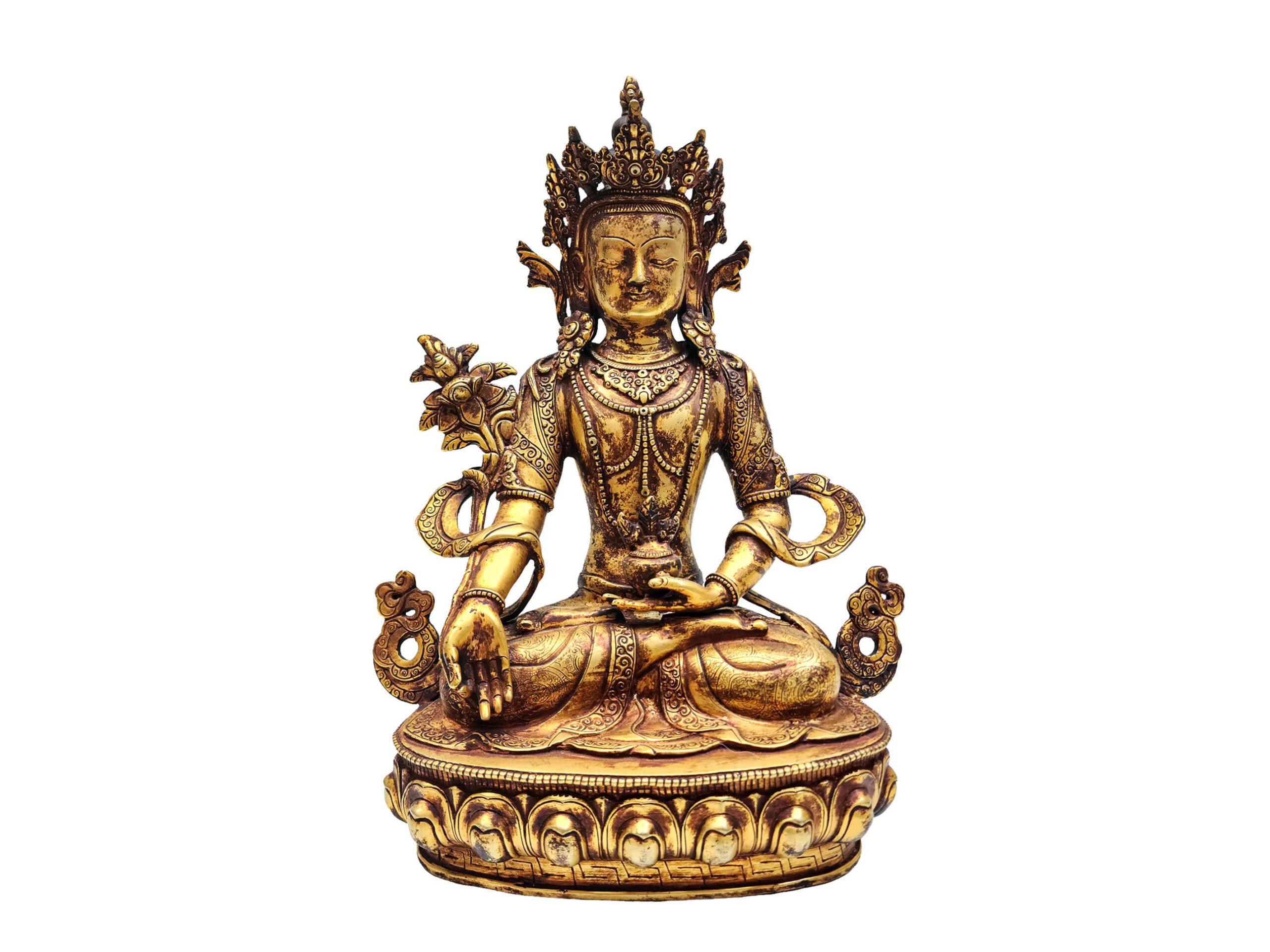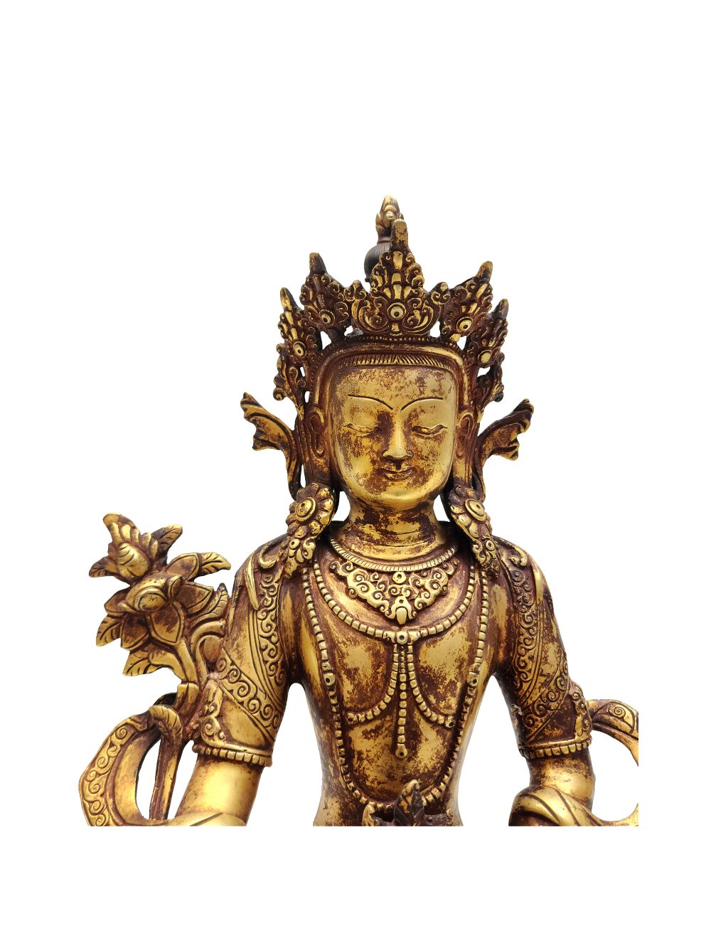 The statue is fully gold gilded using the ancient mercury fire gilding method, an authentic Nepali technique known for its durability, brilliance, and prestige. After gold application, an antique patina is layered, giving the surface a gracefully aged look, reminiscent of centuries-old devotional art. This fusion of gold brilliance and antique finish brings out a warm, time-worn glow that speaks of sacred age and timelessness.