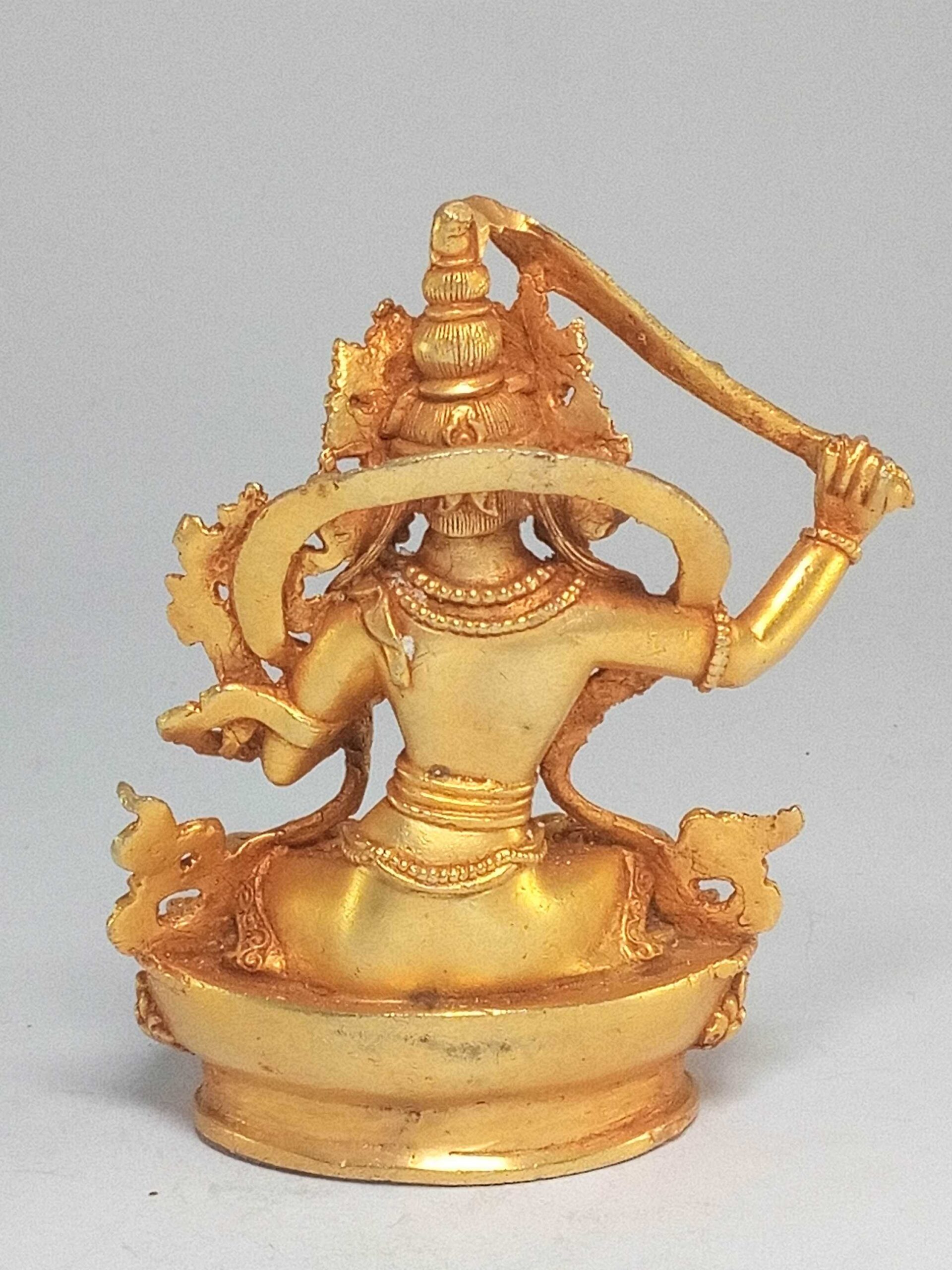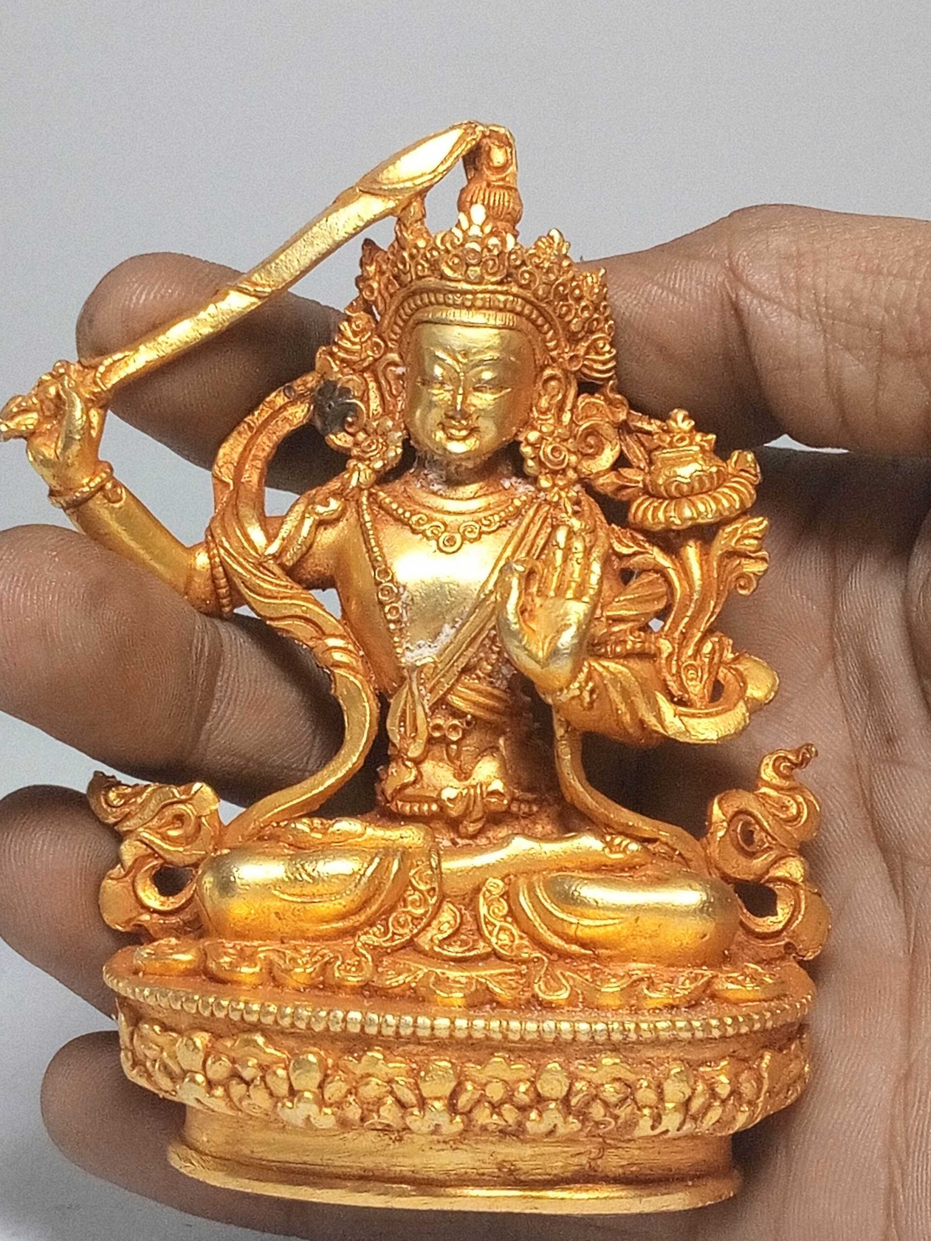 This handcrafted Manjushri statue showcases the exceptional craftsmanship of Nepali artisans. Its full gold plating and attention to detail make it a treasured piece of Buddhist art. Perfect for collectors, spiritual practitioners, or anyone seeking wisdom and clarity in their spiritual journey.