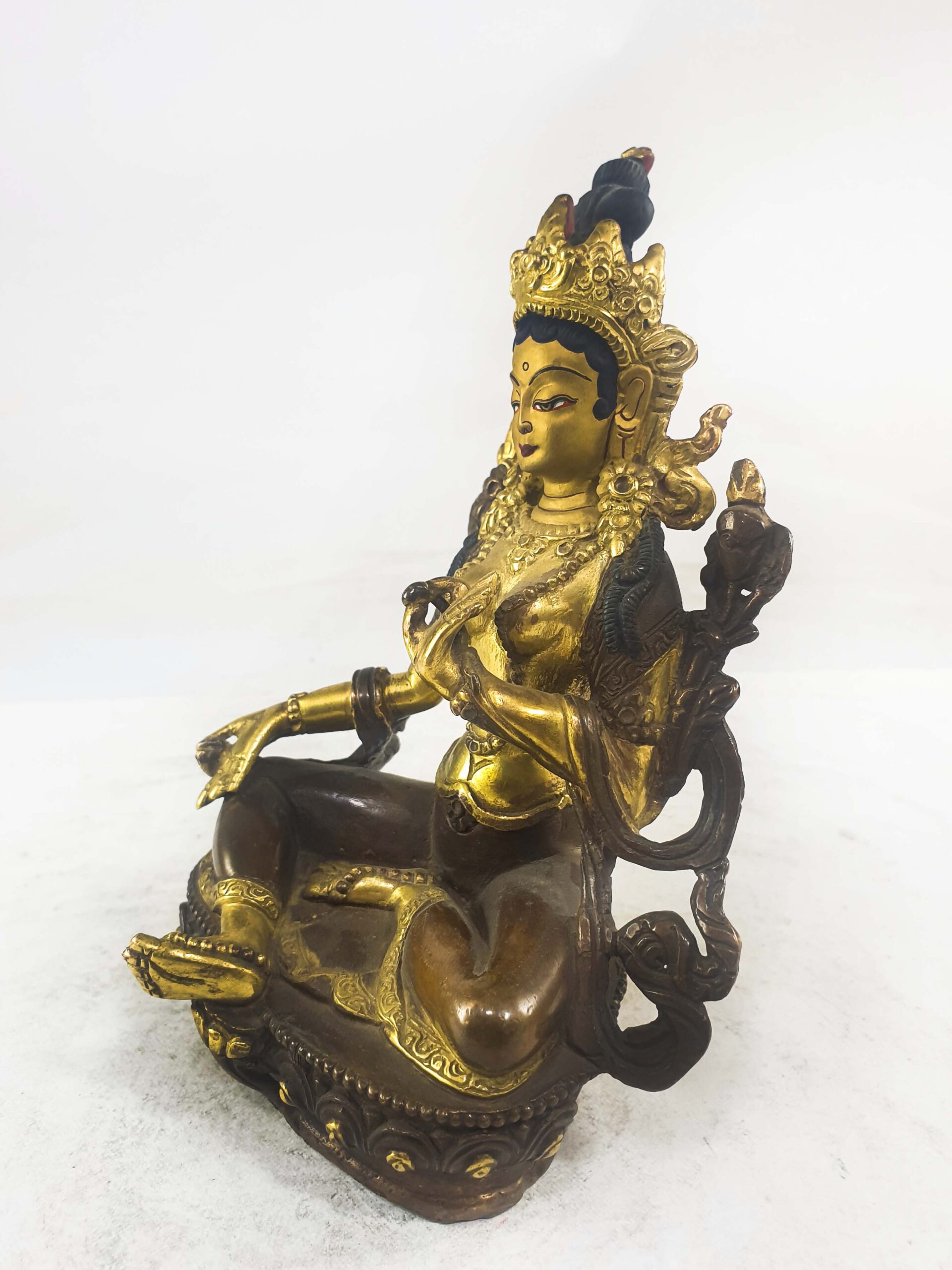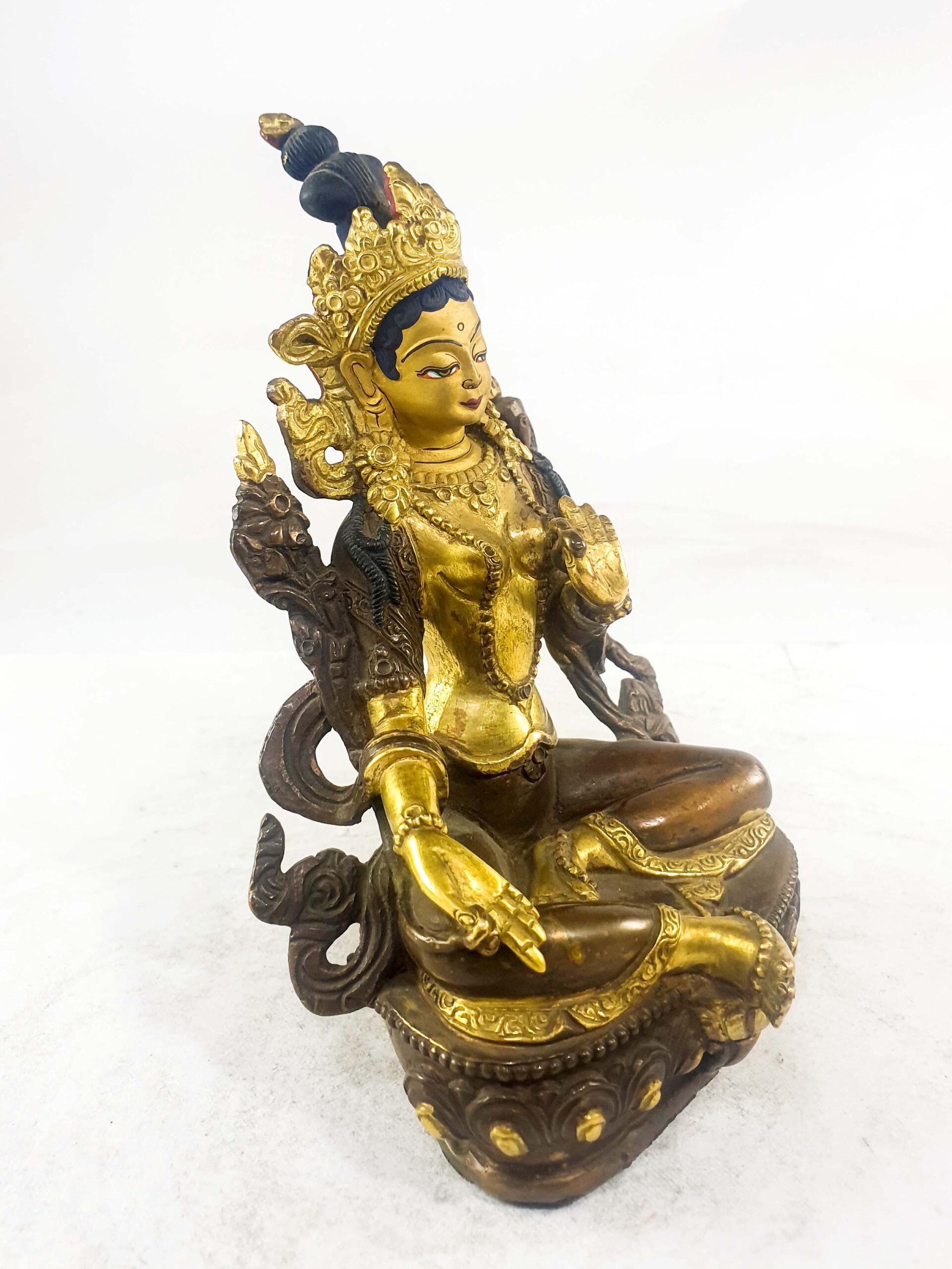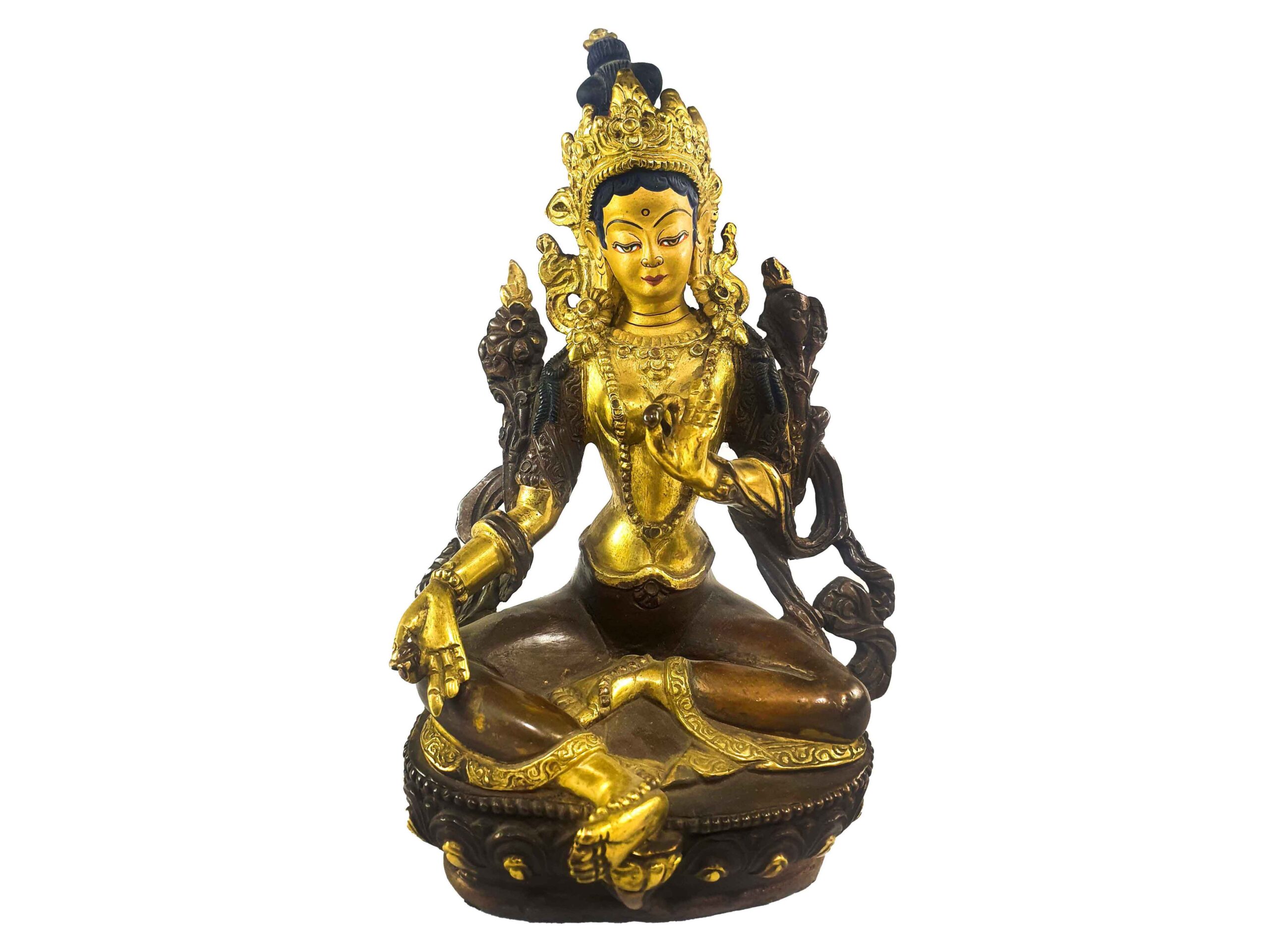 This Green Tara statue features partial fire gold plating, a revered technique in Nepali metalwork. Artisans carefully apply a resist mask to specific areas, ensuring only selected surfaces receive the gold layer. Through intense heat and pressure, the gold fuses beautifully onto the exposed metal, resulting in a radiant yet intricate finish.
