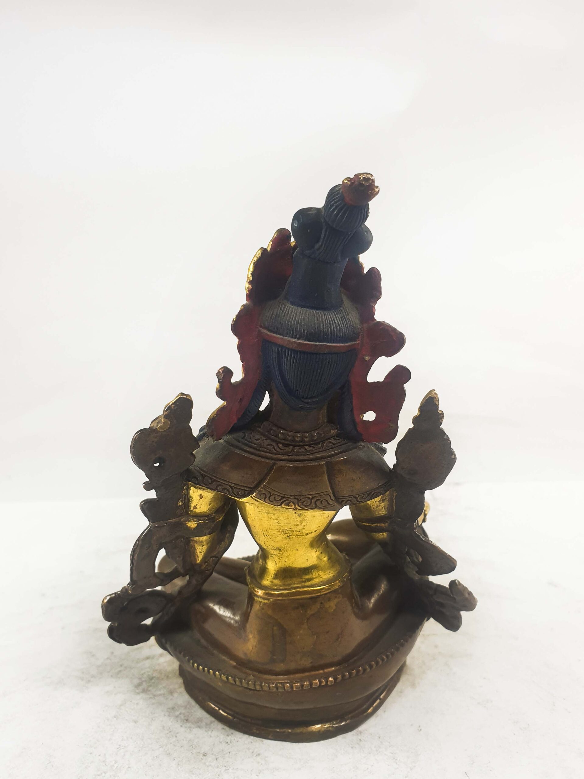 The face of Green Tara is painted with gold, emphasizing the statue’s most expressive features—the eyes and lips. This technique brings out lifelike details that metal alone cannot capture, enhancing the statue’s sacred presence.