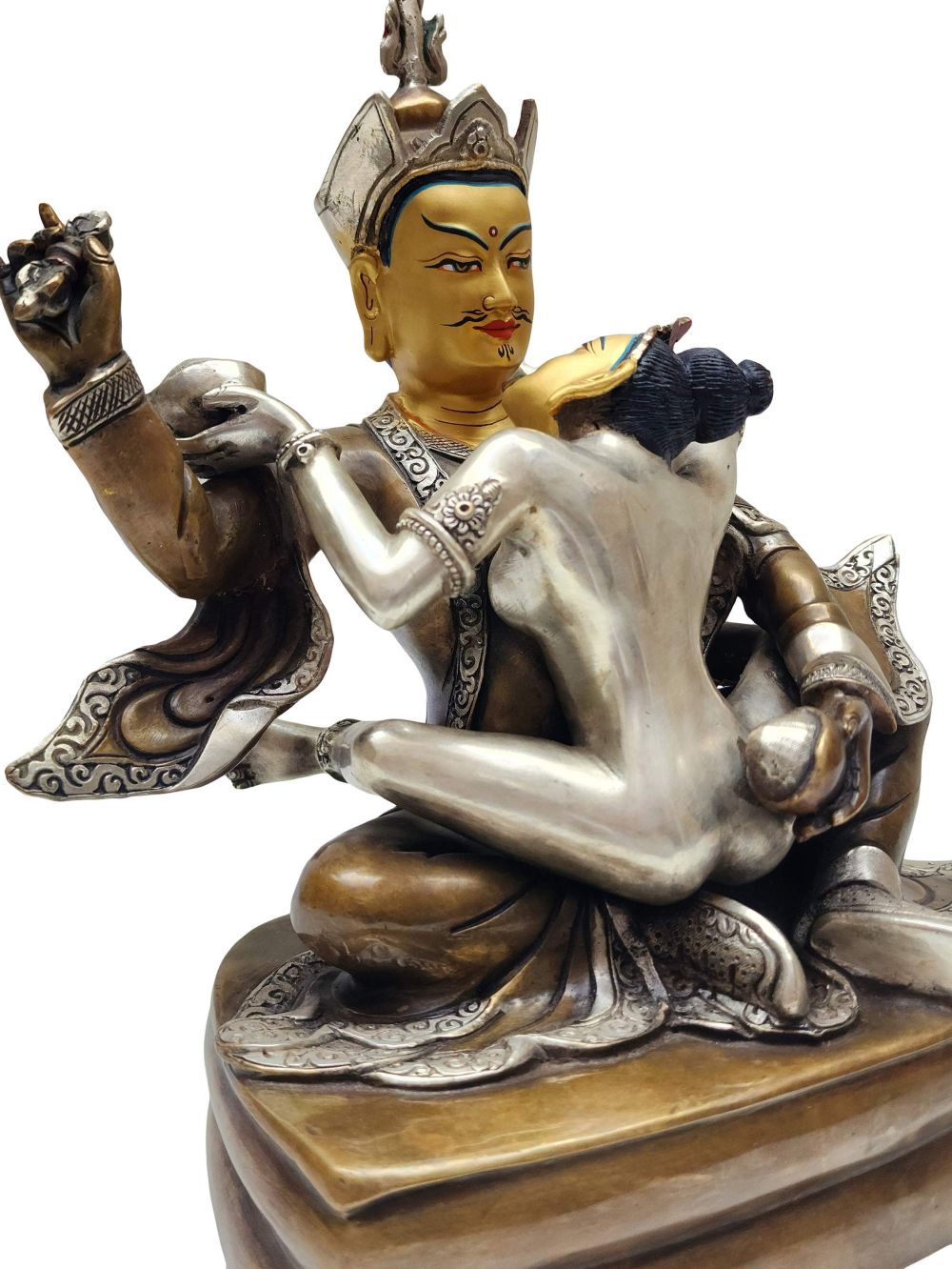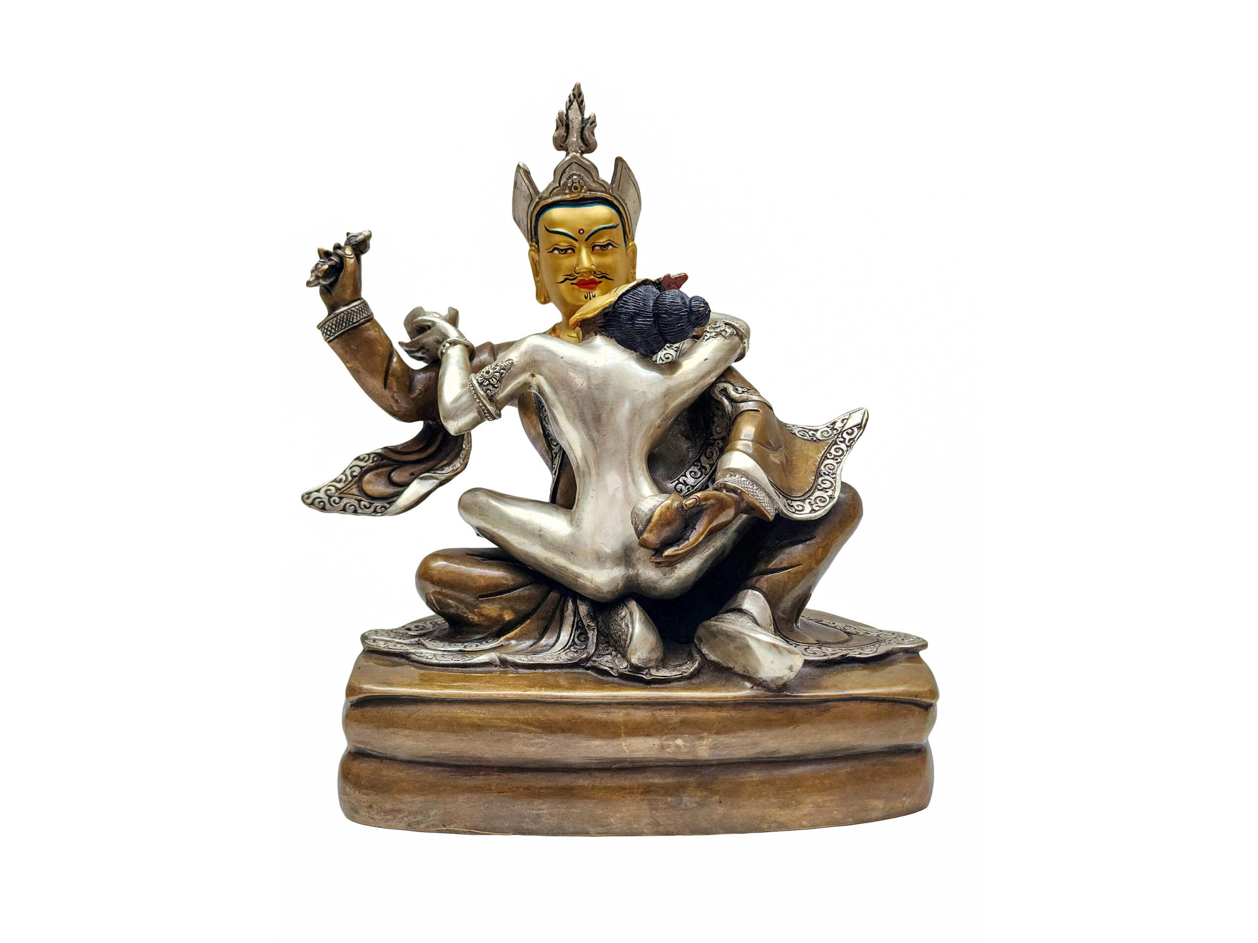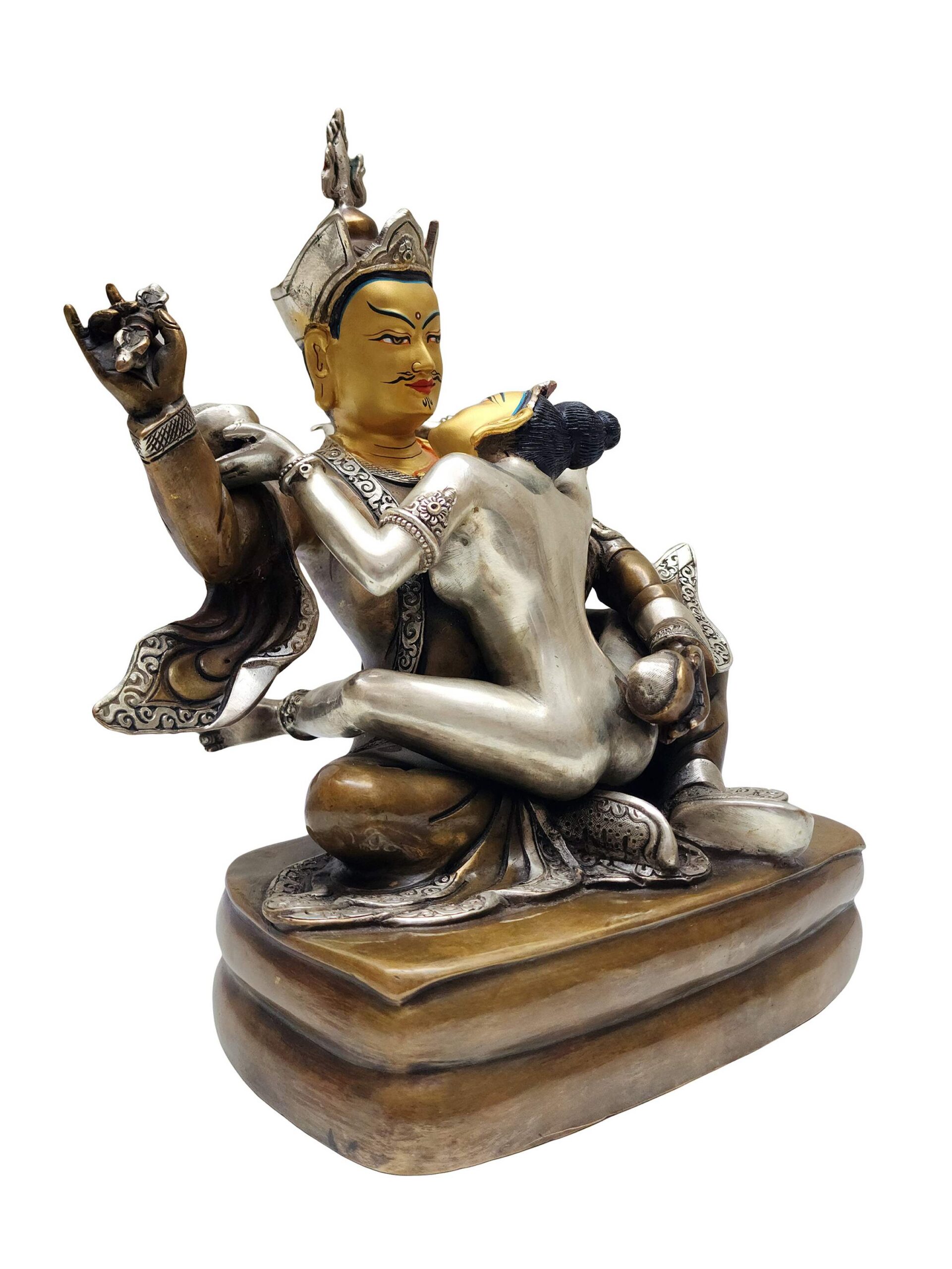 Depicted here with Shakti, this sculpture symbolizes the union of compassion and wisdom, method and insight, reflecting the non-dualistic essence of tantric Buddhist teachings. His serene yet commanding expression, posture, and iconography reflect his enlightened activity in all realms.