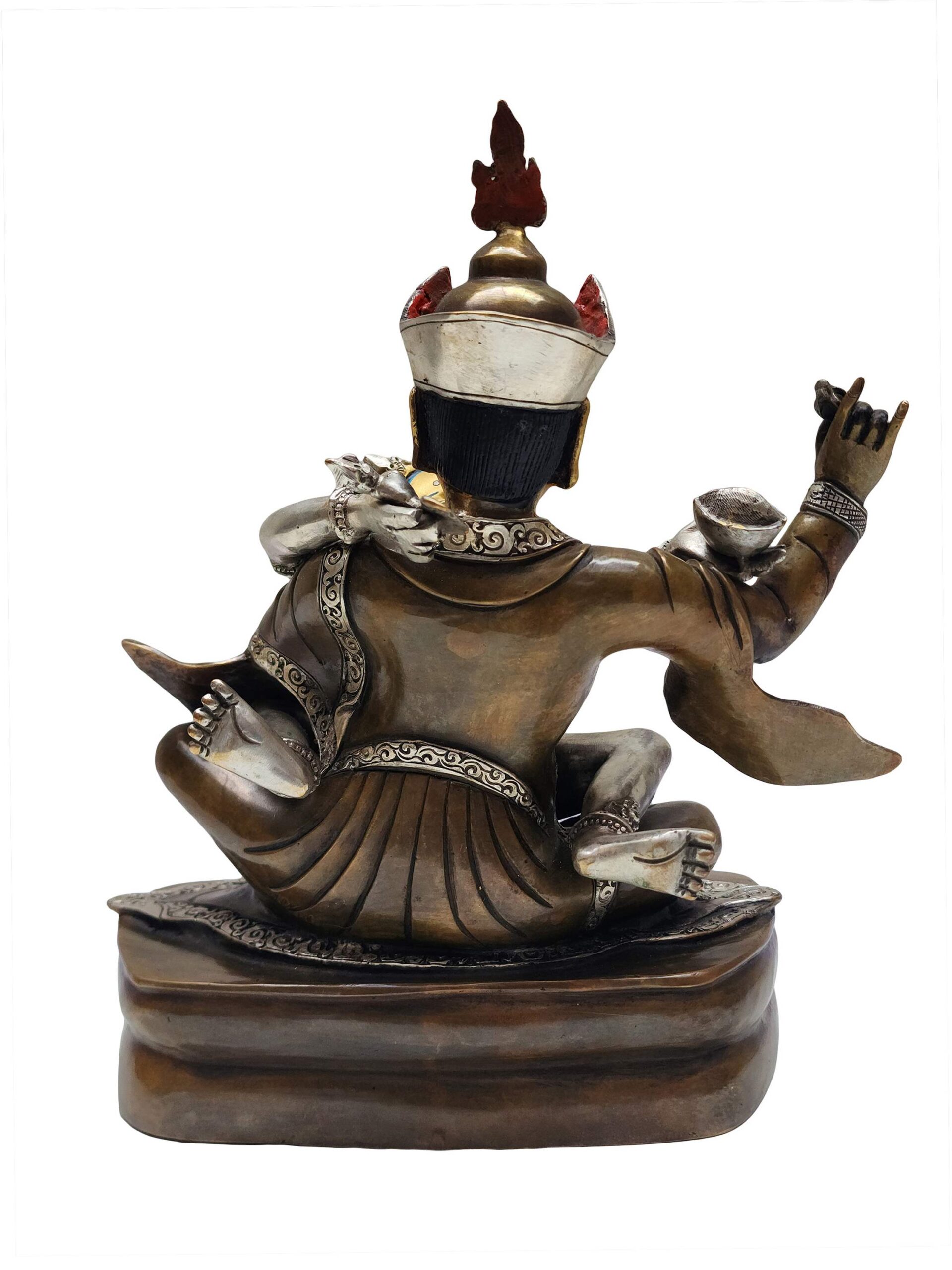 This Padmasambhava statue features an elegant dual-tone finish—partly silver-plated and chocolate oxidized. This specialized process enhances both visual beauty and symbolic depth: