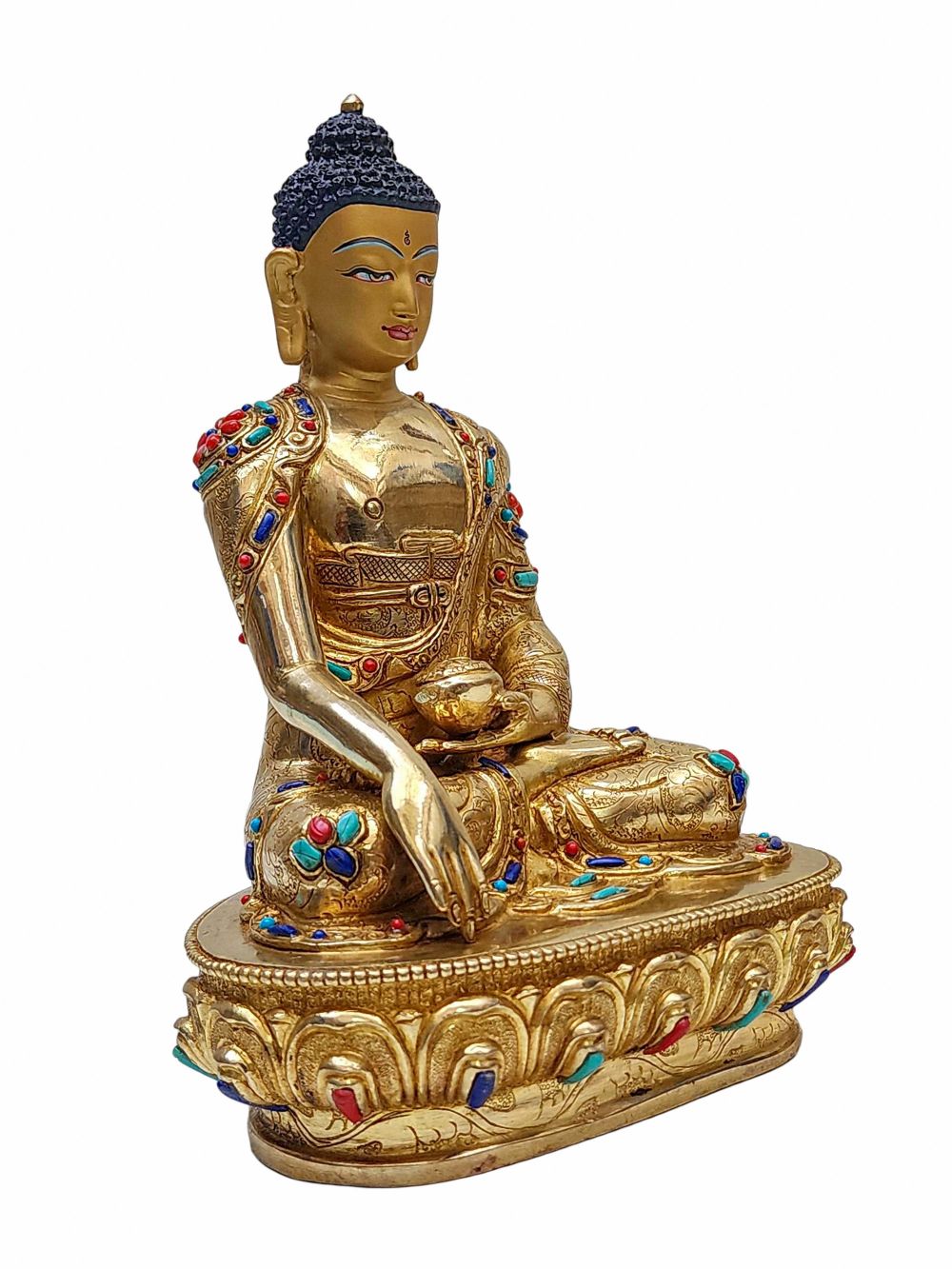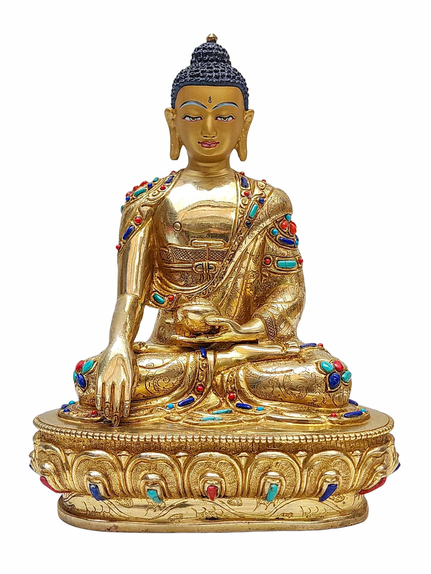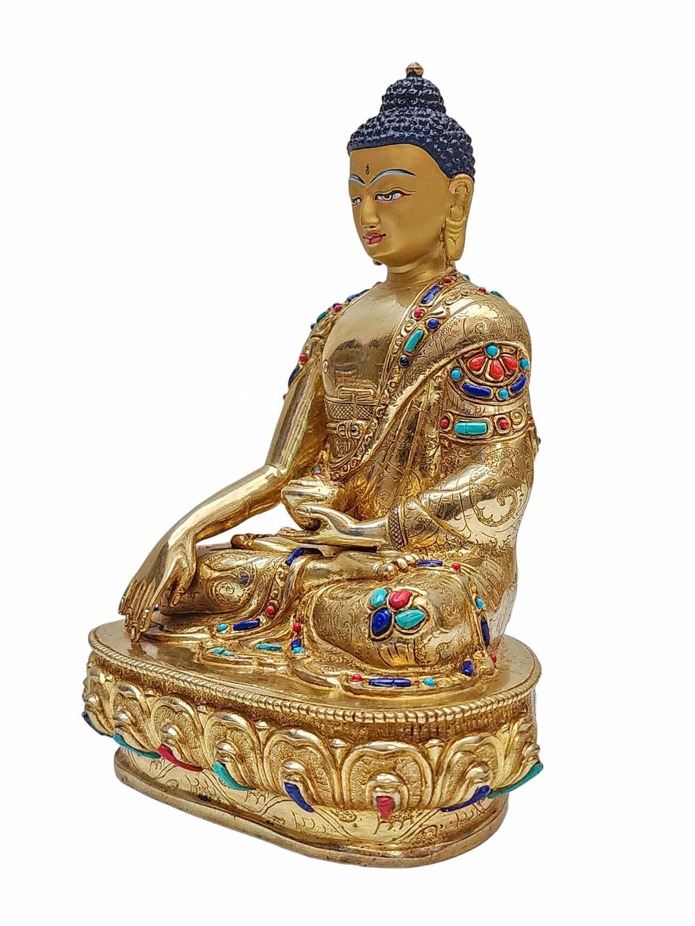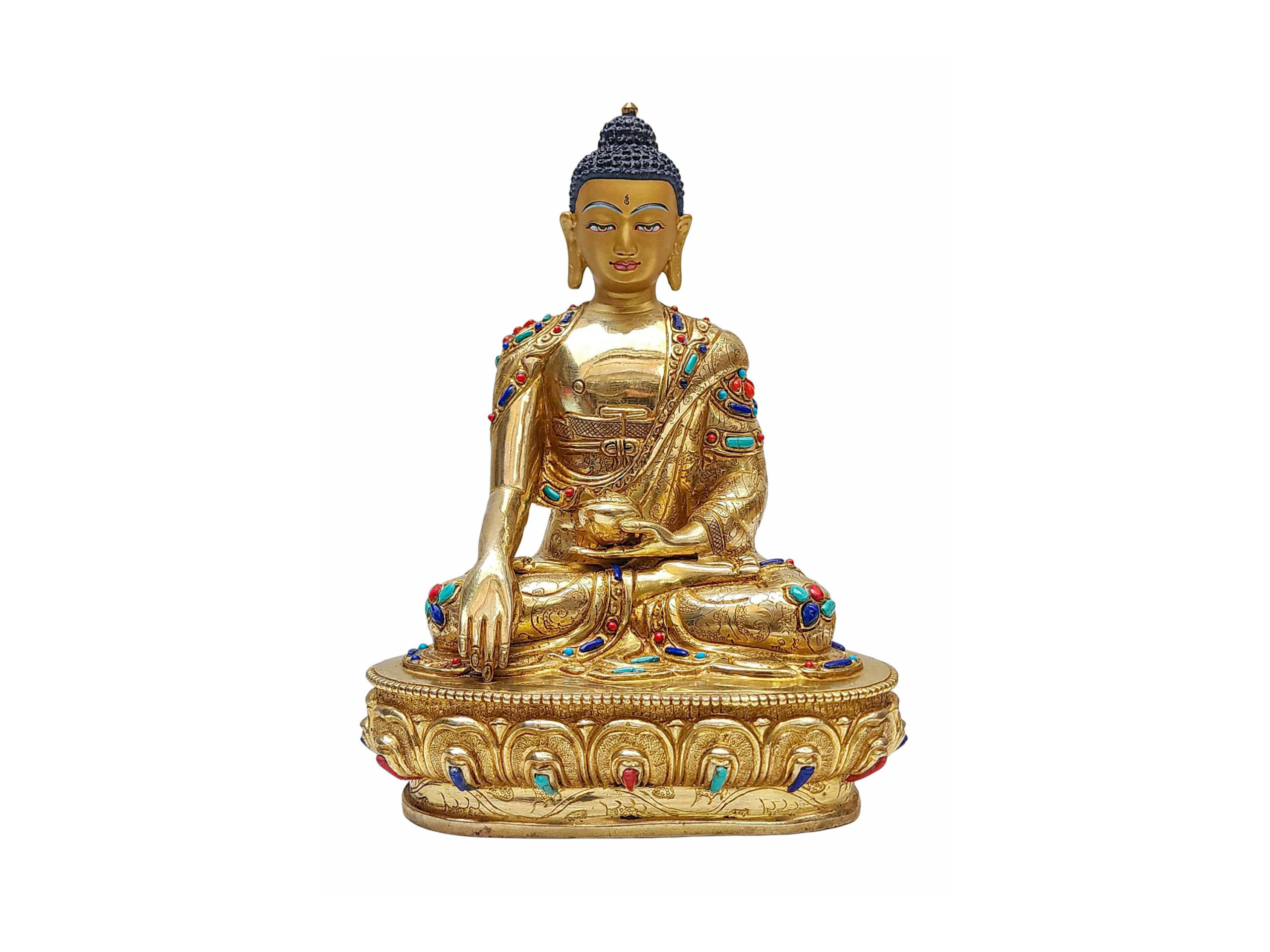 Shakyamuni Buddha Statue – Handmade Copper Sculpture with Full Gold Plating, Stone Inlay, and Gold-Painted Face