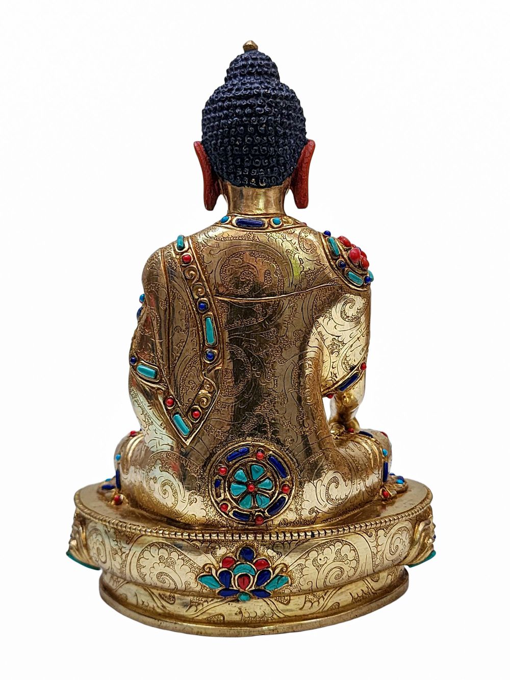 The statue is adorned with an intricate inlay of semi-precious stones including turquoise, coral, and lapis lazuli. These stones are carefully embedded onto the statue’s surface using high-quality adhesive, adding vibrant color and spiritual symbolism. The natural textures and hues enhance the statue’s visual depth and presence, making it ideal as a centerpiece in any sacred or decorative space.