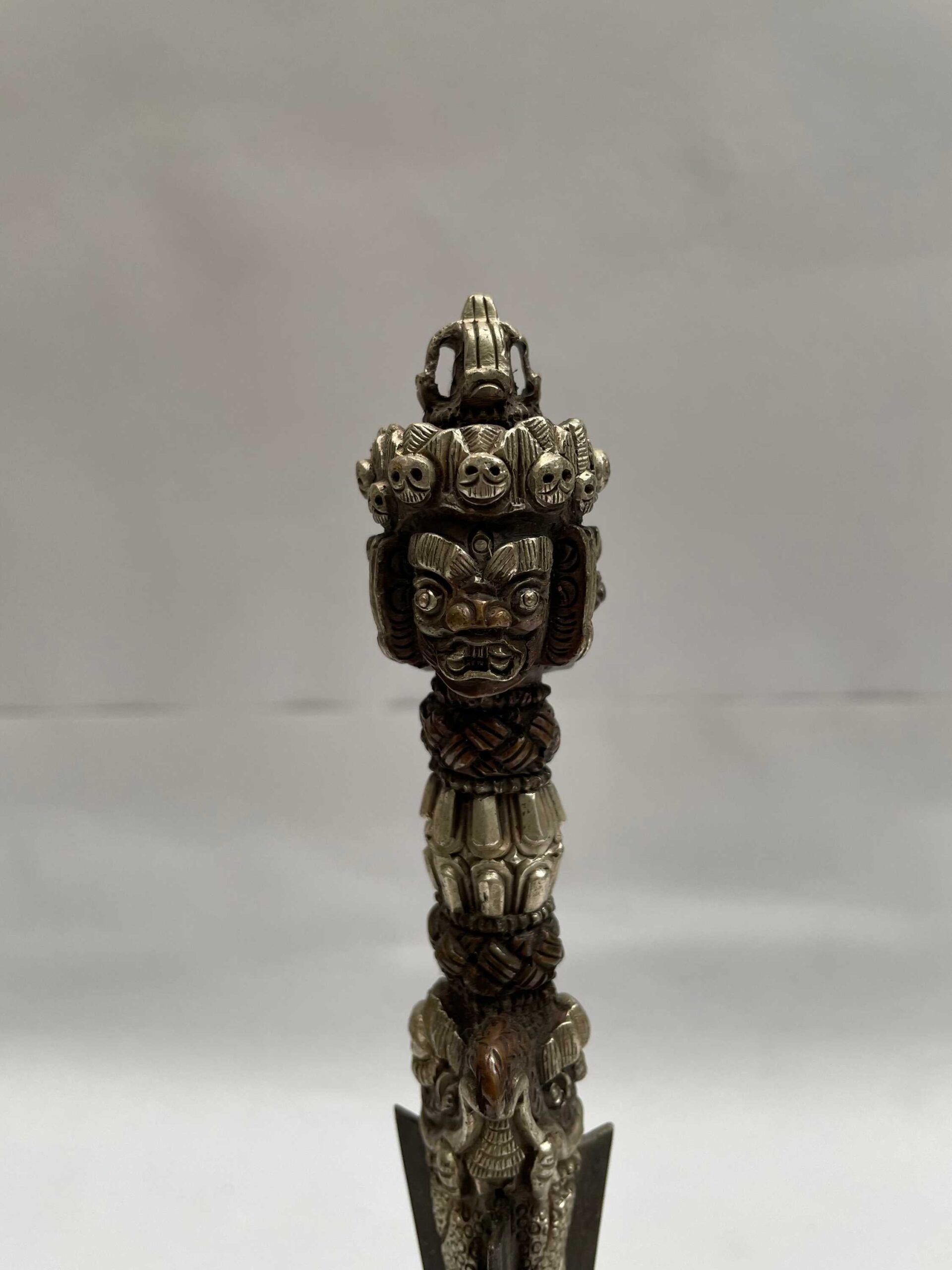 This Phurba showcases a striking combination of partly silver-plated and chocolate oxidized finishes.