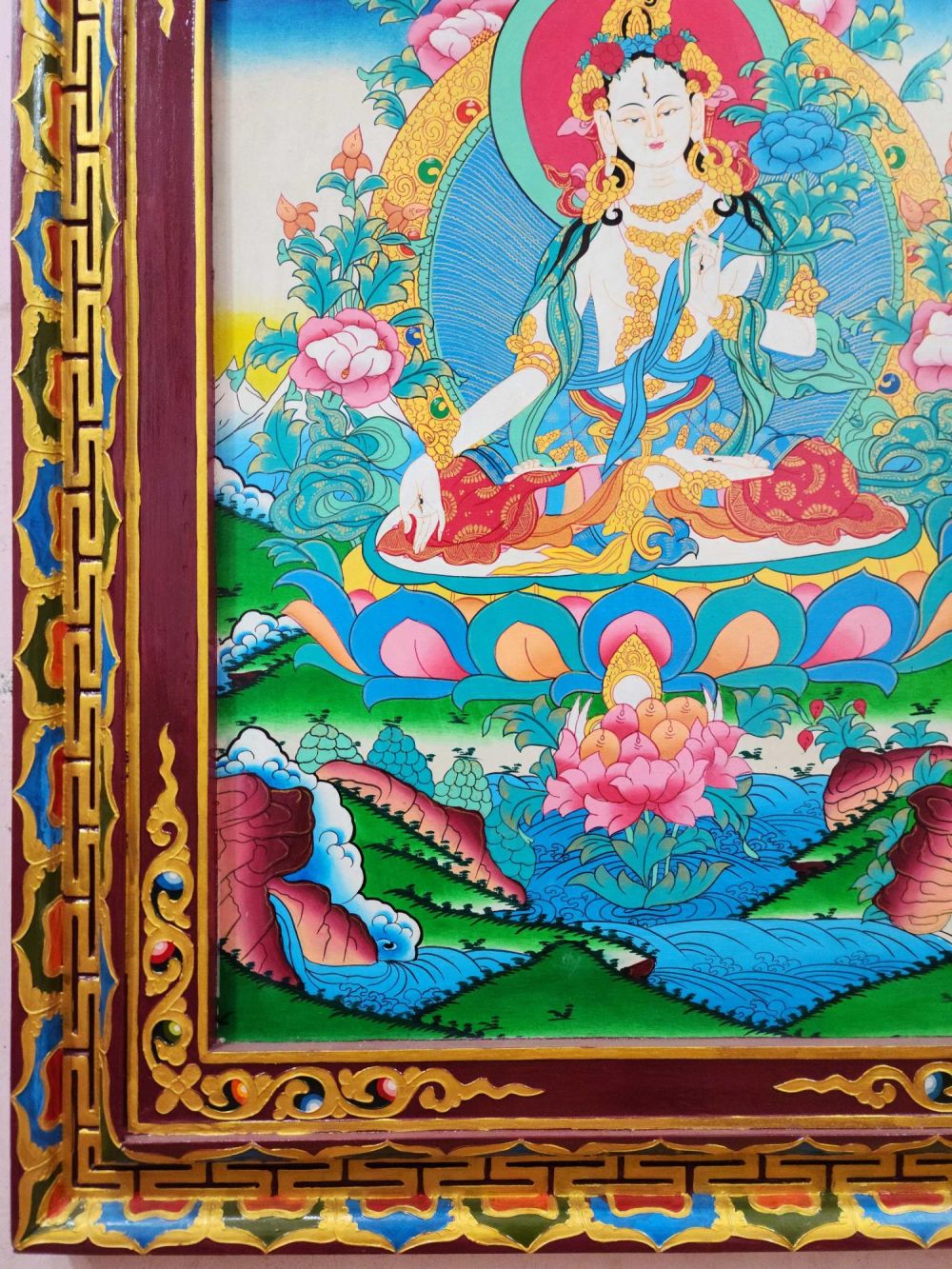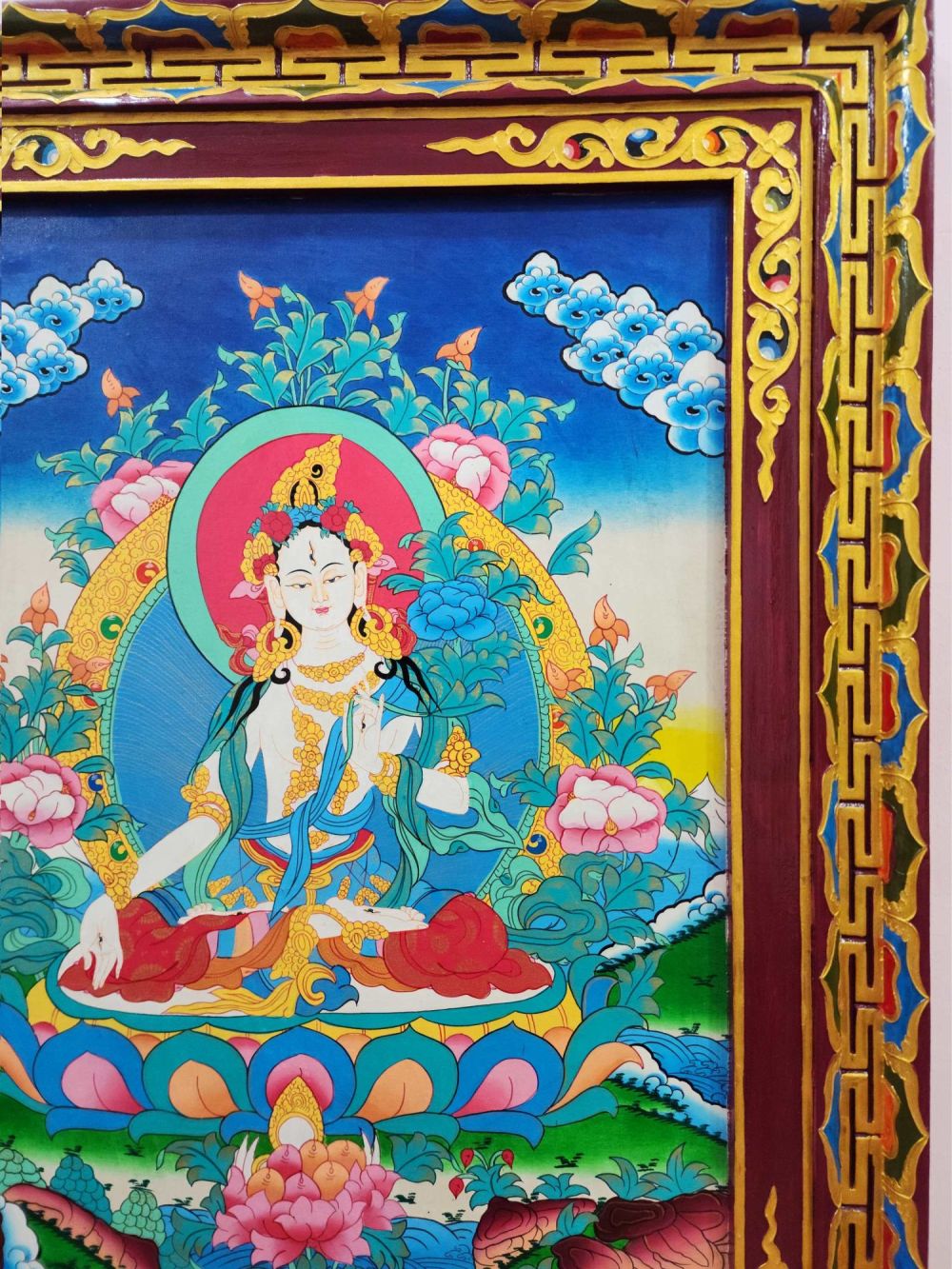 Traditional Tibetan Ritual Wall Hanging – White Tara Thangka on Wooden Frame
