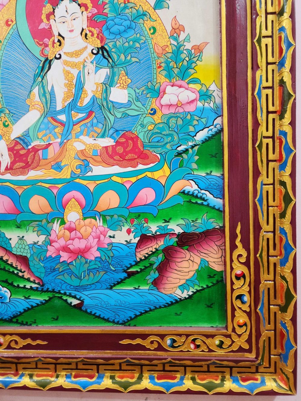 This piece is not a traditional textile scroll, but a mounted thangka set on a beautifully crafted wooden frame, making it perfect for direct wall installation in: