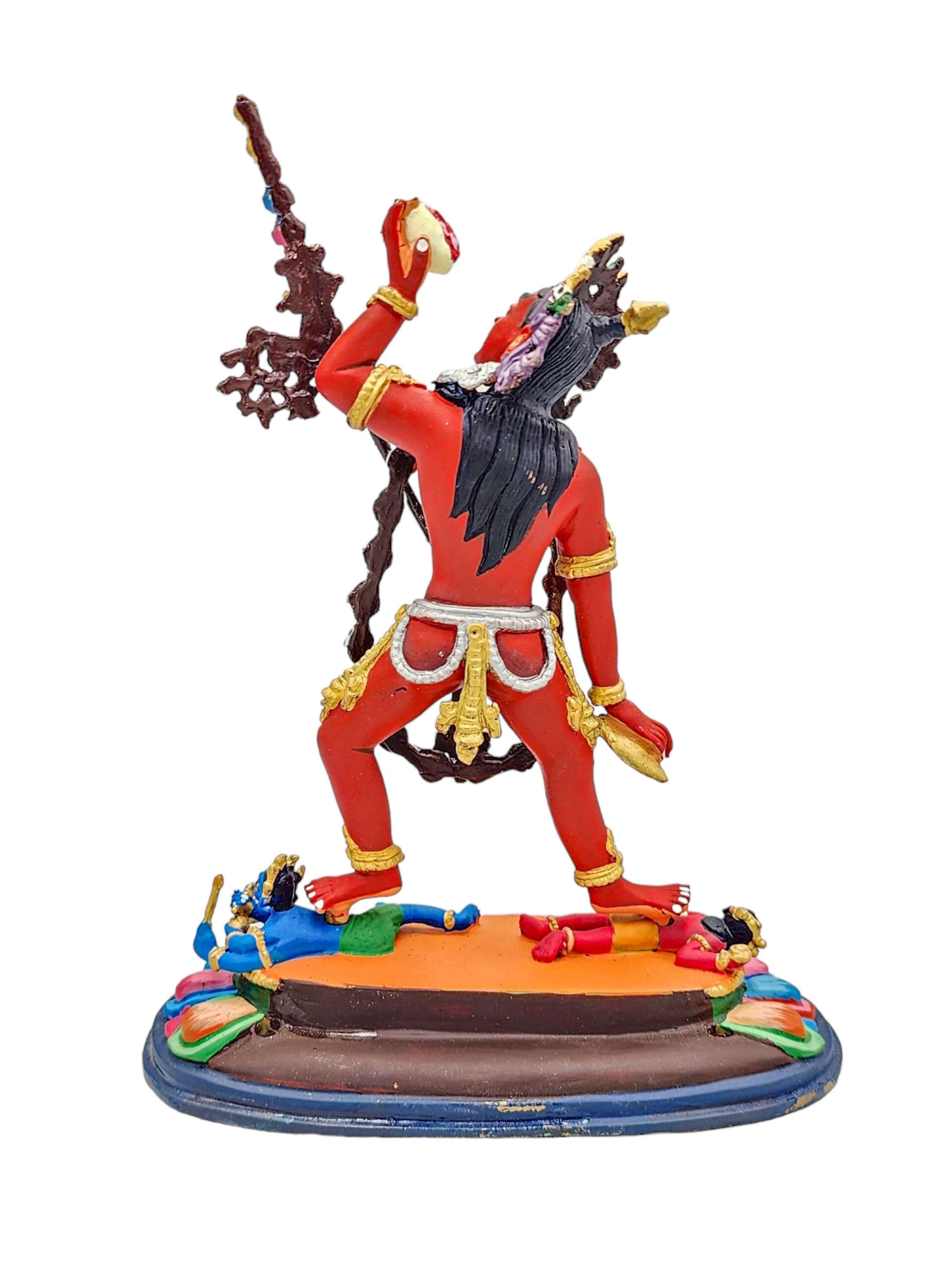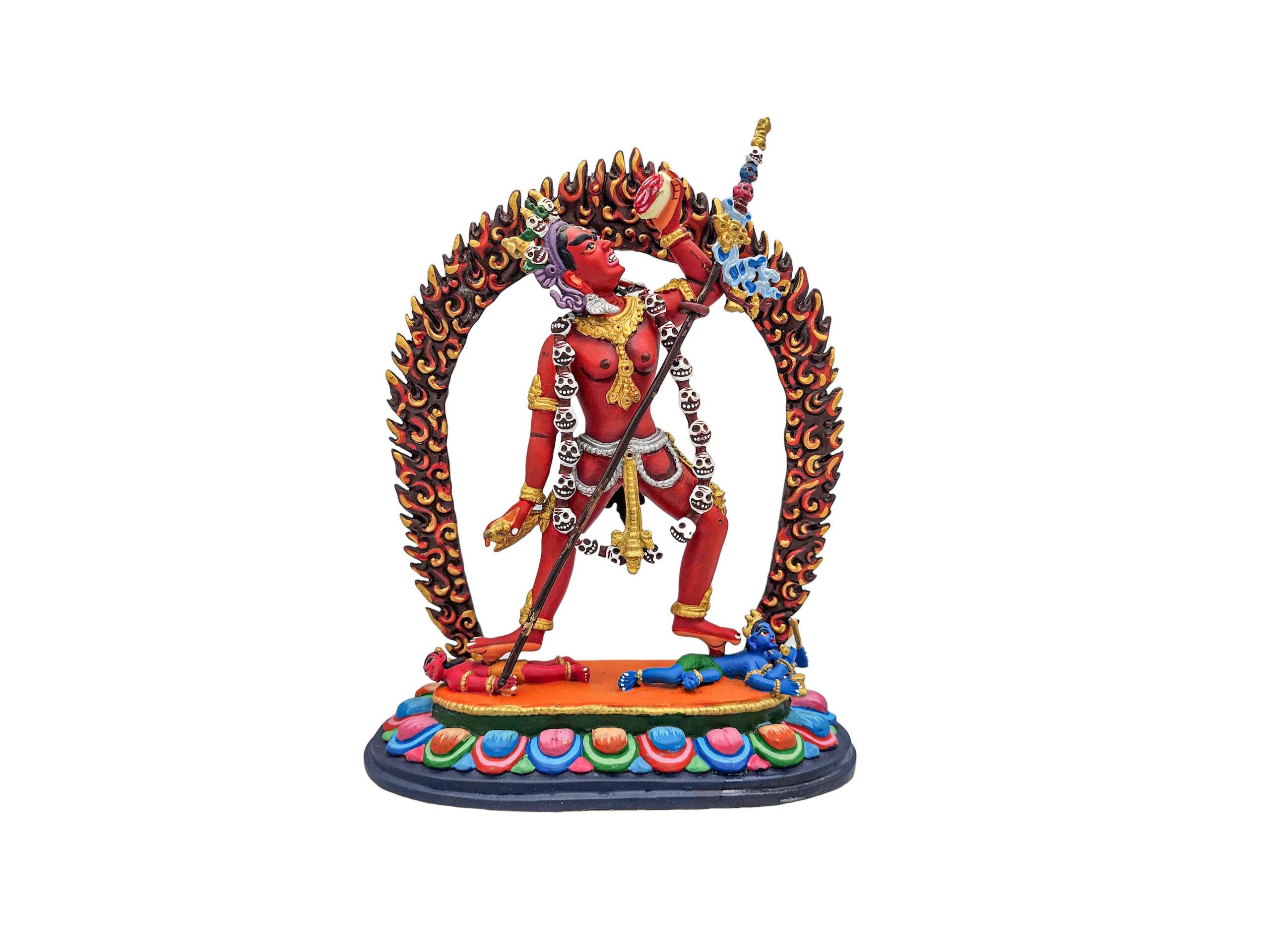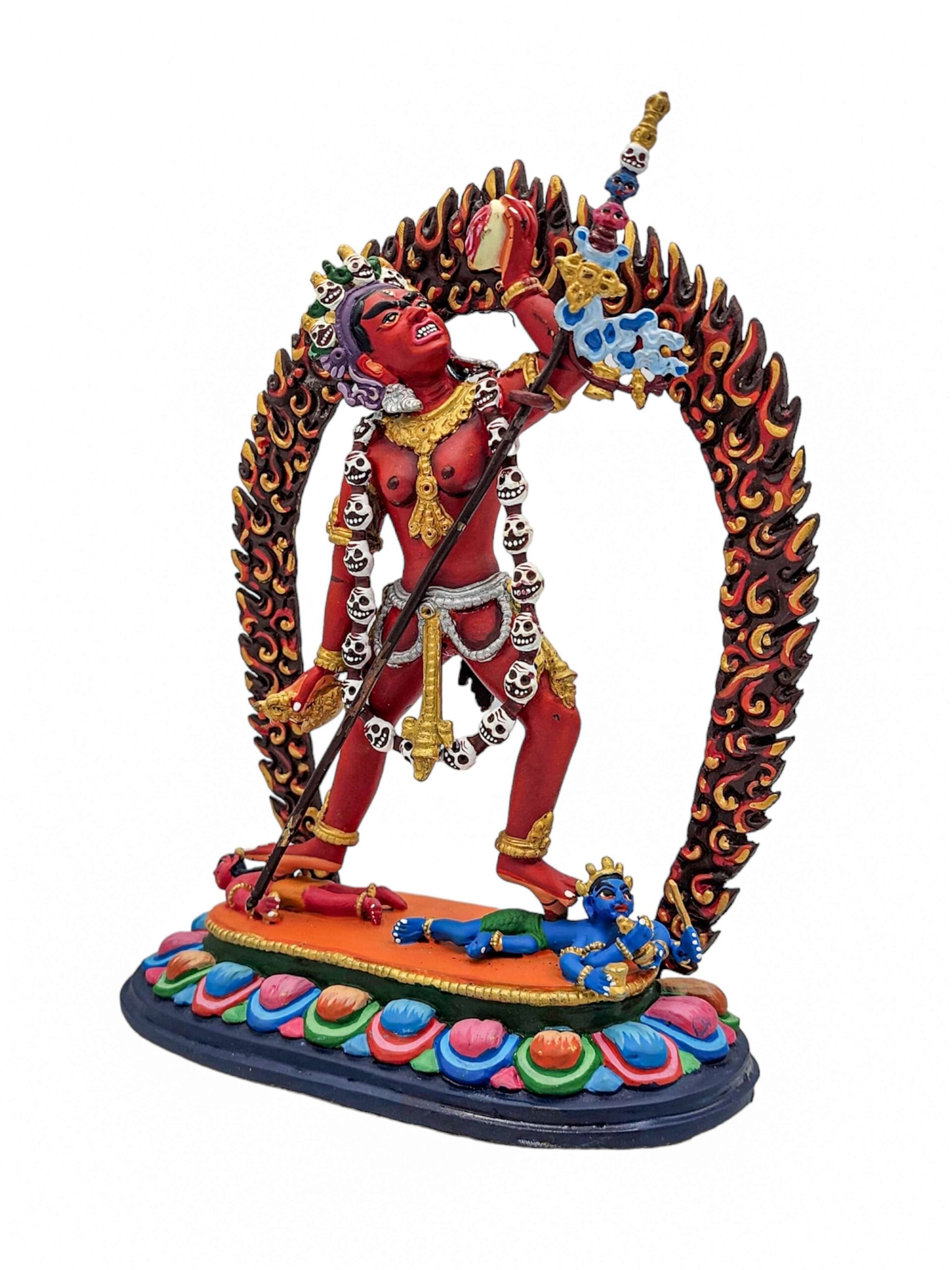 The statue features authentic traditional colors, with a harmonious blend of gold and vibrant hues. These colors are carefully selected to reflect Vajrayogini’s spiritual symbolism and follow the guidelines of Buddhist iconography. This meticulous painting process enhances the statue’s aesthetic appeal, ensuring it aligns with traditional depictions.