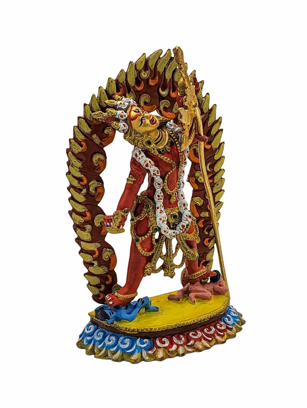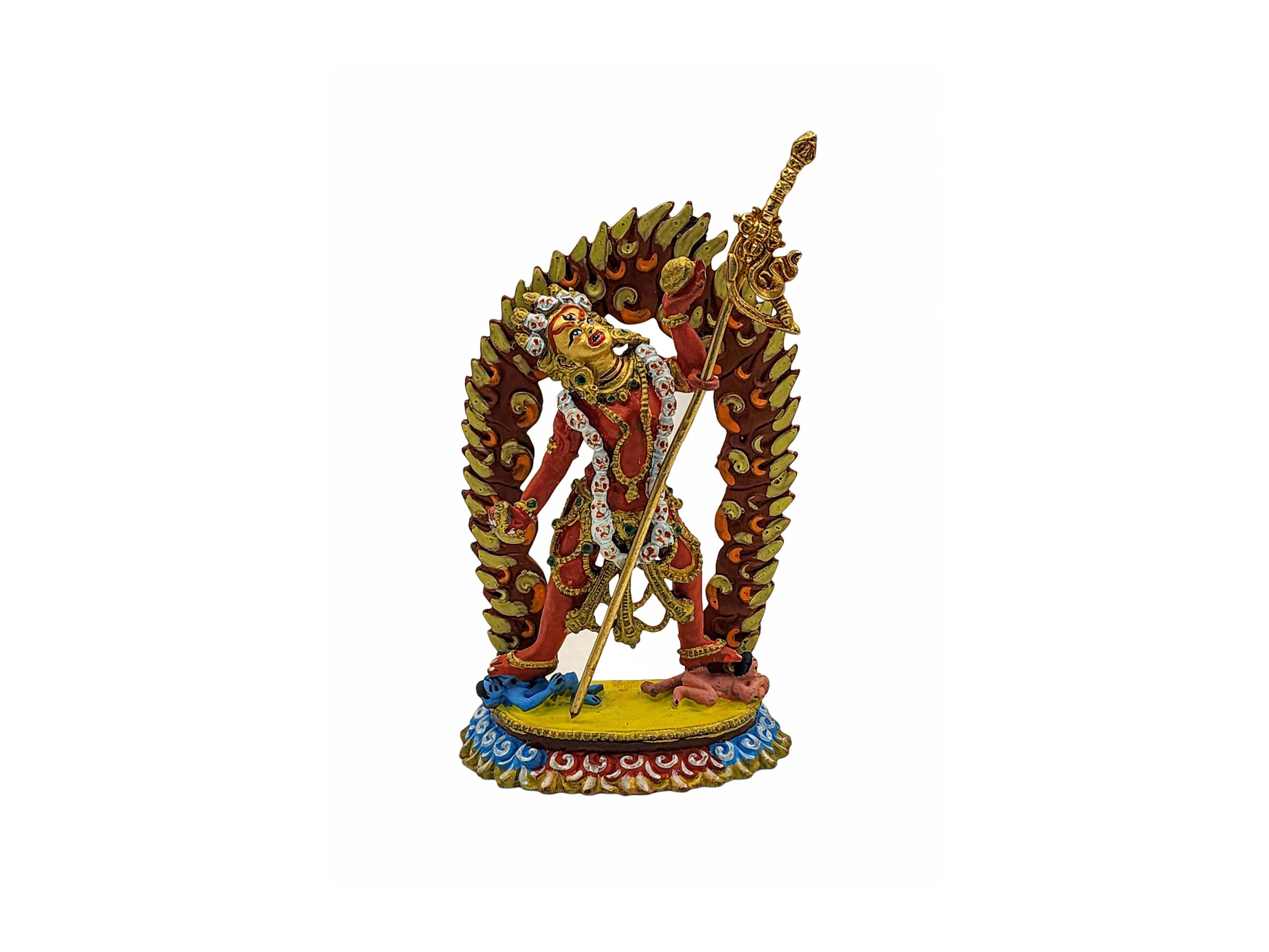 This statue of Vajrayogini is finished with traditional color detailing, following time-honored techniques that highlight her divine presence. The careful use of red, gold, and other ritual colors brings out the symbolism of each element in her form.