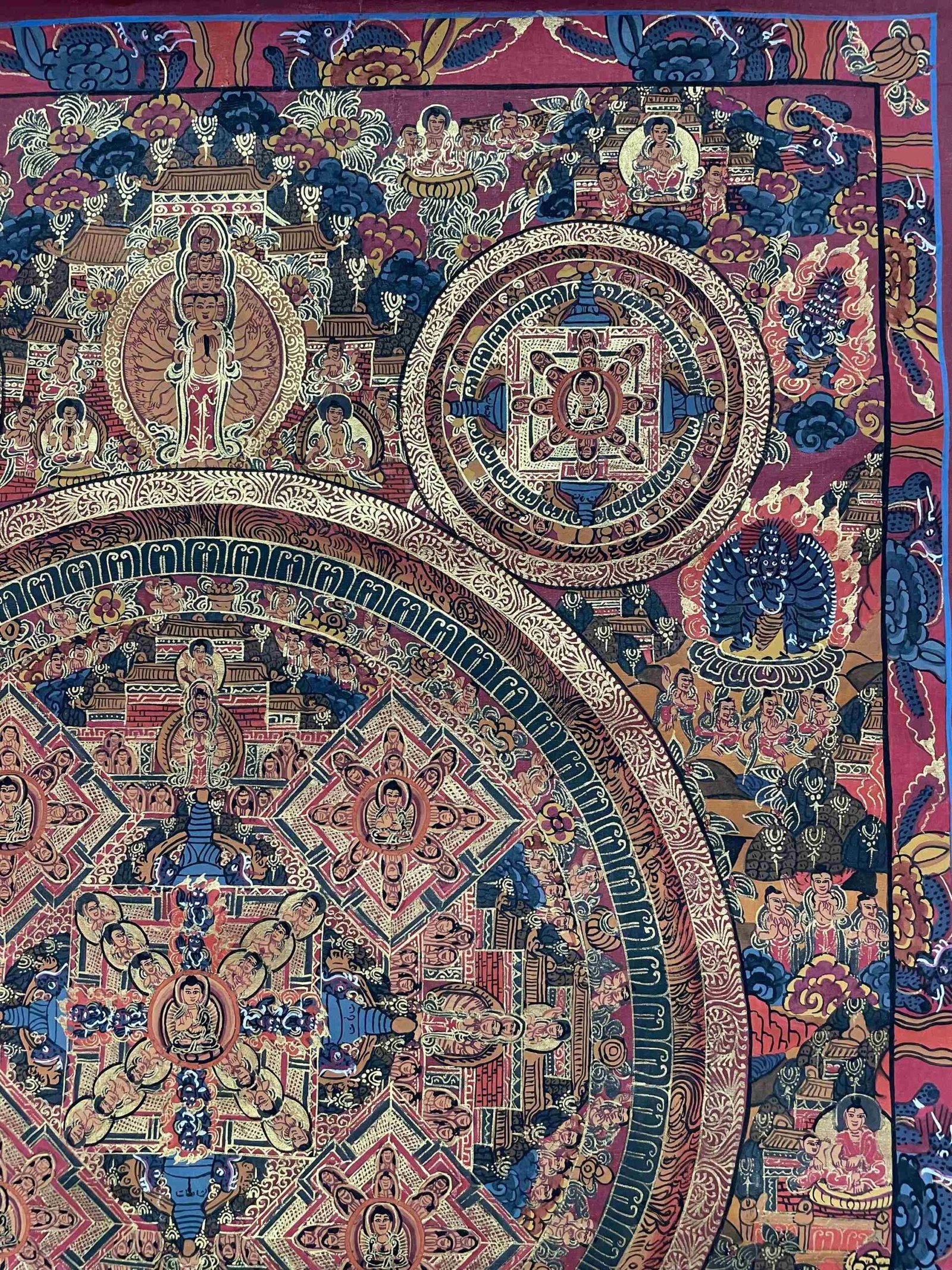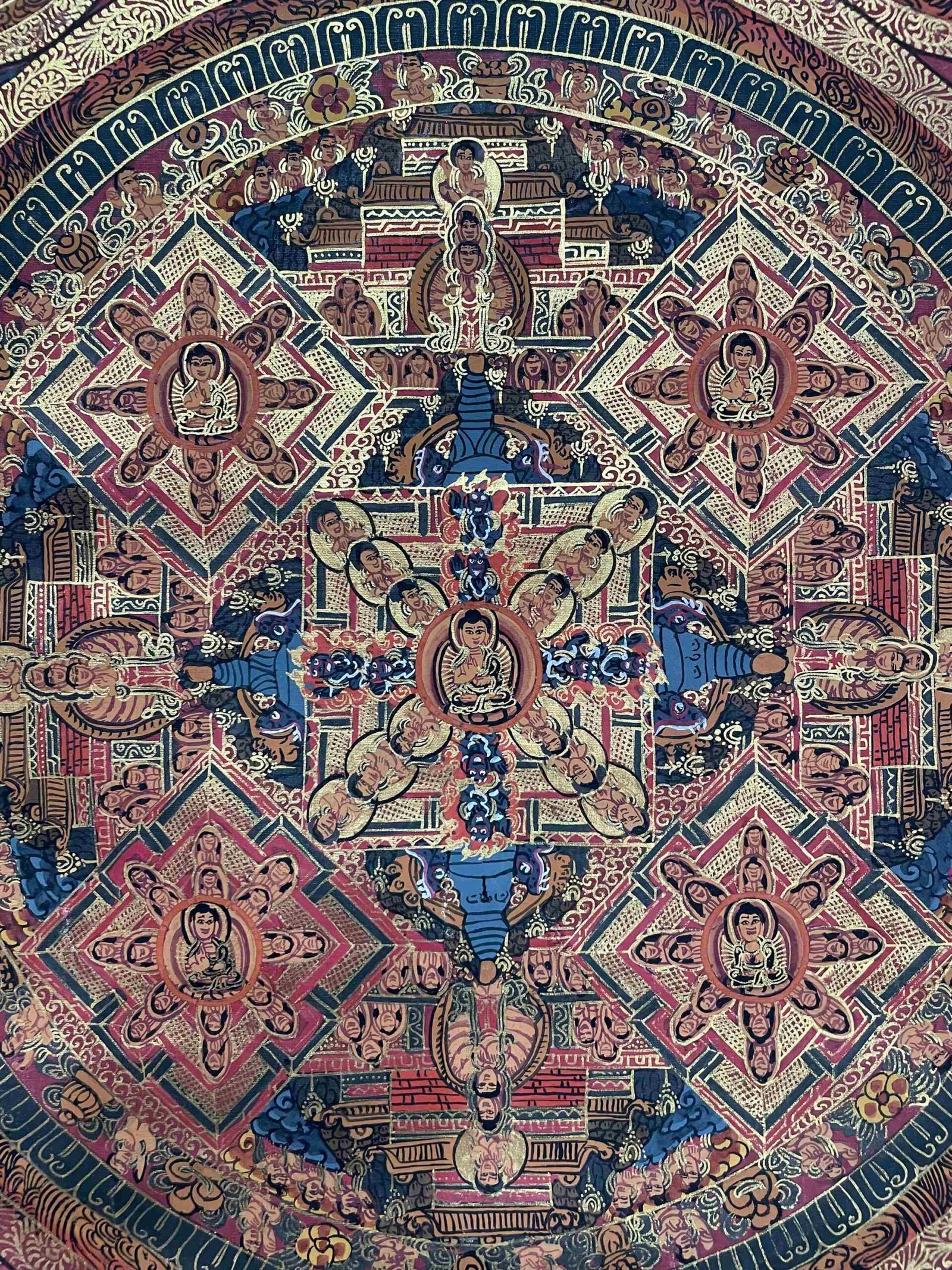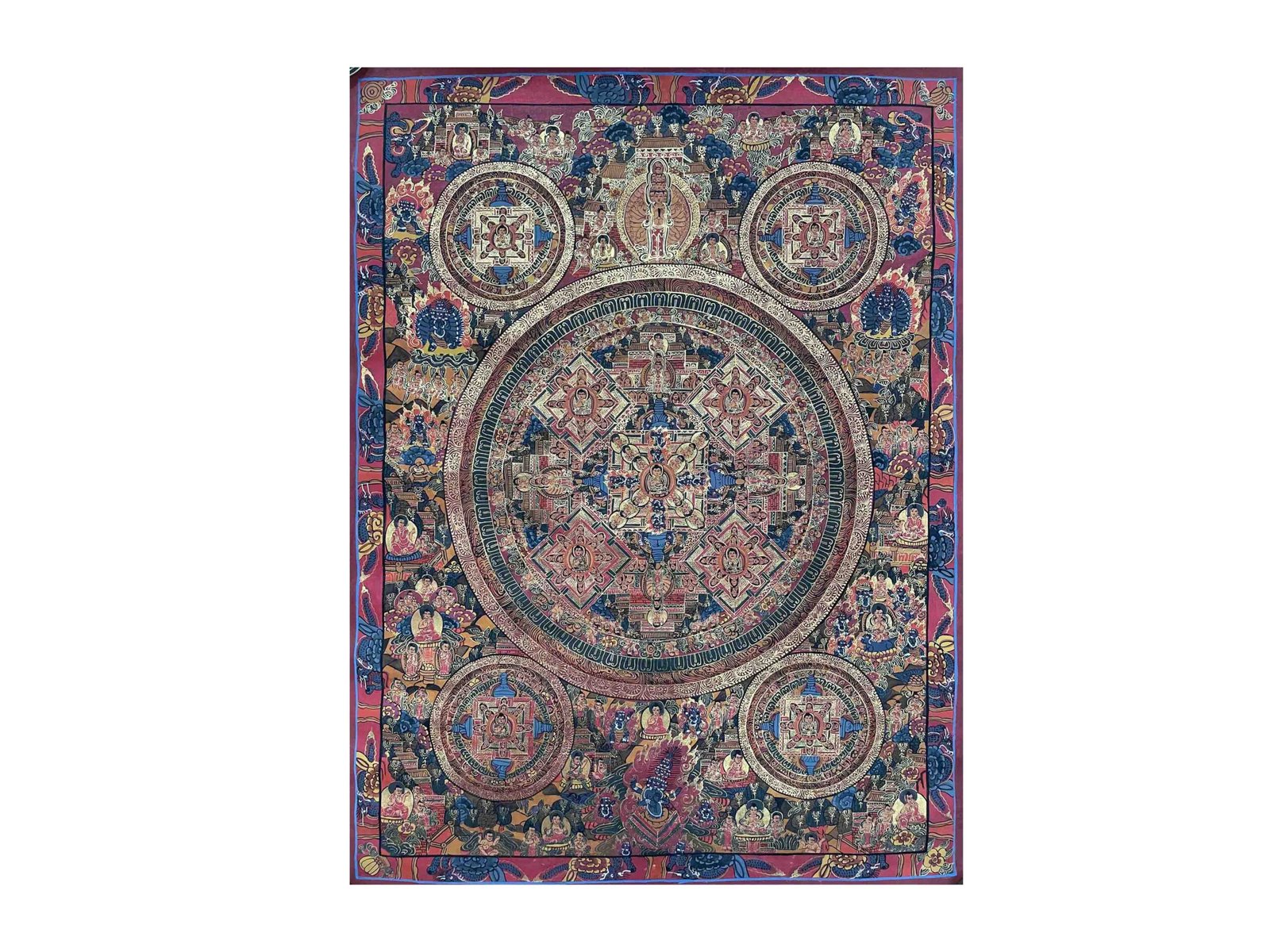 A mandala is a symmetrical, geometric design used in Buddhist practice as a sacred space for meditation and reflection. In this thangka, the Pancha Buddhas are positioned with precision, each surrounded by intricate patterns and spiritual motifs that reflect the cosmic structure of enlightenment. Through detailed brushwork and profound symbolism, mandala thangkas guide viewers inward on a path toward inner peace, focus, and self-realization.