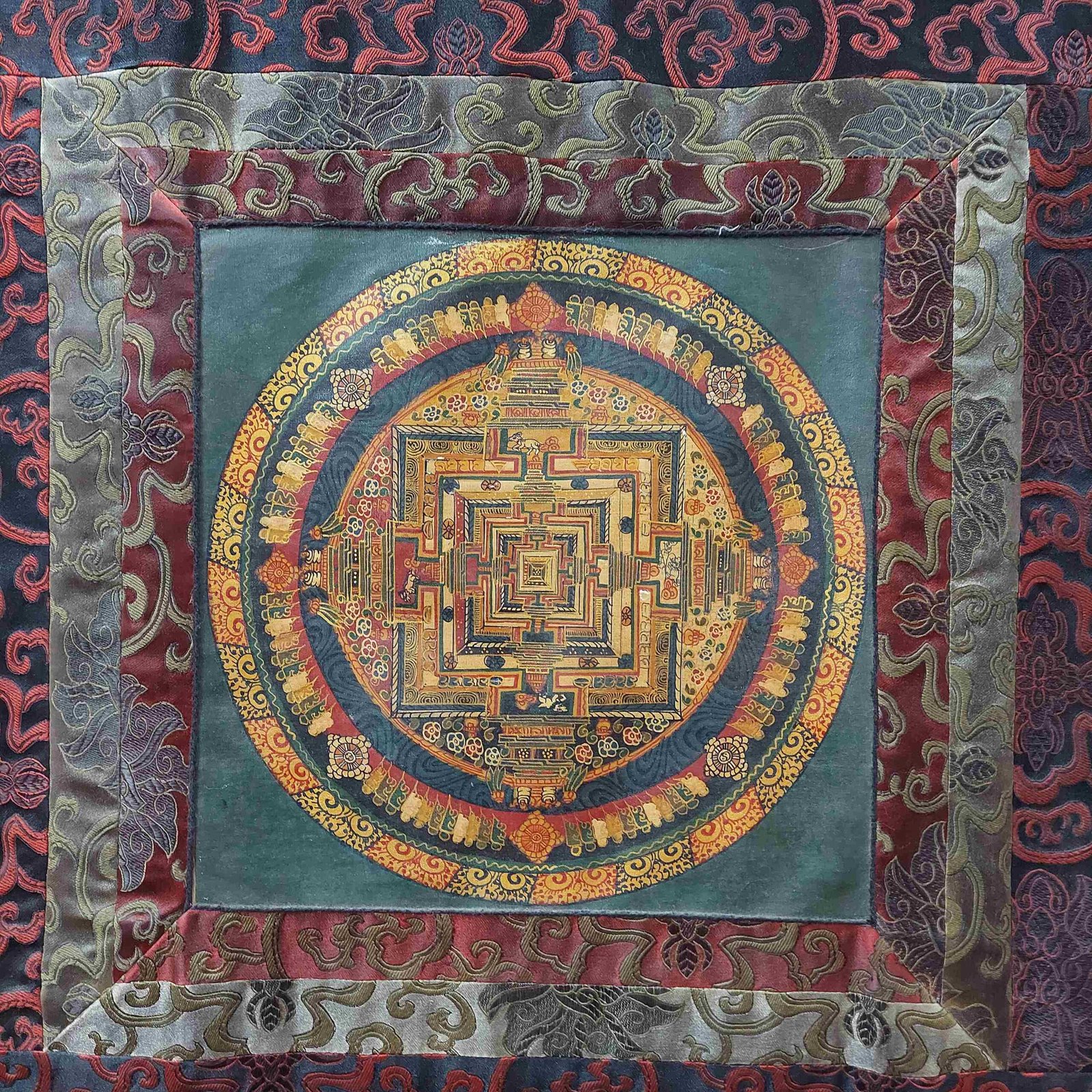 Buddhist Hand-Painted Thangka of Kalachakra Mandala with Polyester Brocade