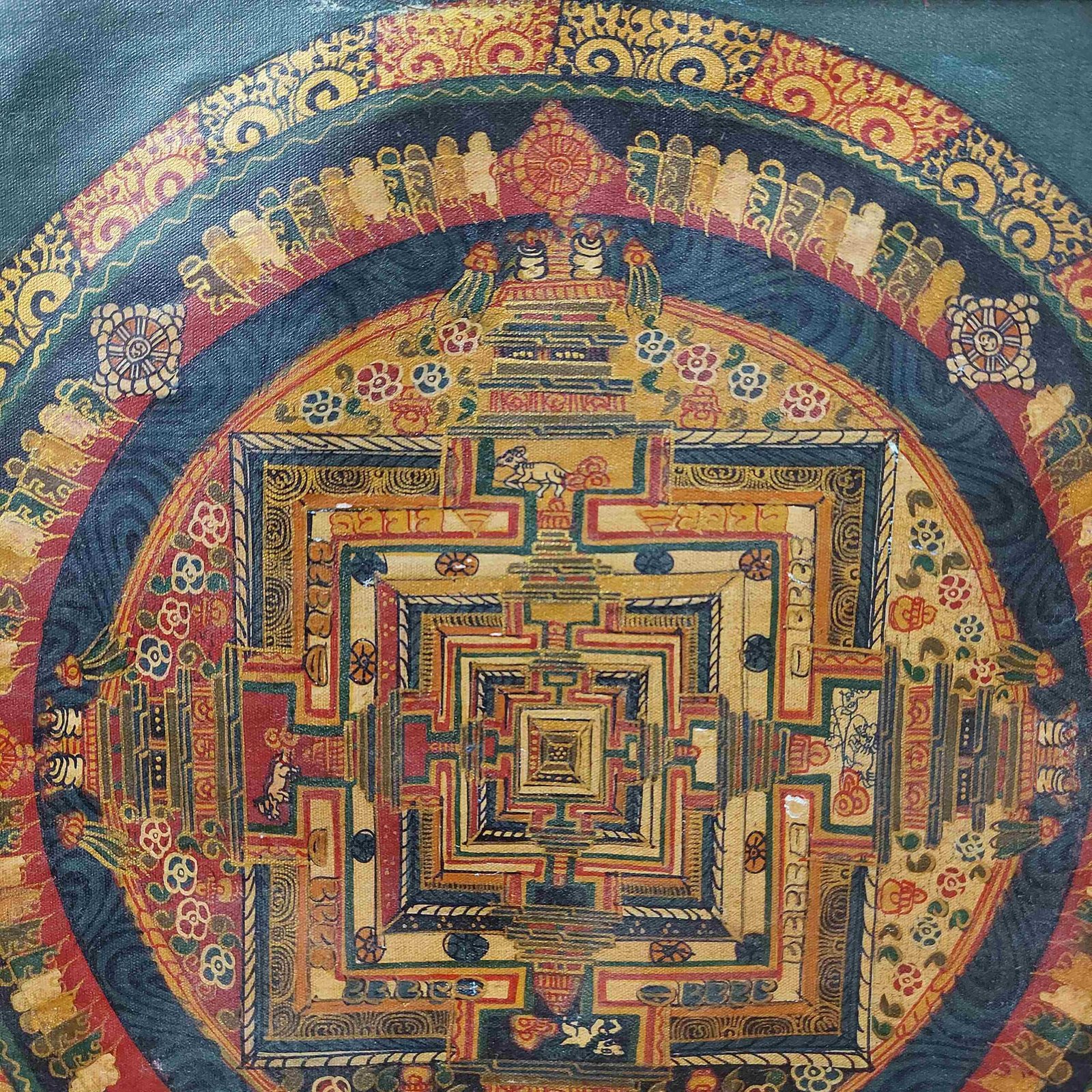 This exquisite Kalachakra Mandala Thangka represents the intricate and profound symbolism of the “Wheel of Time” — a concept central to Tibetan Buddhism that explores the nature of time, cycles, and cosmic harmony. The Tibetan term “Kilkhor” means “center and surrounding,” referring to the sacred geometry of the mandala which symbolizes the universe.