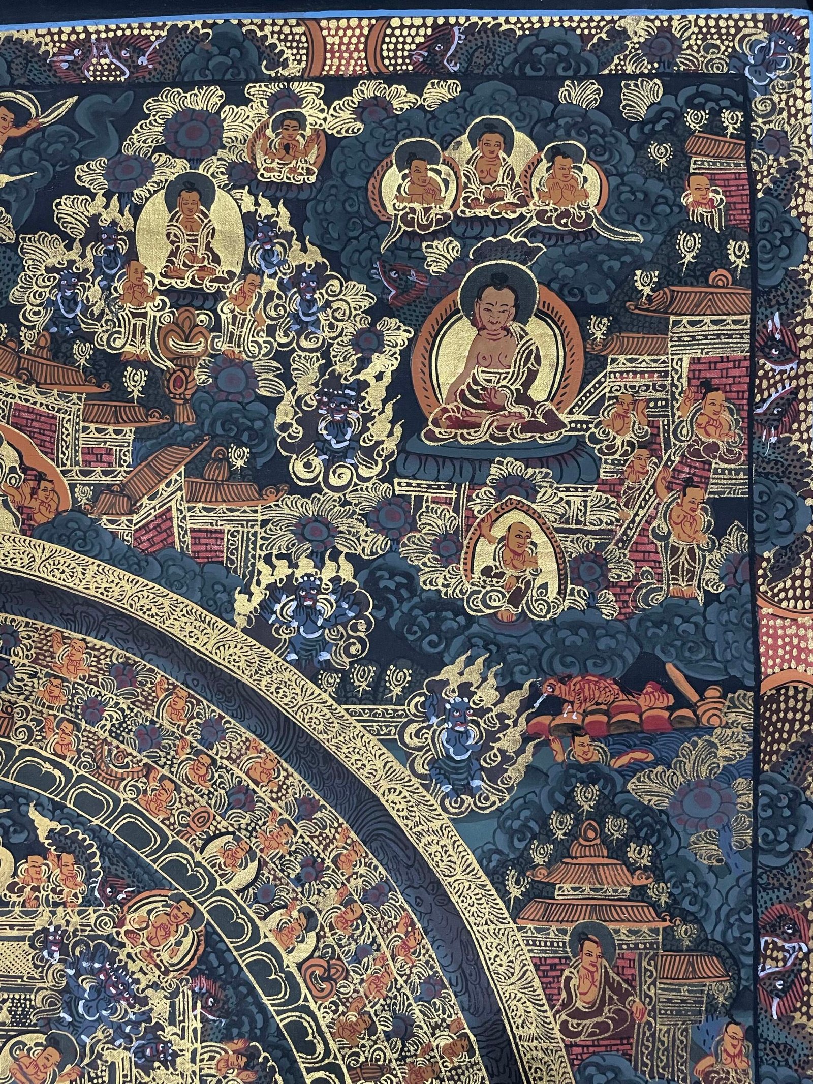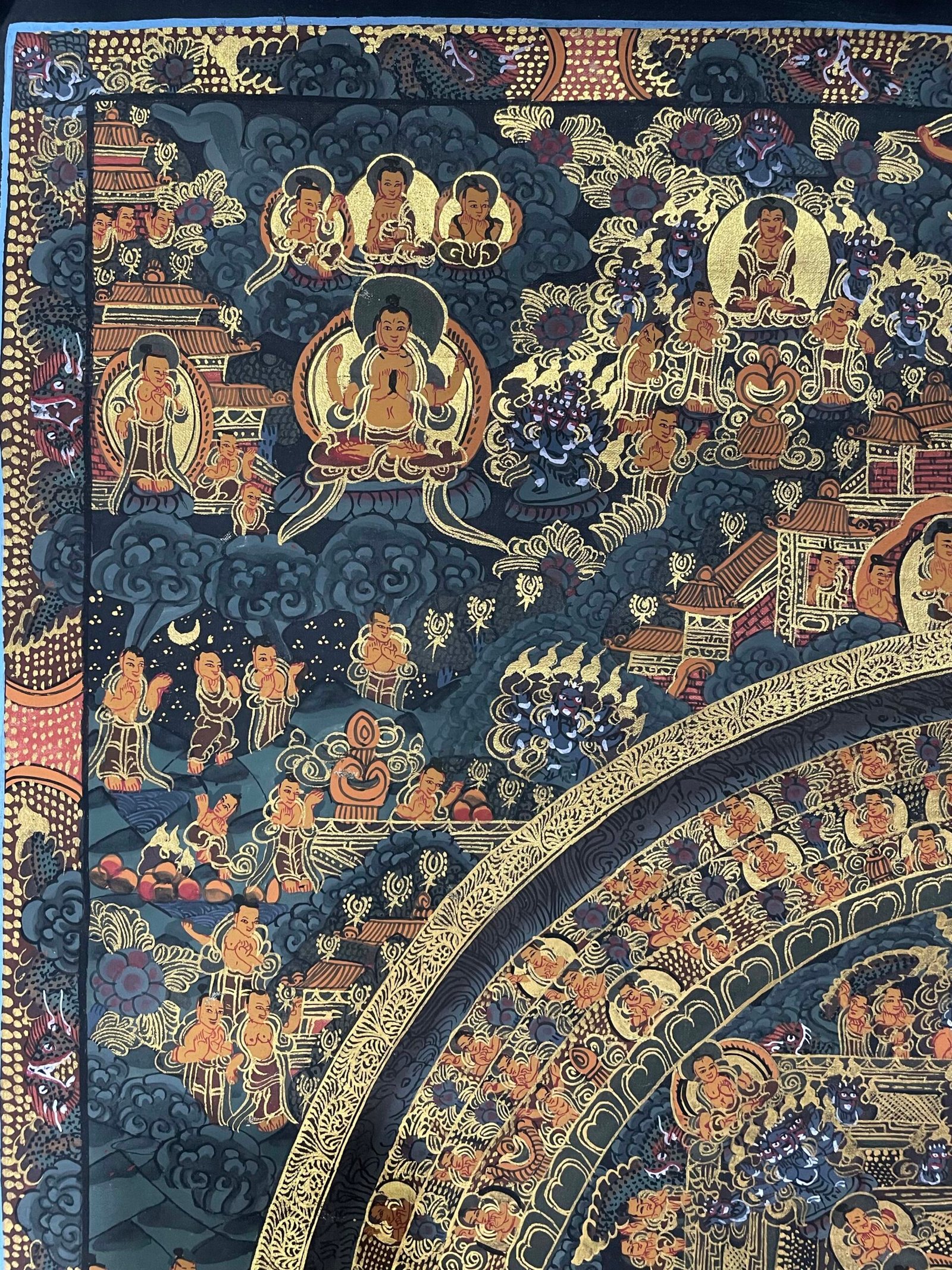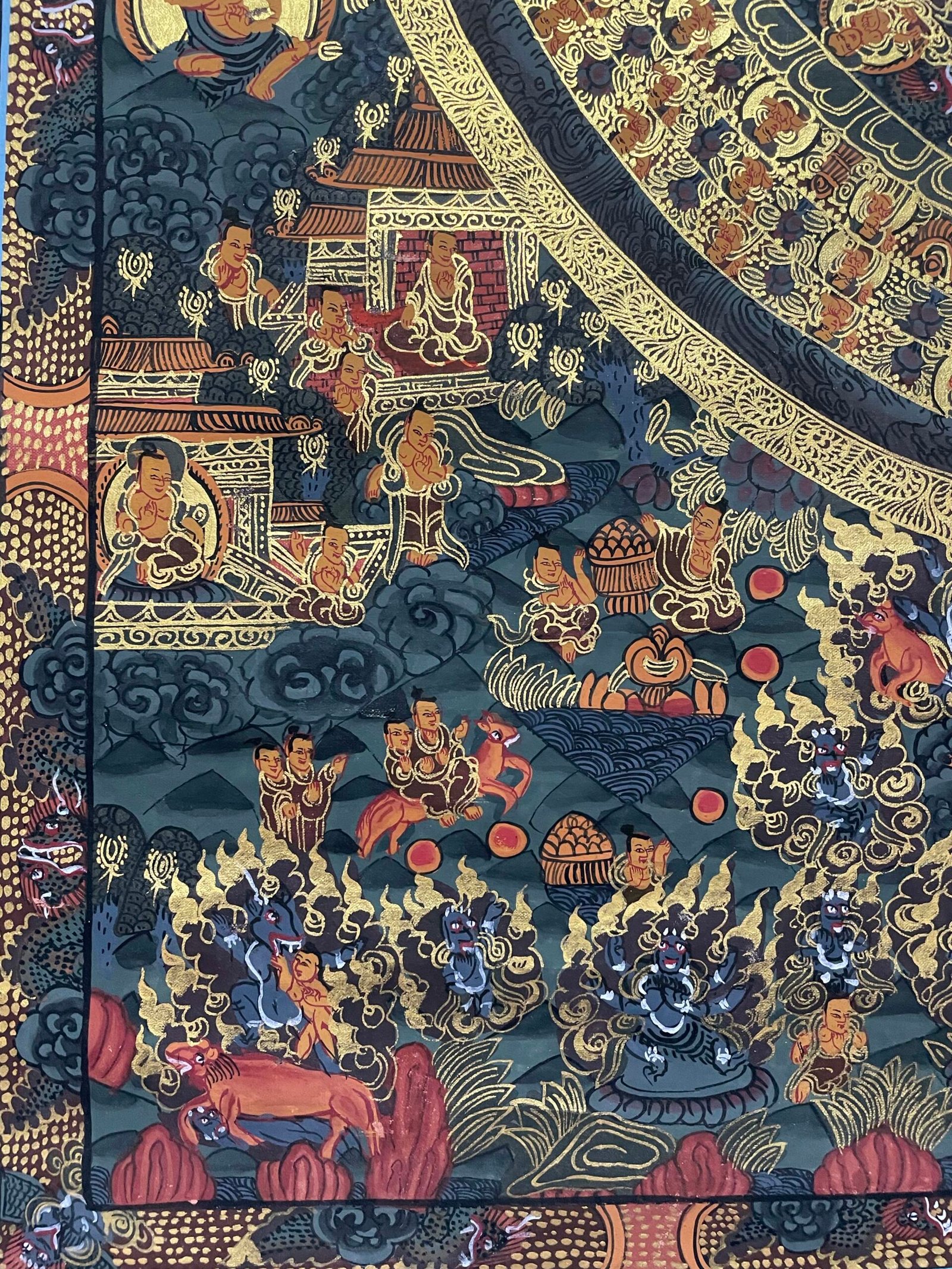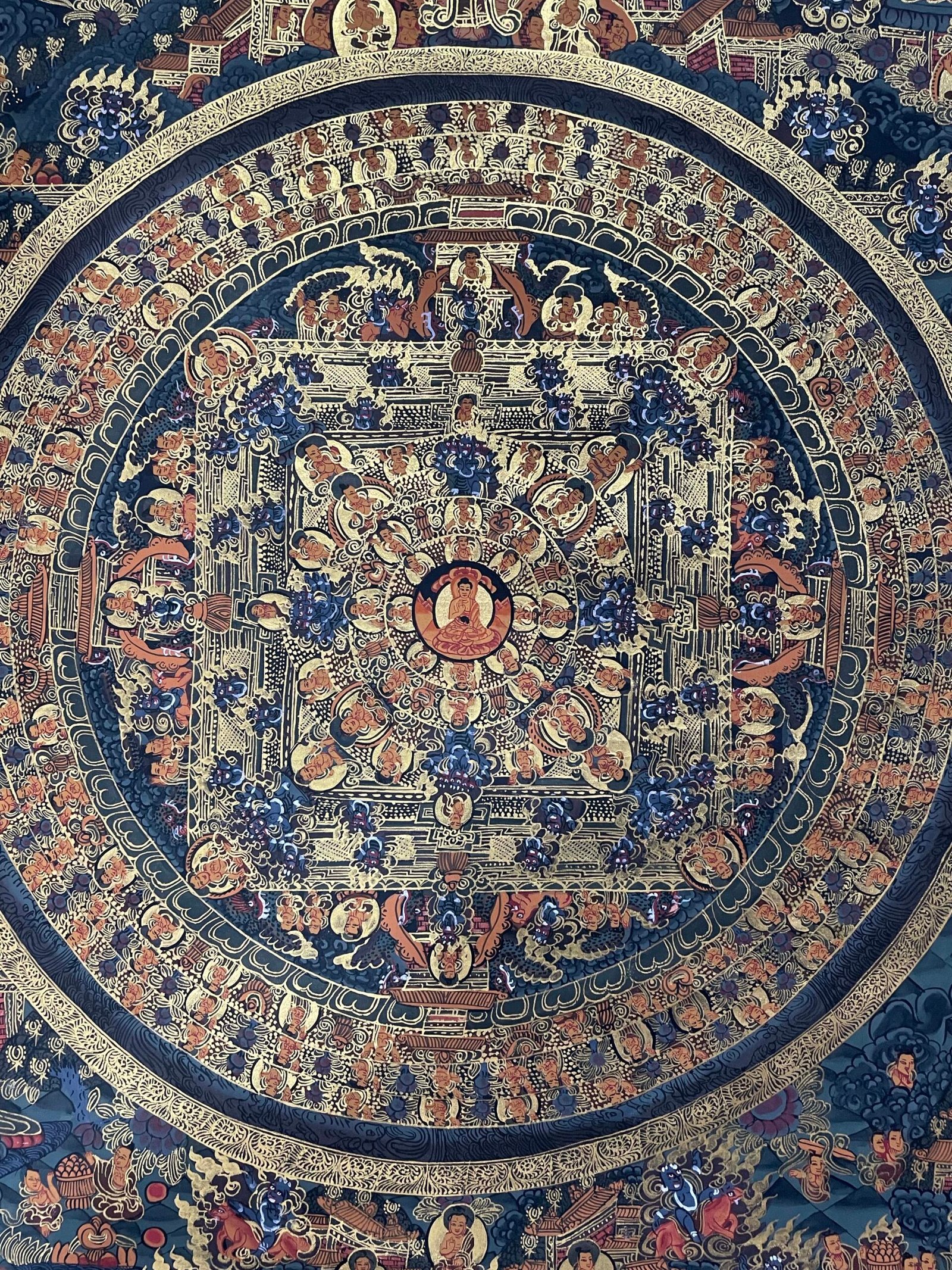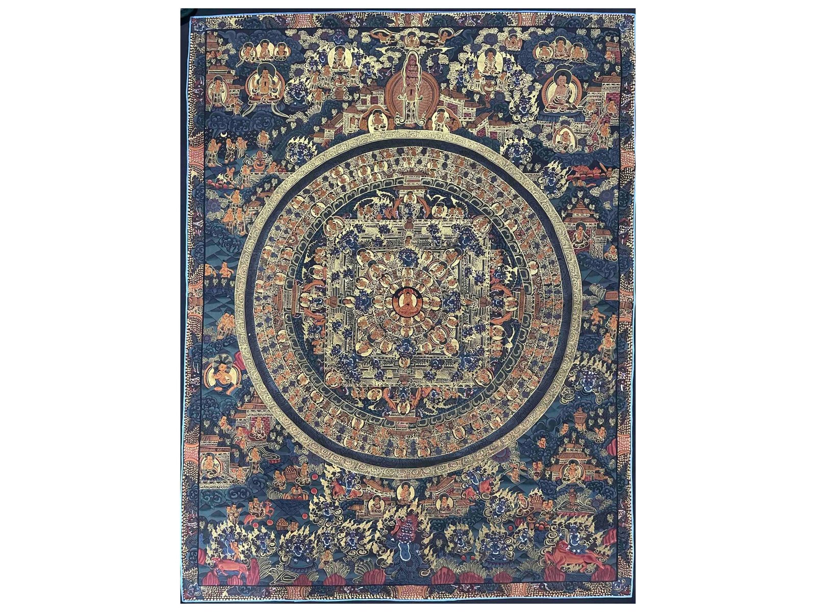 Mandala Thangka painting is a revered form of sacred Buddhist art, meticulously hand-painted on cotton canvas using natural pigments. These paintings feature a central deity or Buddha figure surrounded by intricate geometric patterns, symmetrical designs, and sacred symbols.