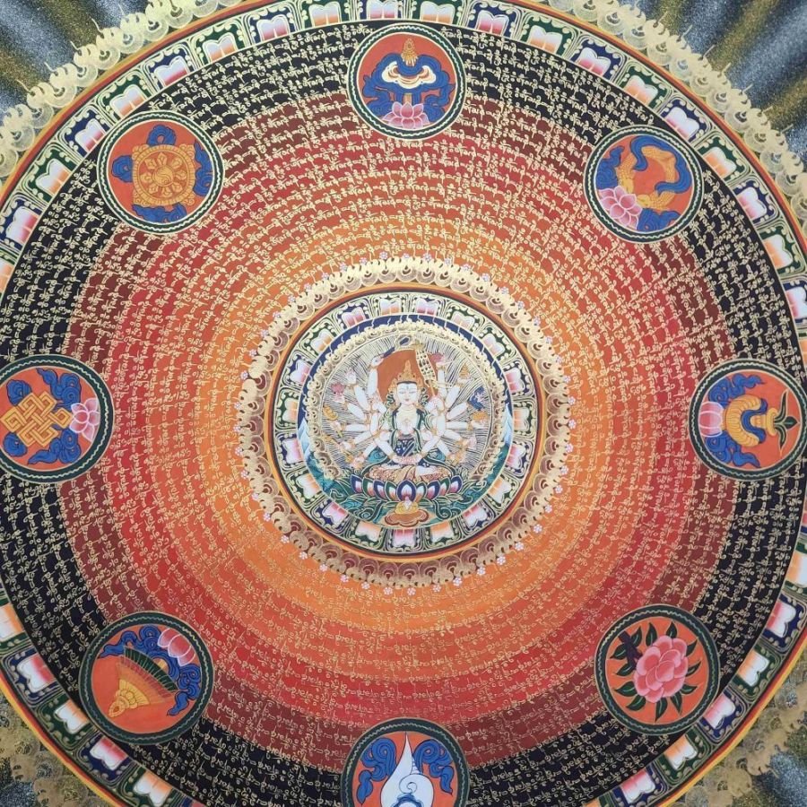 These symbols are often arranged in a mandala format, creating a balanced, harmonious composition that serves as a spiritual focal point for meditation and devotion.