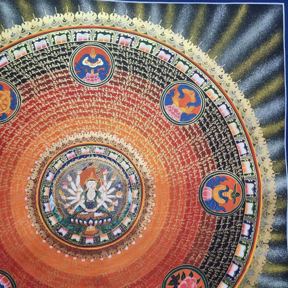 At the heart of this mandala is Chundi (also known as Cundi or Chandi), a revered deity in both Tibetan and Chinese Mahayana Buddhism. She is an embodiment of divine motherly compassion and supreme wisdom, associated with protection, purification, and wish-fulfillment. Often referred to as the Mother of the Seventy Million Buddhas, Chundi is venerated through her mantra and is believed to swiftly grant blessings to sincere devotees.