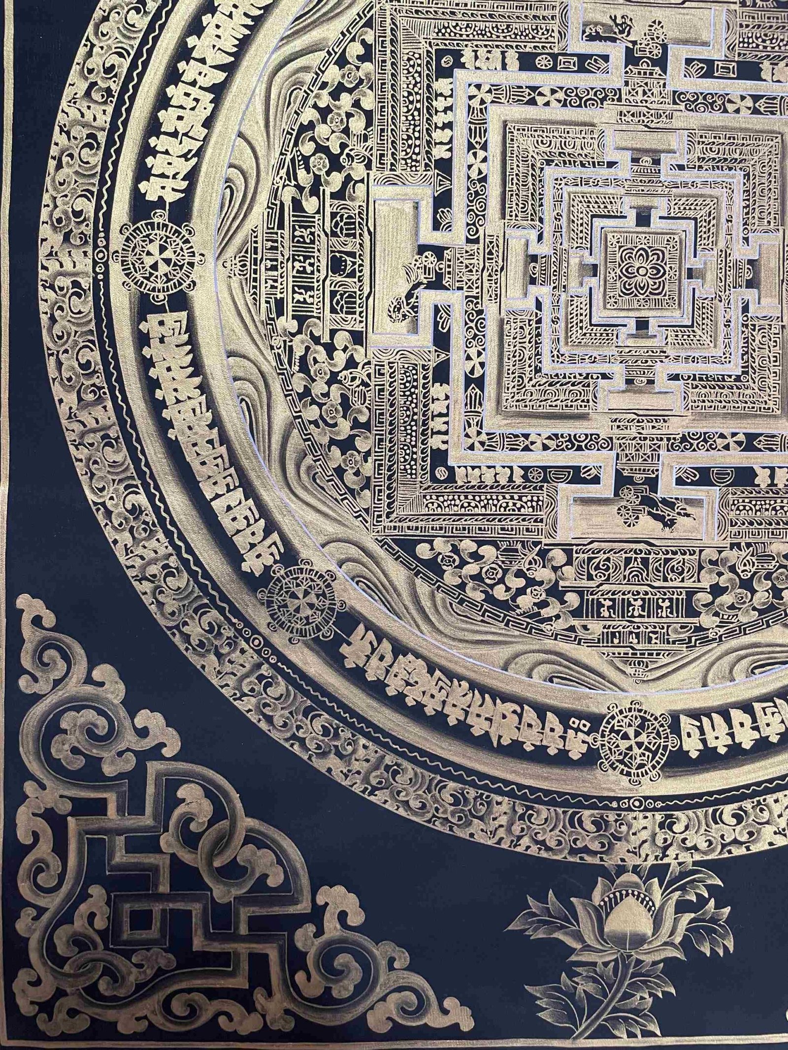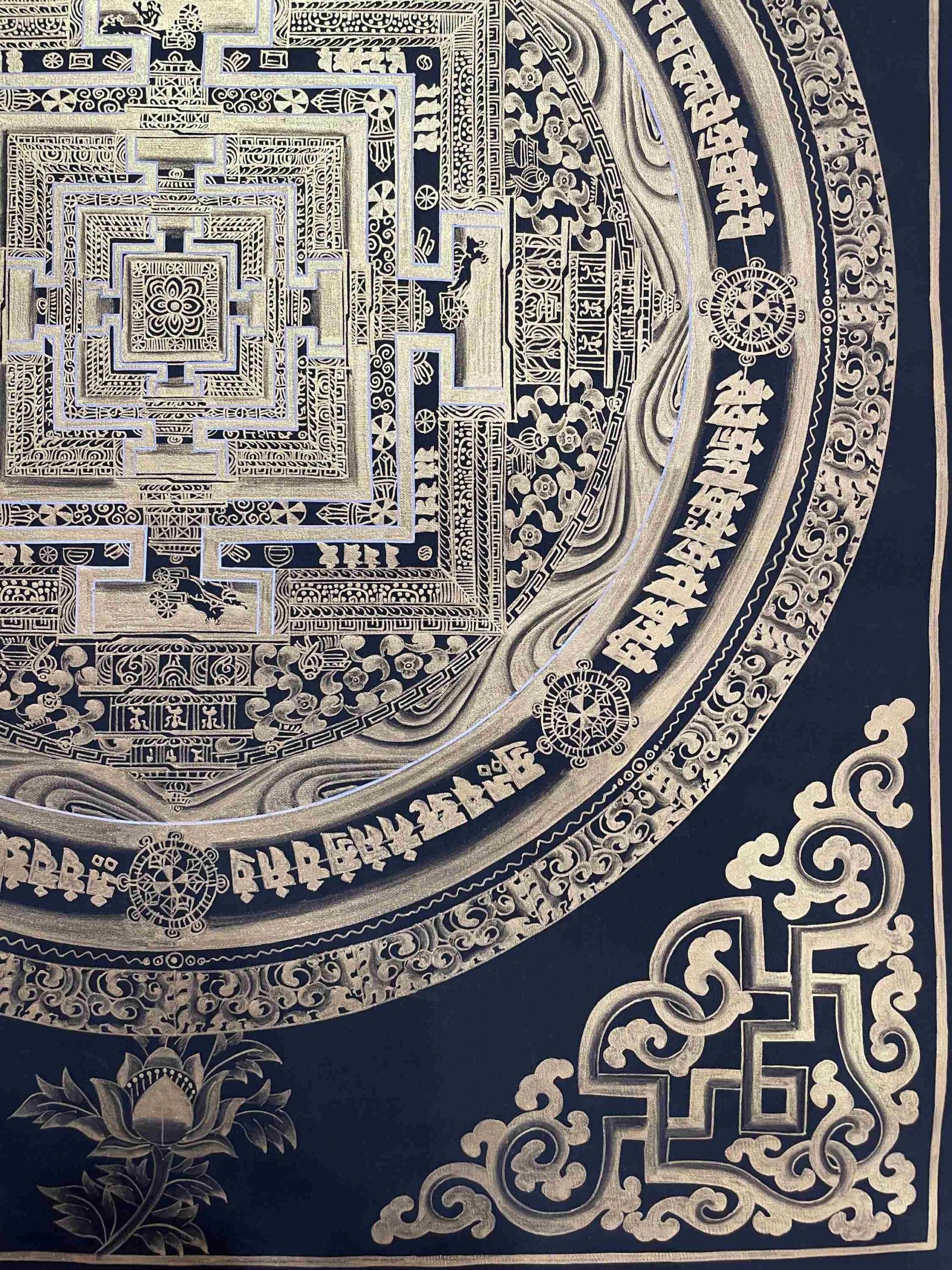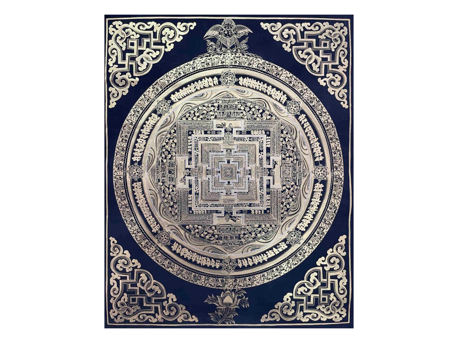 This hand-painted thangka depicts the Kalachakra Mandala, a deeply symbolic and sacred representation of the universe in Tibetan Buddhism. The Tibetan term for mandala, “kilkhor,” refers to the “center of the circle with outer walls and surrounding environment,” illustrating the interconnectedness of all things and the path to enlightenment.