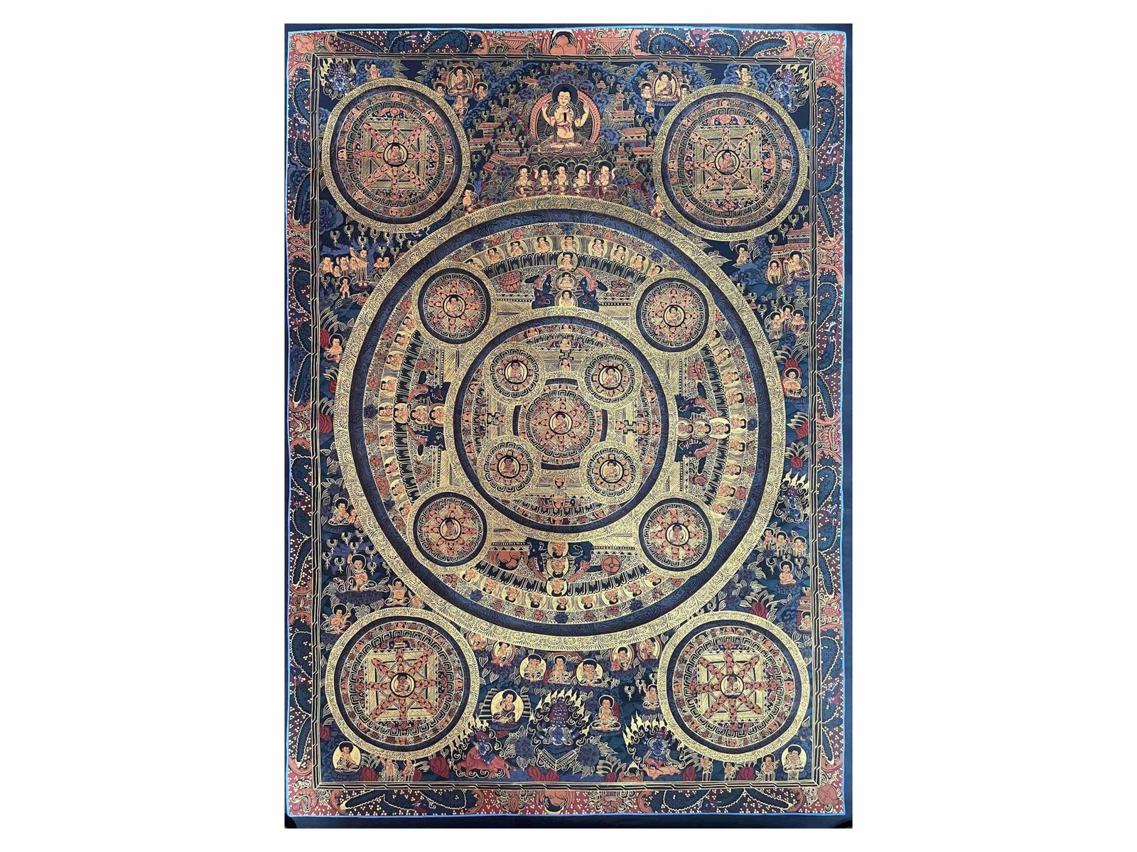 Mandala Thangka painting is a highly revered Buddhist sacred art, known for its intricate patterns and deep spiritual symbolism. These hand-painted artworks are crafted on cotton canvas or silk, often featuring a central deity or Buddha figure encircled by geometric patterns, symmetrical motifs, and sacred symbols.