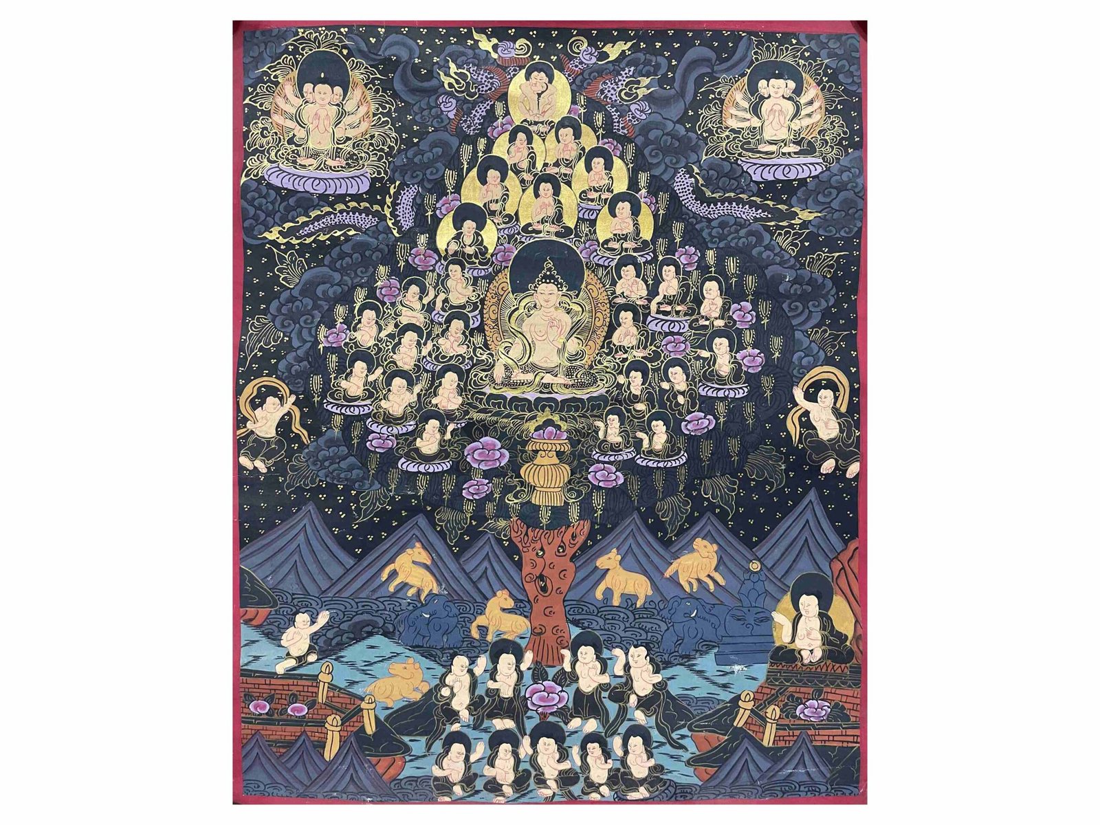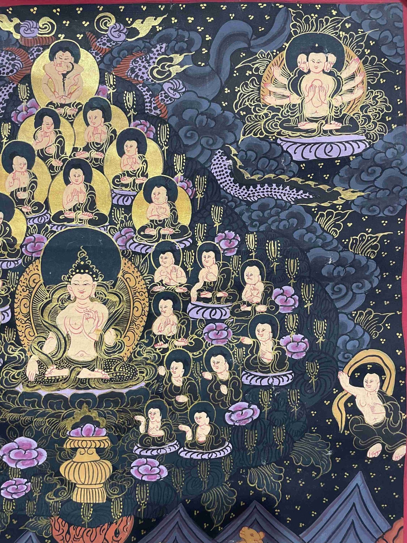 This intricately detailed Thangka narrates the key moments of his spiritual transformation, offering an inspiring visual representation of his teachings.