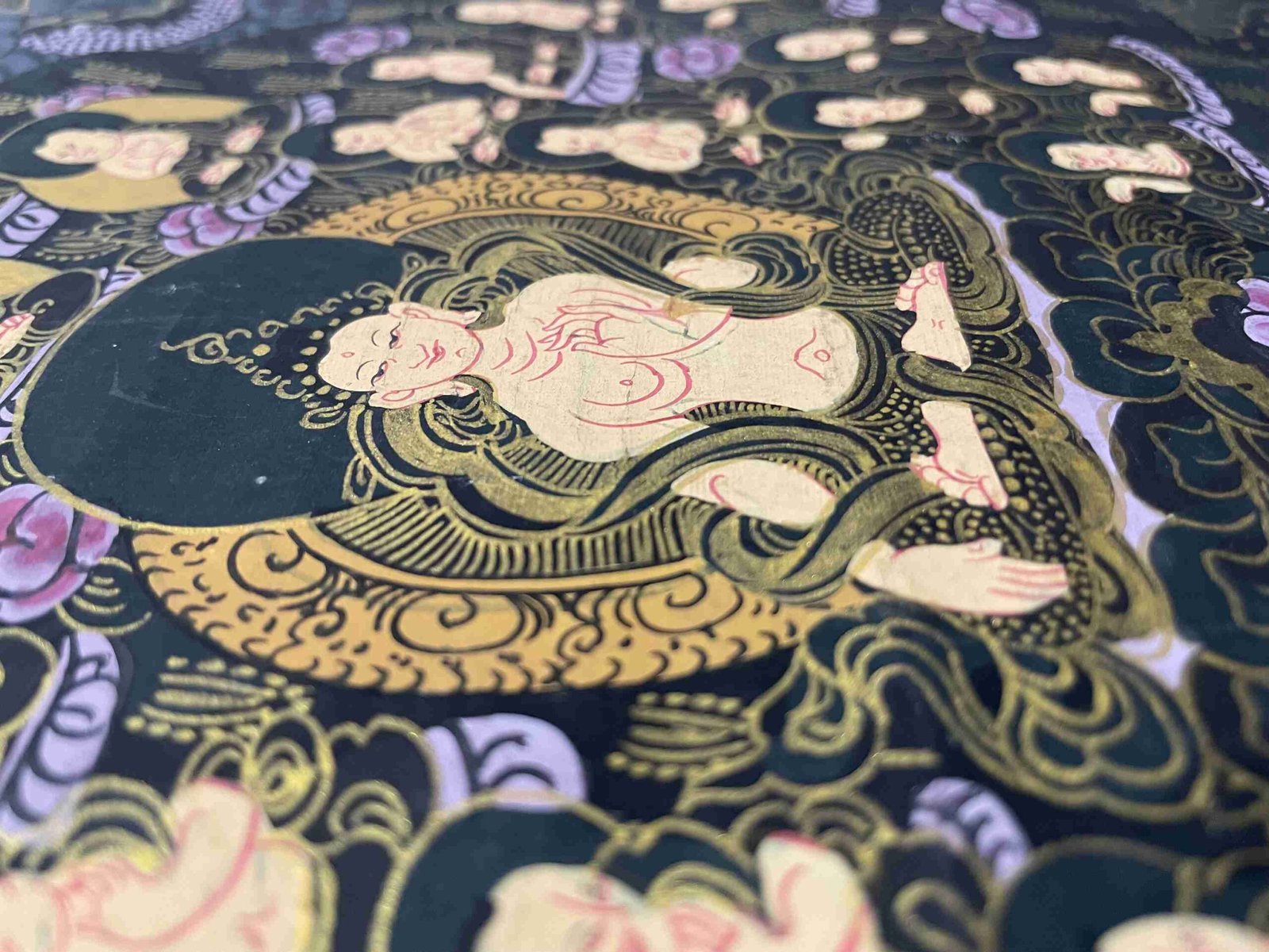 A Thangka (also spelled tangka, thanka, or tanka) is a traditional Tibetan Buddhist painting, crafted with meticulous precision on cotton canvas or silk appliqué.