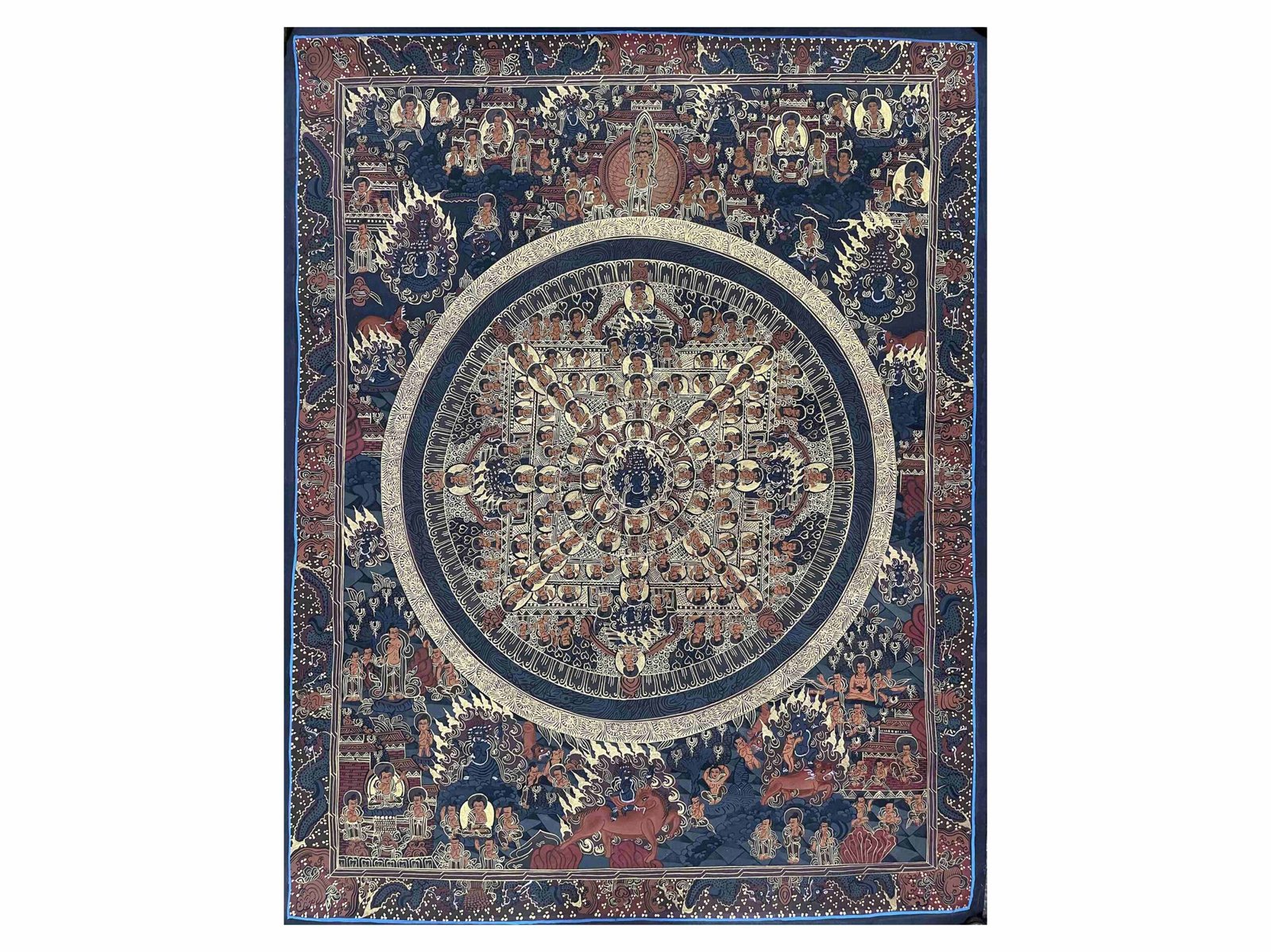 Mandala Thangka painting is a sacred and meditative art form in Buddhism, known for its intricate patterns and profound spiritual symbolism. These paintings are handcrafted on cotton or silk, featuring a central deity or Buddha figure encircled by precise geometric patterns and sacred motifs.