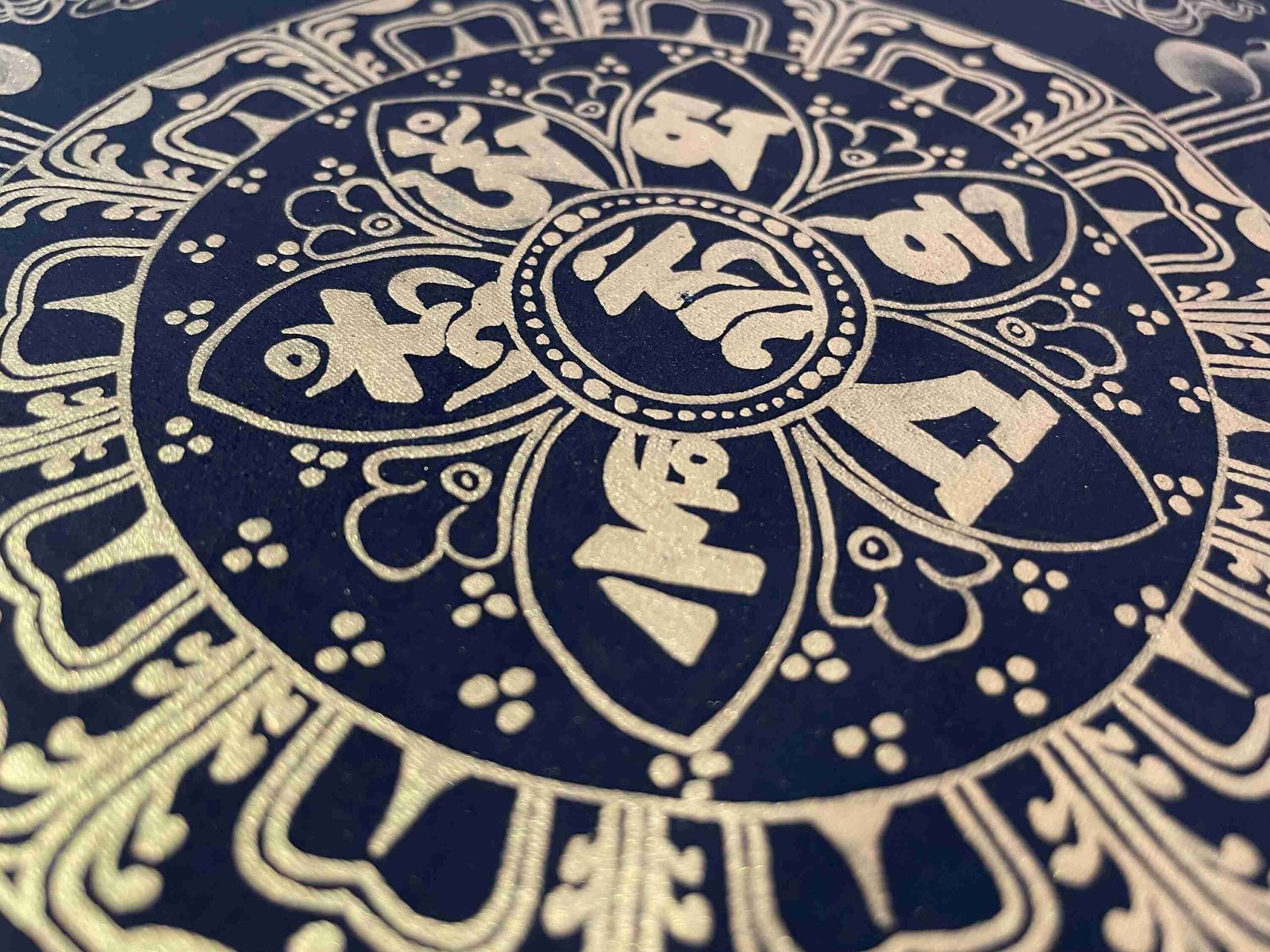 This hand-painted Mantra Mandala Thangka features the sacred mantra OM MANI PADME HUM, associated with Avalokiteshvara (Chenrezig)—the Buddha of Compassion. This powerful six-syllable mantra is believed to offer protection from danger, remove misery, and guide practitioners toward inner peace and enlightenment.