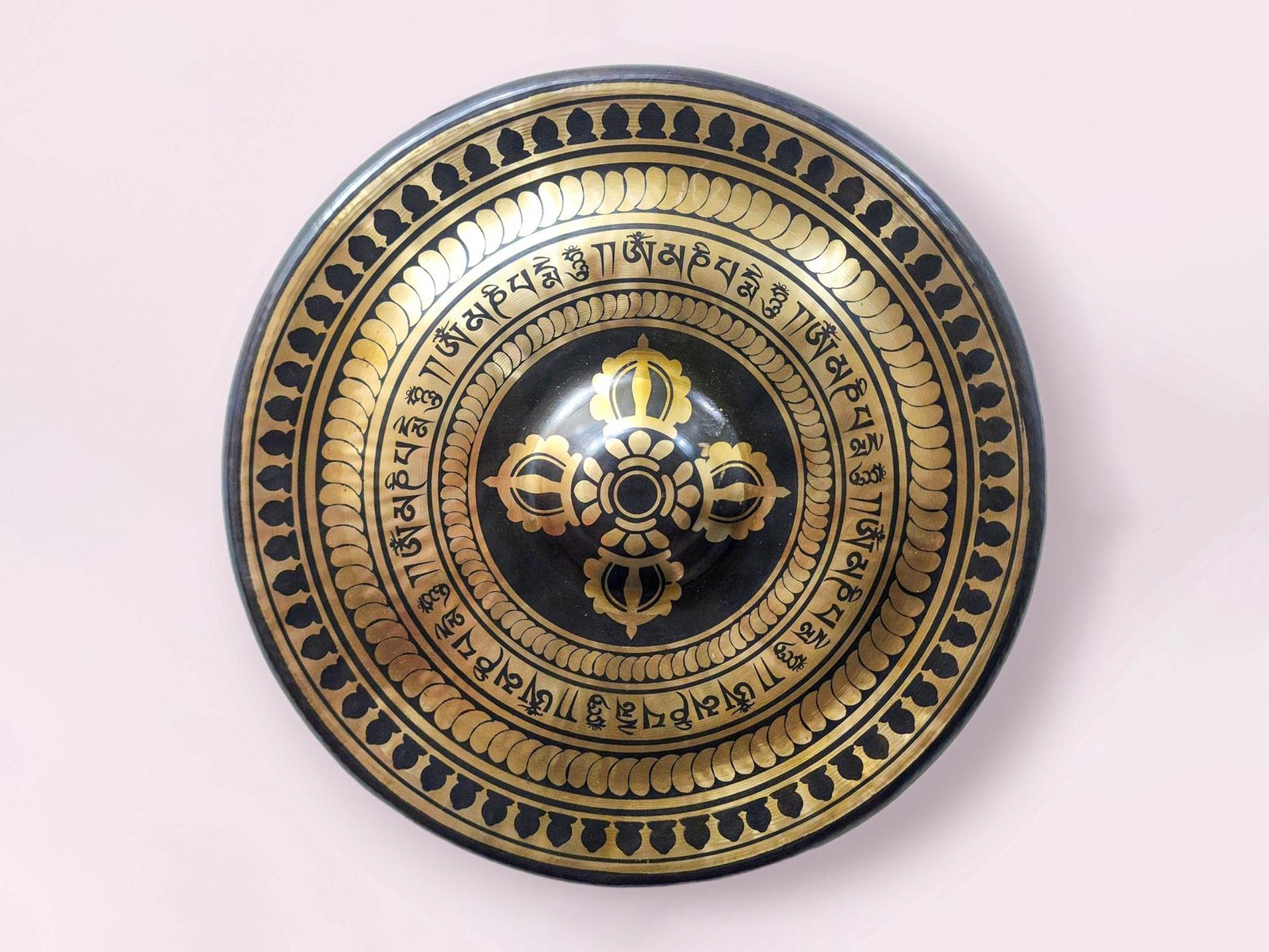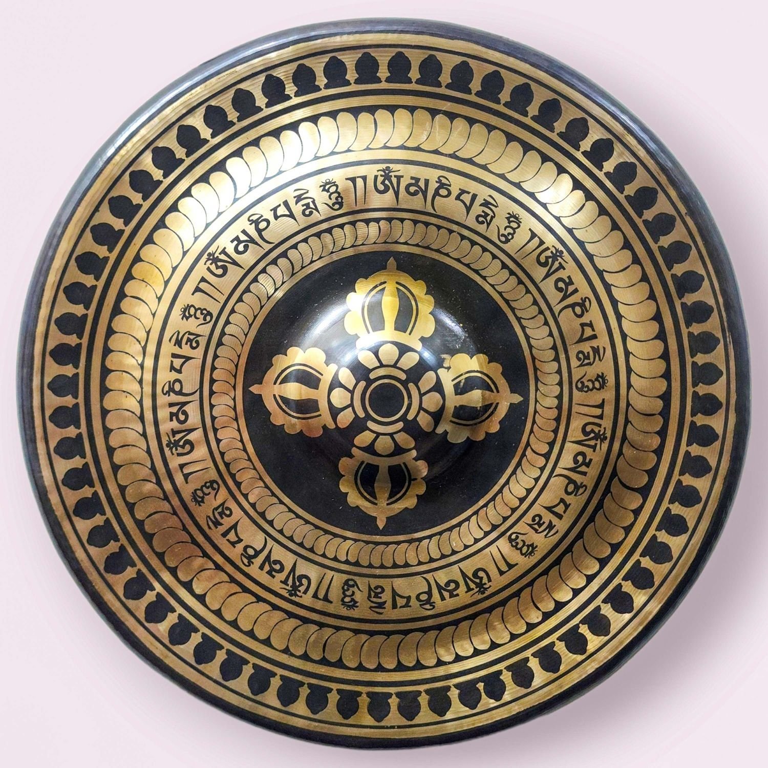 This hand-beaten Burmese nipple gong features a striking flower design and a raised central boss, inspired by the elegant styles of Javanese gongs. Crafted from high-quality bronze, it produces a clear, focused sound with a distinctive character. The nipple gong is known for delivering two unique tones—one when struck on the central boss, and another when played around the edges. This dual-tone feature adds versatility, making it suitable for meditation, sound healing, ceremonial use, and musical performances.