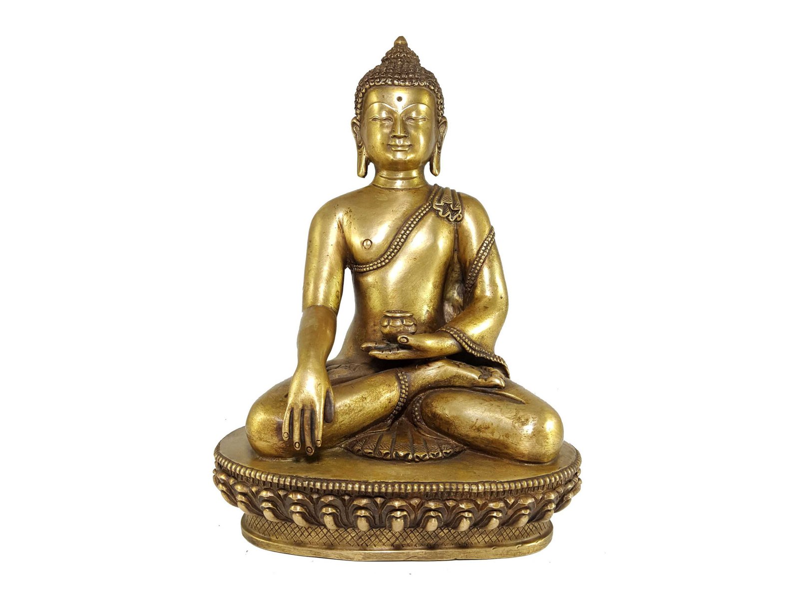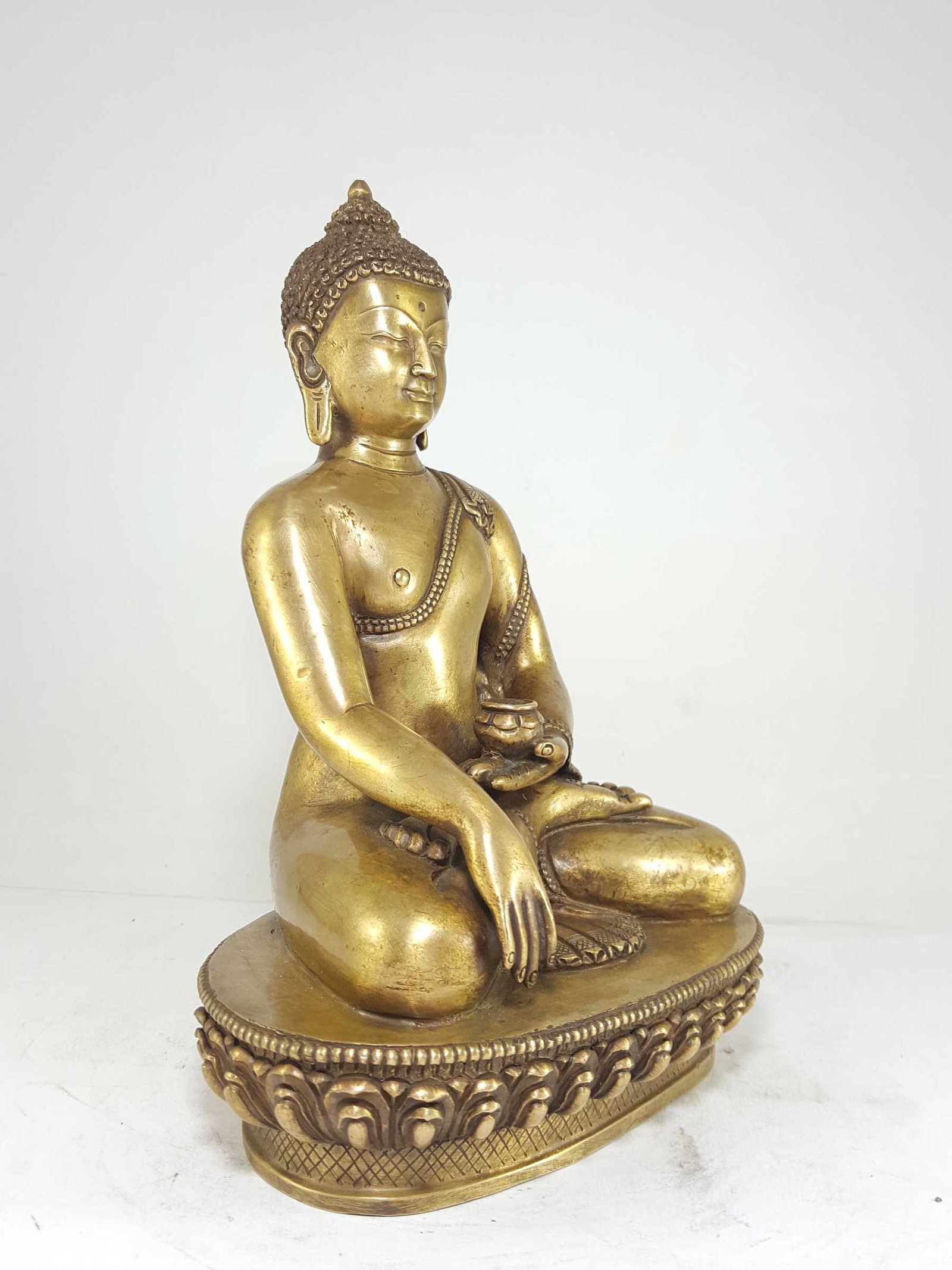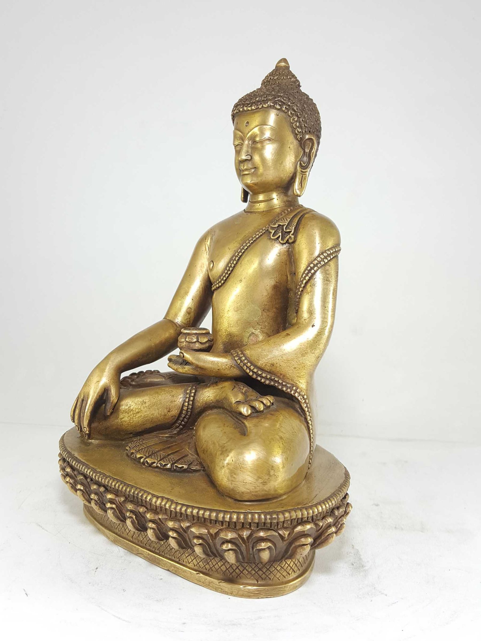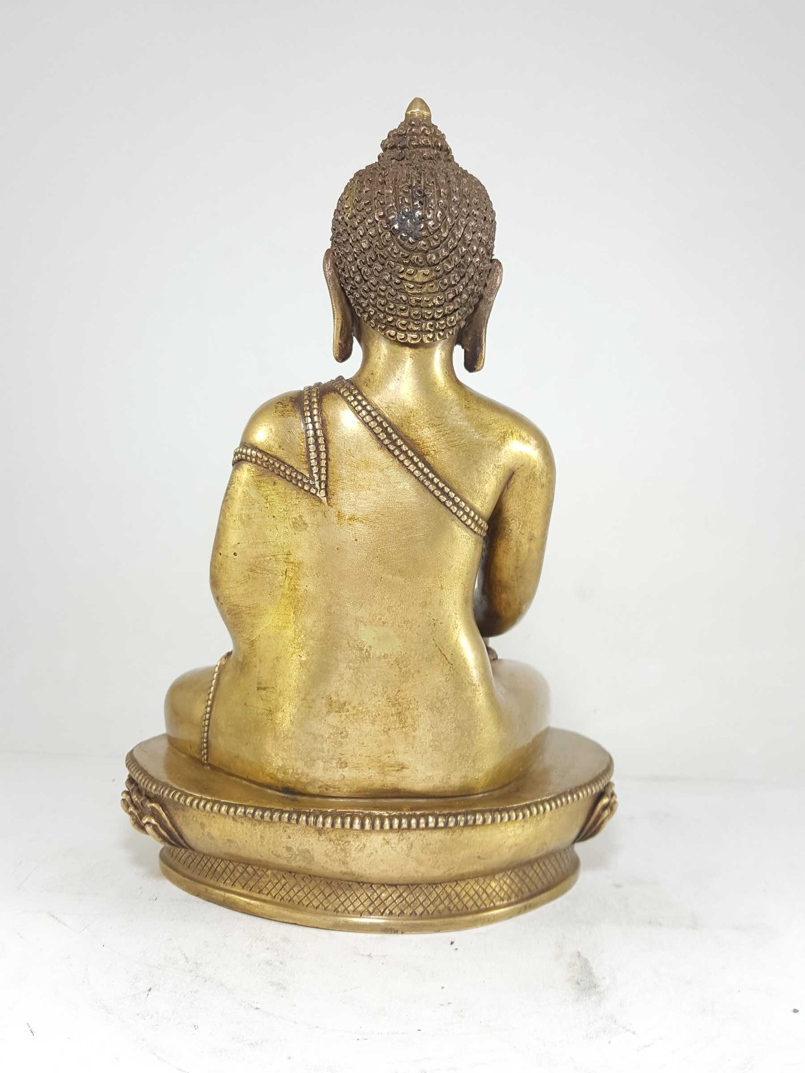 This Shakyamuni Buddha statue features a remarkable bronze patina finish. The traditional process involves organic materials like butter and vegetable color to give the copper statue an aged bronze appearance. This exquisite technique, mastered by skilled artisans, creates a timeless and sophisticated aesthetic that adds a sense of elegance and nostalgia to any space. With each piece, you not only acquire a stunning Buddha statue but also celebrate the craftsmanship that keeps this rare art form alive.
