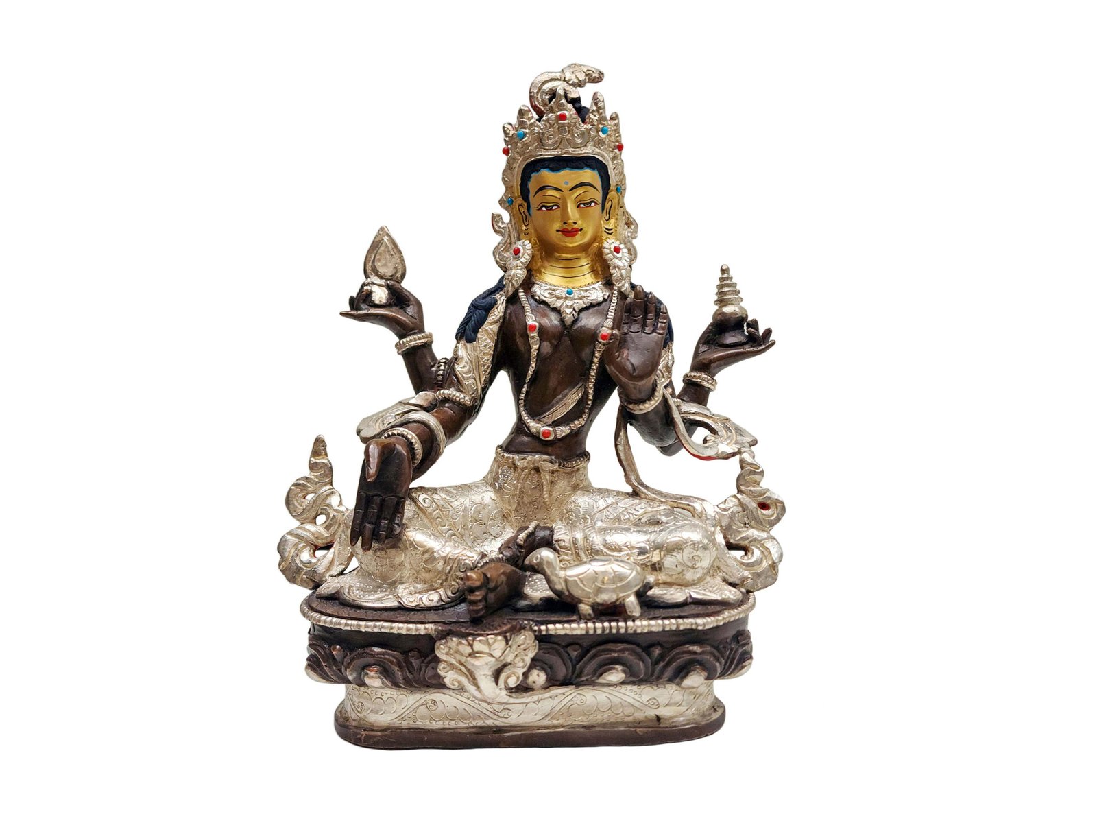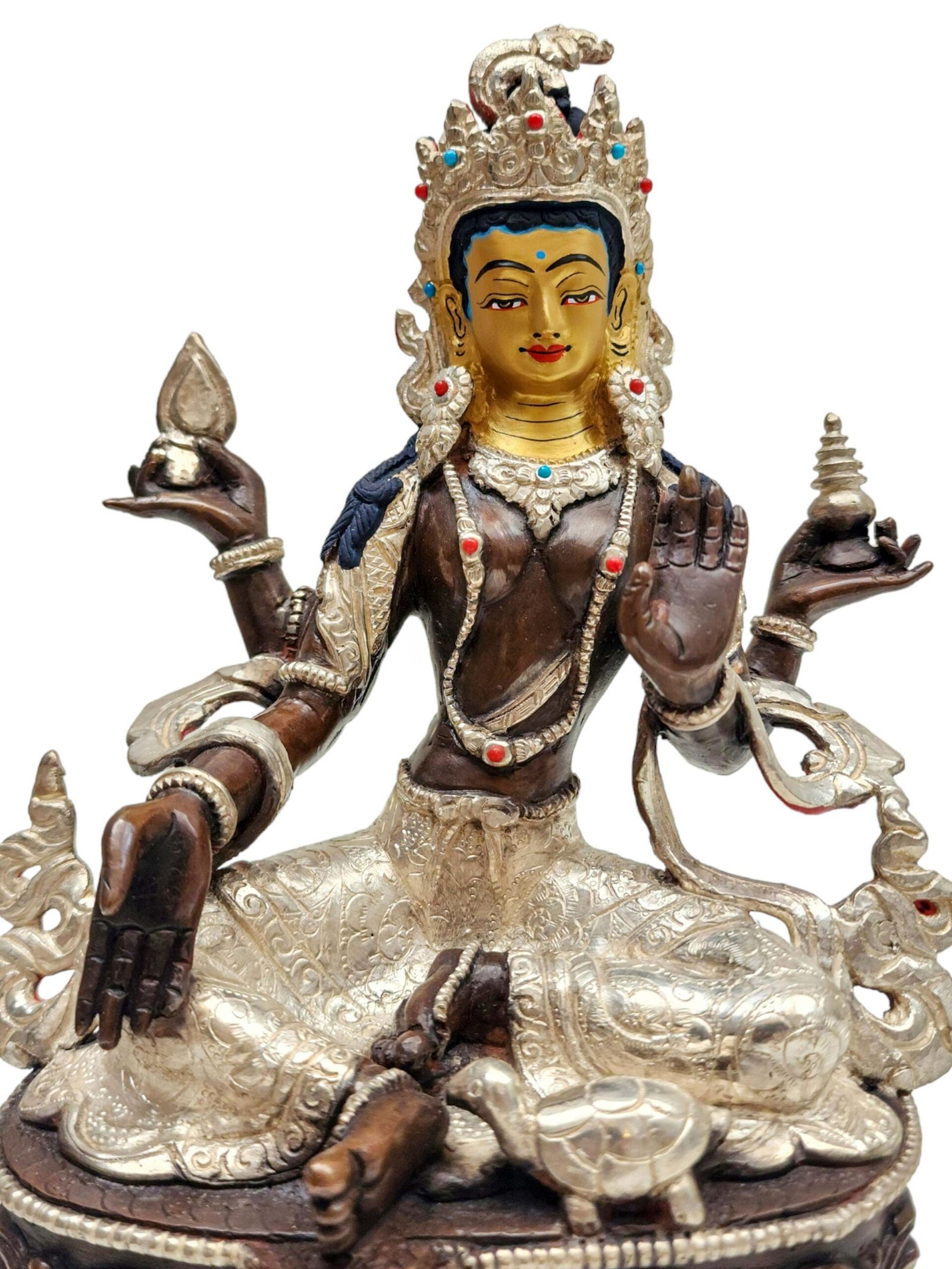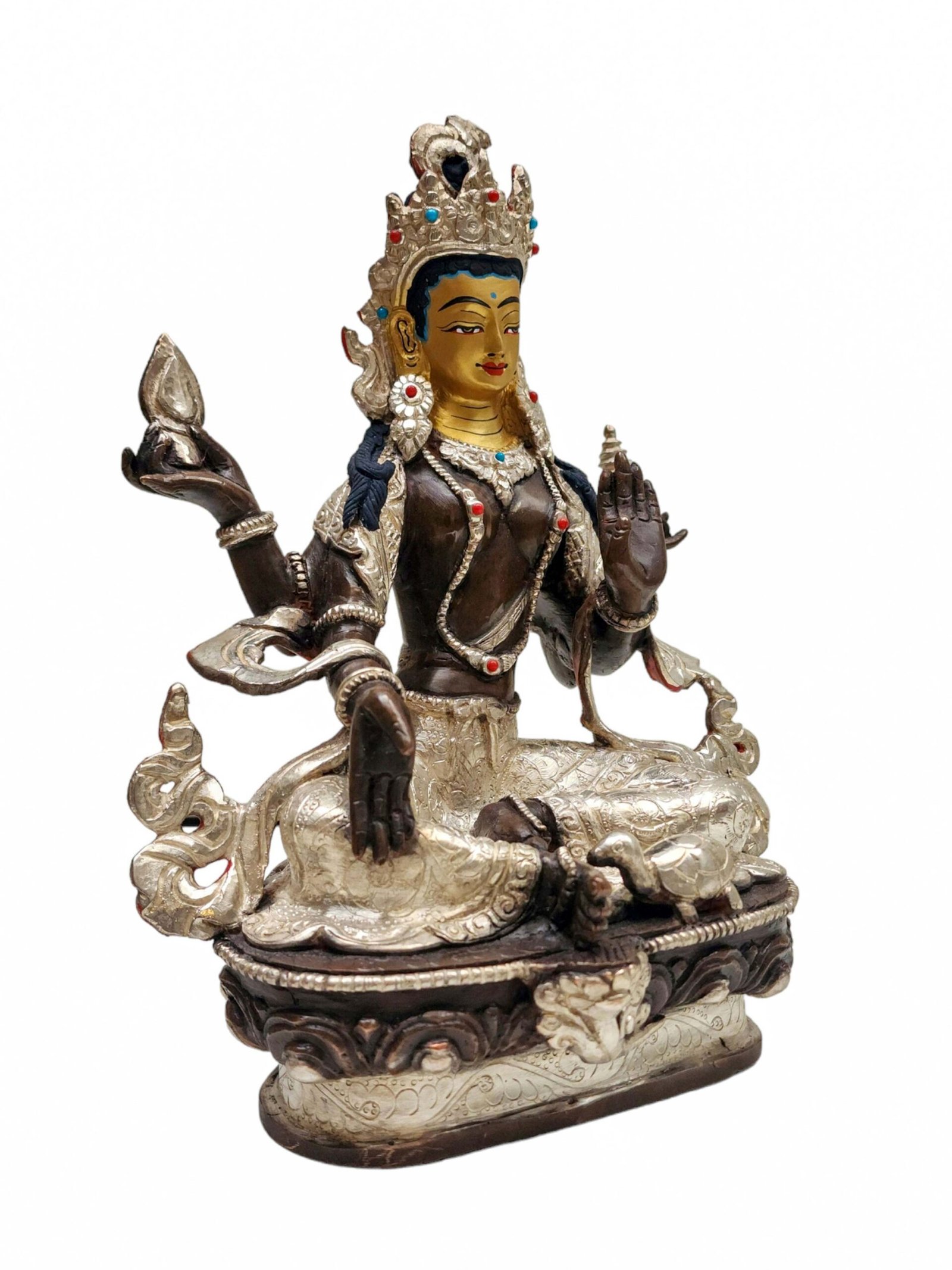 The face of Lakshmi is intricately gold-painted to highlight the fine details of her eyes and lips. This golden painting brings life to the statue, offering a sense of vitality and presence that metal carving alone cannot capture. In Buddhism, this act of painting the face with gold holds profound meaning, representing the intention to infuse the statue with expression, life, and spiritual energy. The golden application reflects the artisans’ devotion and meticulous craftsmanship, ensuring that every feature is infused with reverence for the goddess.
