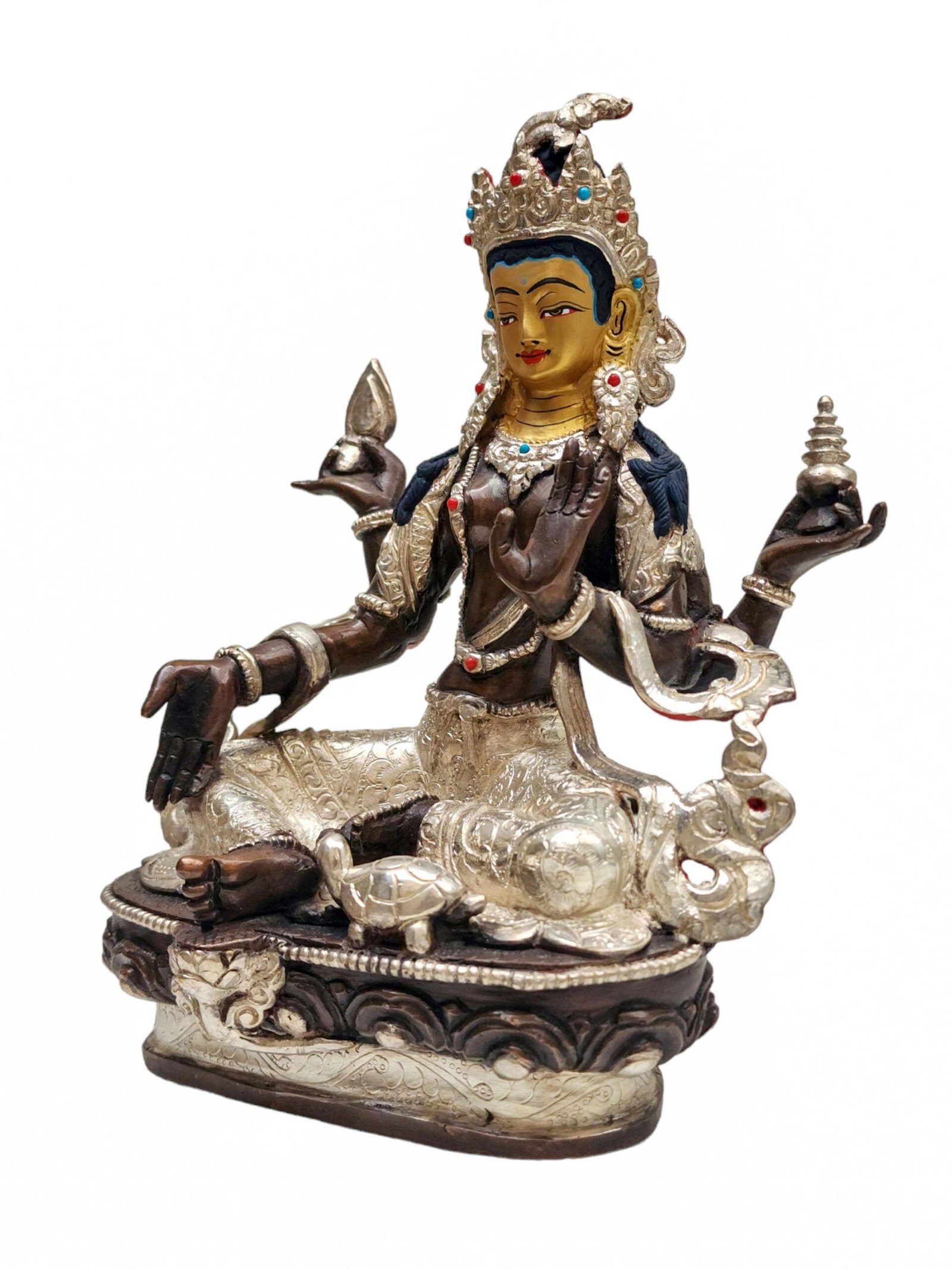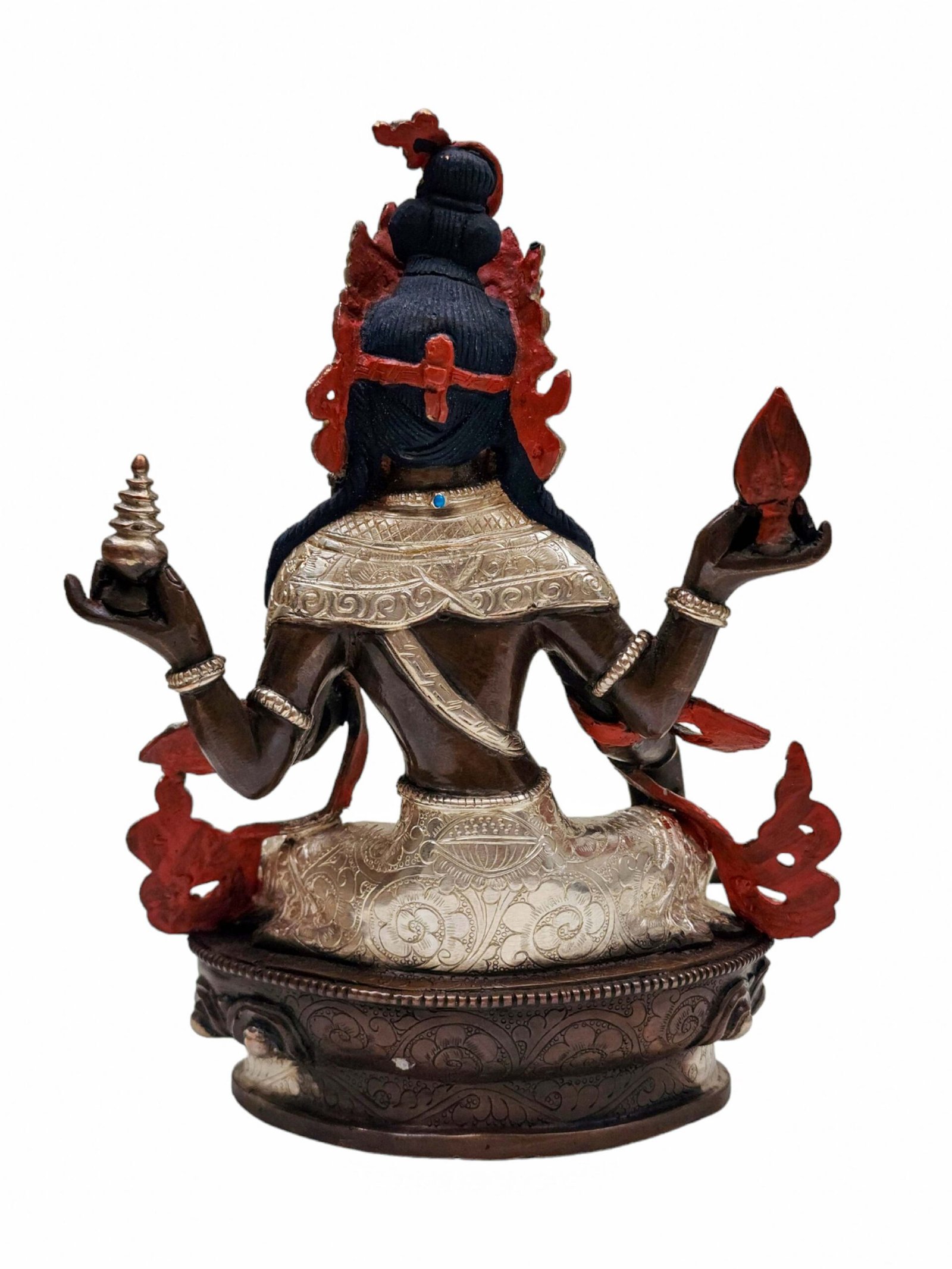 This statue features a stunning blend of silver plating and chocolate oxidation. The silver plating creates a radiant, lustrous finish that shines brightly, while the oxidized areas provide a rich, deep contrast, giving the statue a timeless, antique look. The combination of these two finishes enhances the statue’s beauty, adding depth and character. The silver areas reflect light, drawing attention to the goddess’s features, while the darkened oxidized sections provide a sense of mystery and elegance, making this statue a true work of art.