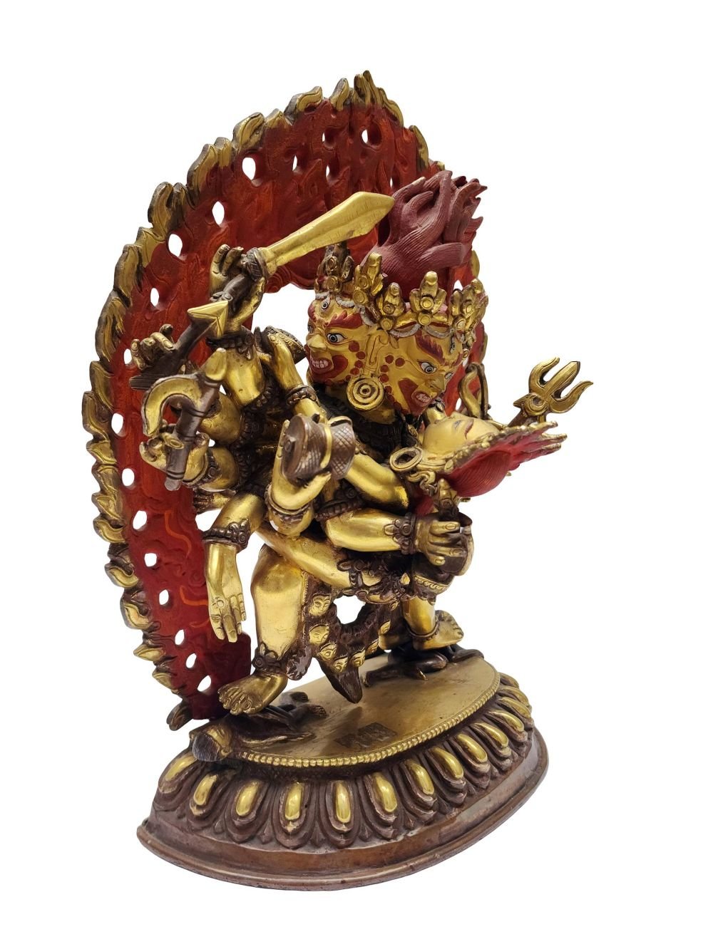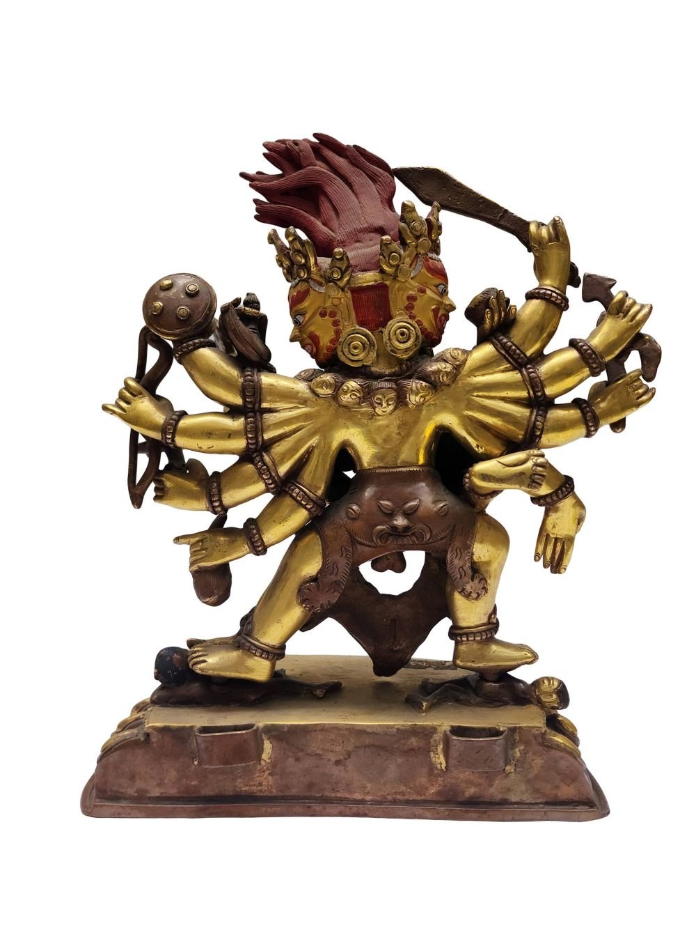 Mahakala Twelve Arms Statue – Gold-Plated, Face Painted, Handmade Copper (Old Stock)