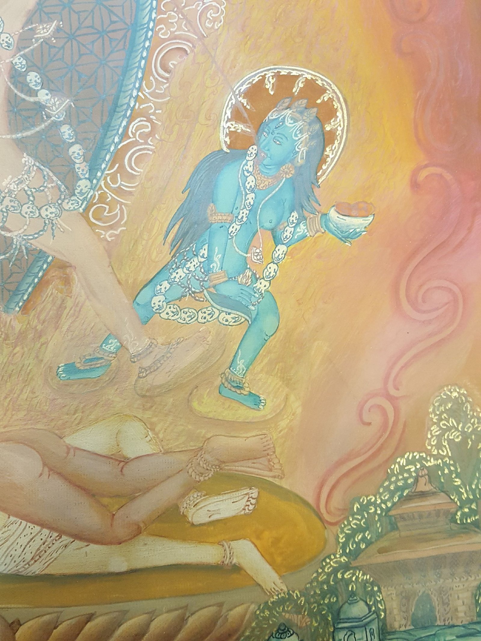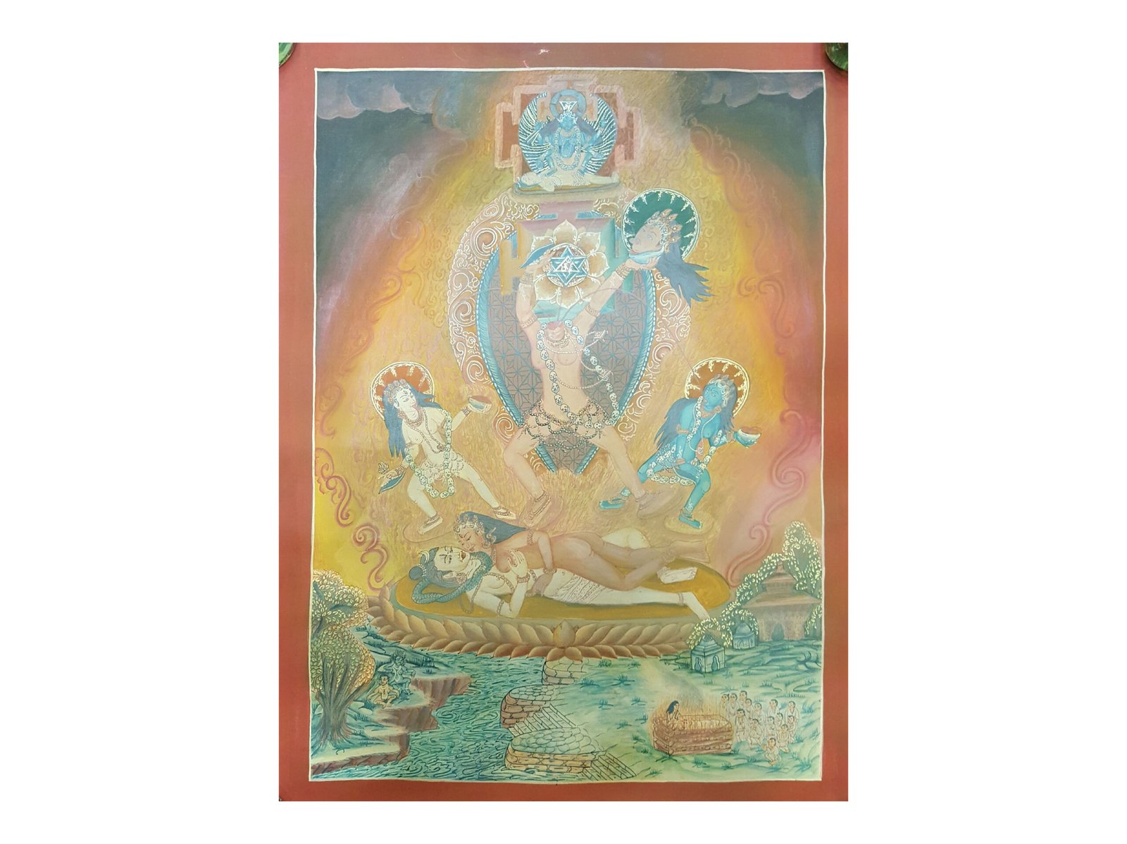 This Chhinnamasta thangka is a traditional Newari paubha painting. Paubhas are sacred artworks created by the Newar people of Nepal, depicting Hindu and Buddhist deities, mandalas, and spiritual scenes. Crafted on cotton canvas, these paintings are used for meditation, rituals, and religious festivals.