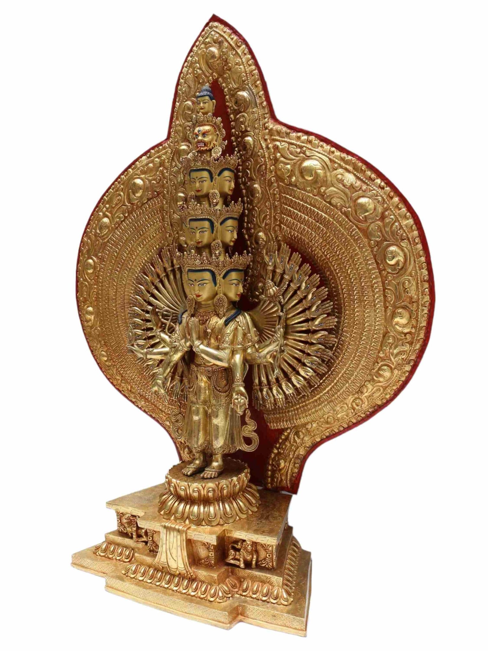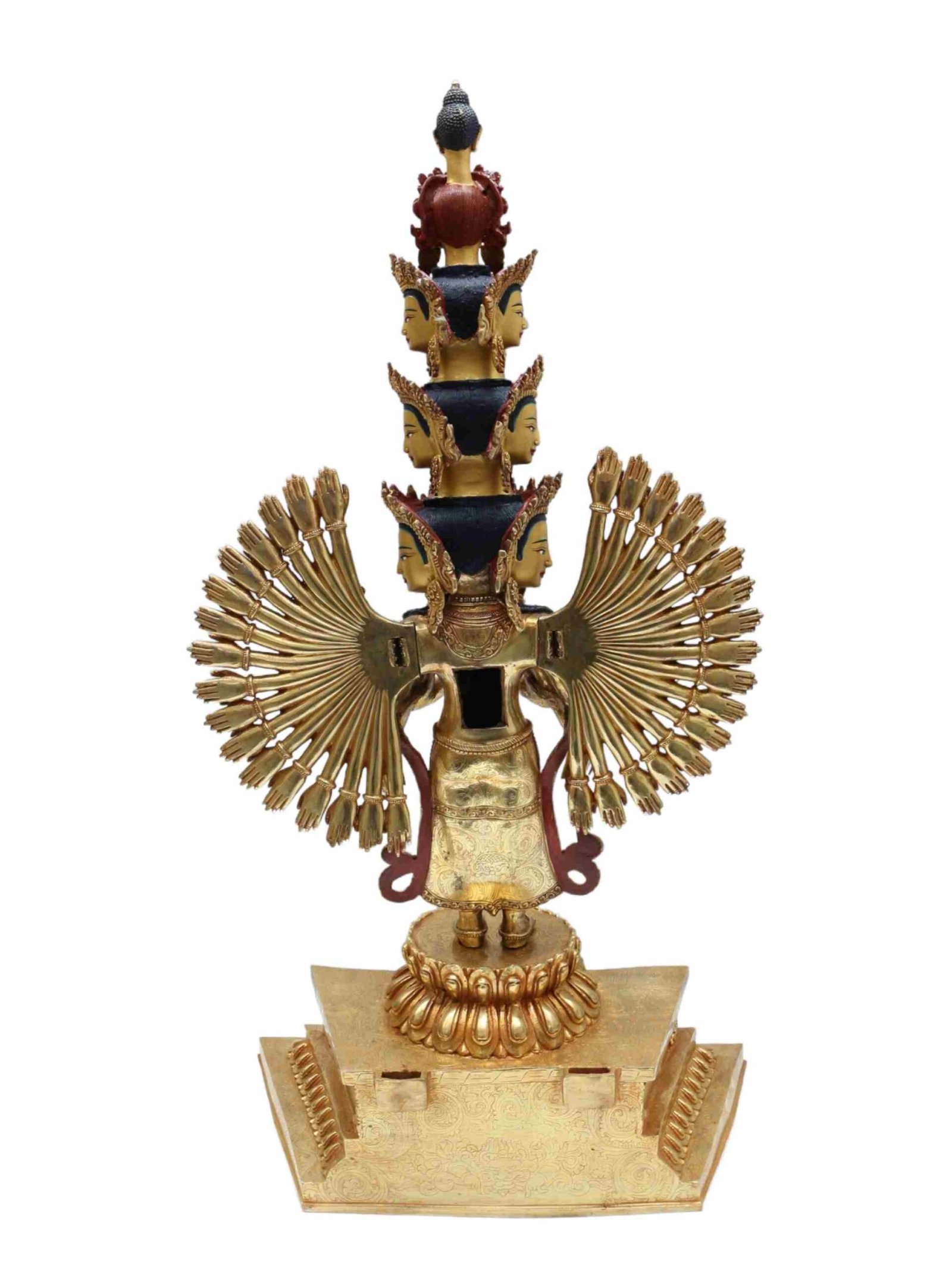 The face of Sahasrabhuja Avalokitesvara is carefully painted with pure gold, bringing a lifelike presence to the sculpture. Special attention is given to the eyes and lips, capturing the deity’s serenity, awareness, and compassion—features that metalwork alone cannot convey.