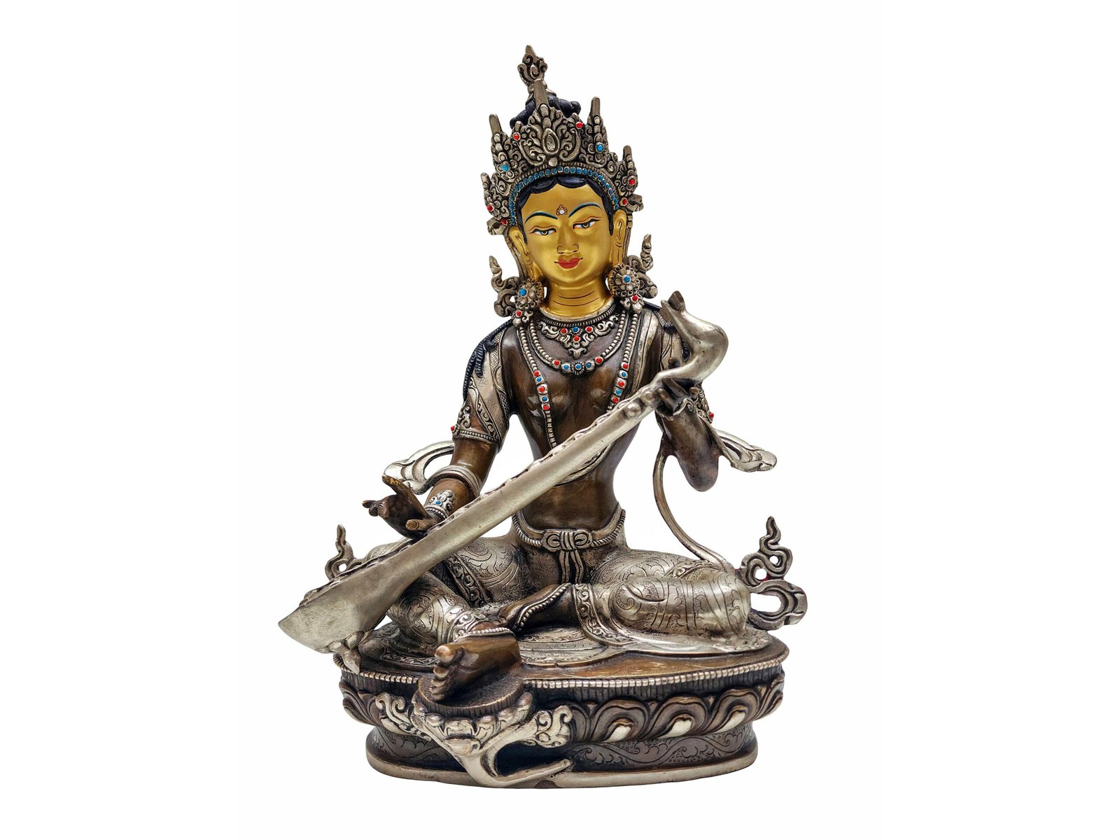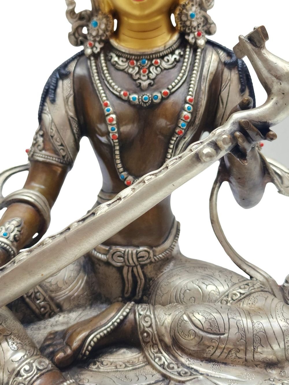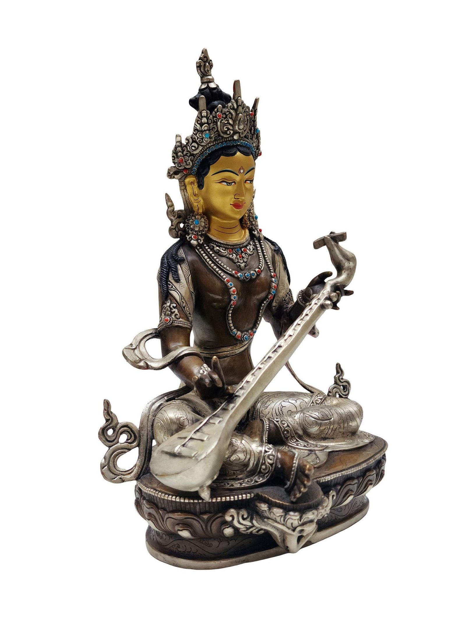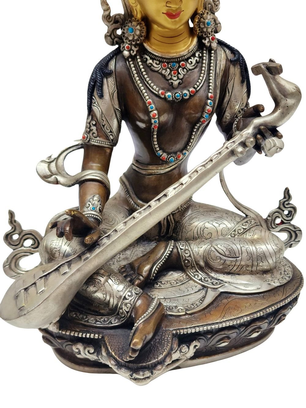 Saraswati Statue – Nepali Handmade, Silver & Chocolate Oxidized, Gold Face Painted