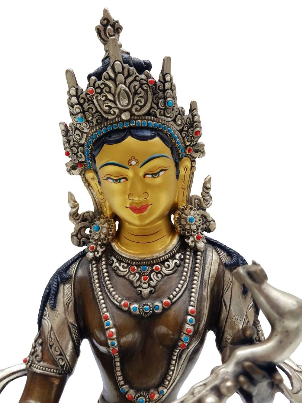 The face of the statue is hand-painted in gold, highlighting the eyes, lips, and facial expression—features essential for spiritual resonance. This sacred technique brings the sculpture to life, aligning with Buddhist and Hindu ritual practice where a gold-painted face symbolizes activation of the divine presence for worship, consecration, and meditation.