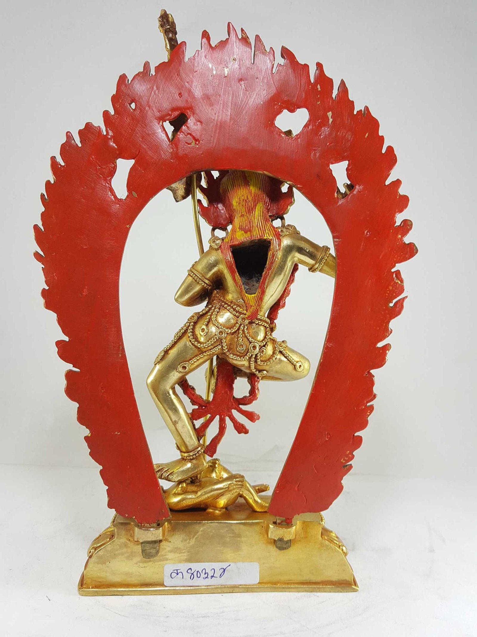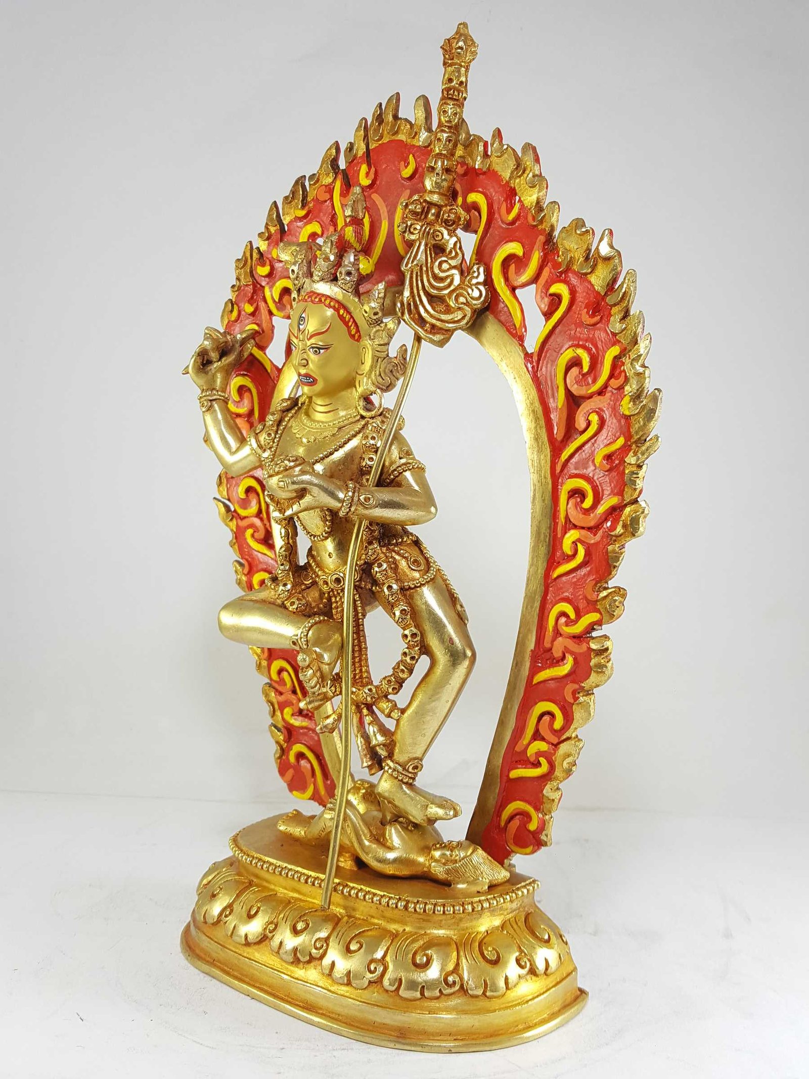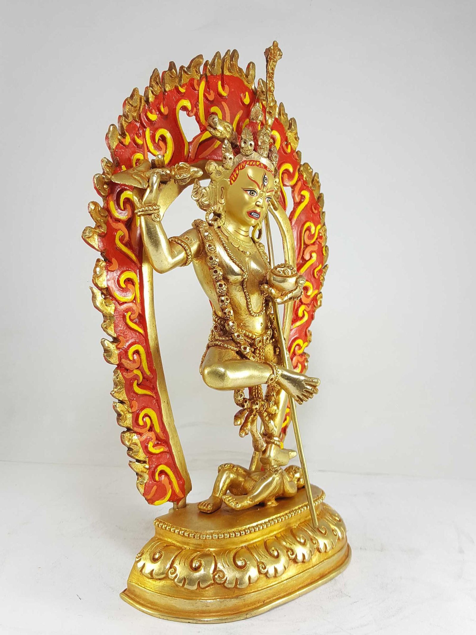 The Vajravarahi statue is created using the ancient lost-wax process, a meticulous technique that has been practiced for thousands of years. The detailed wax model is coated with ceramic material, and molten copper is poured into the cavity after the wax is melted away, producing an exact replica of the original design. This time-honored method ensures the highest level of precision and artistry in every piece.
