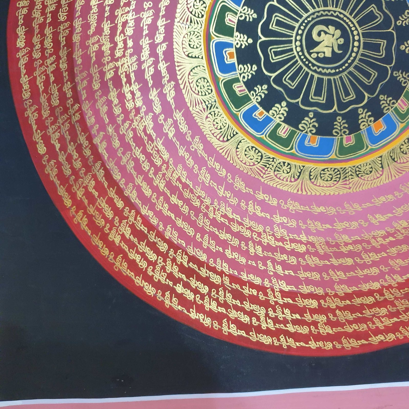 This square Mandala Thangka is a spiritually significant artwork, perfect for devotion, meditation, or home décor. Its vivid details and sacred mantra inscription make it a powerful representation of Buddhist wisdom, peace, and tradition.