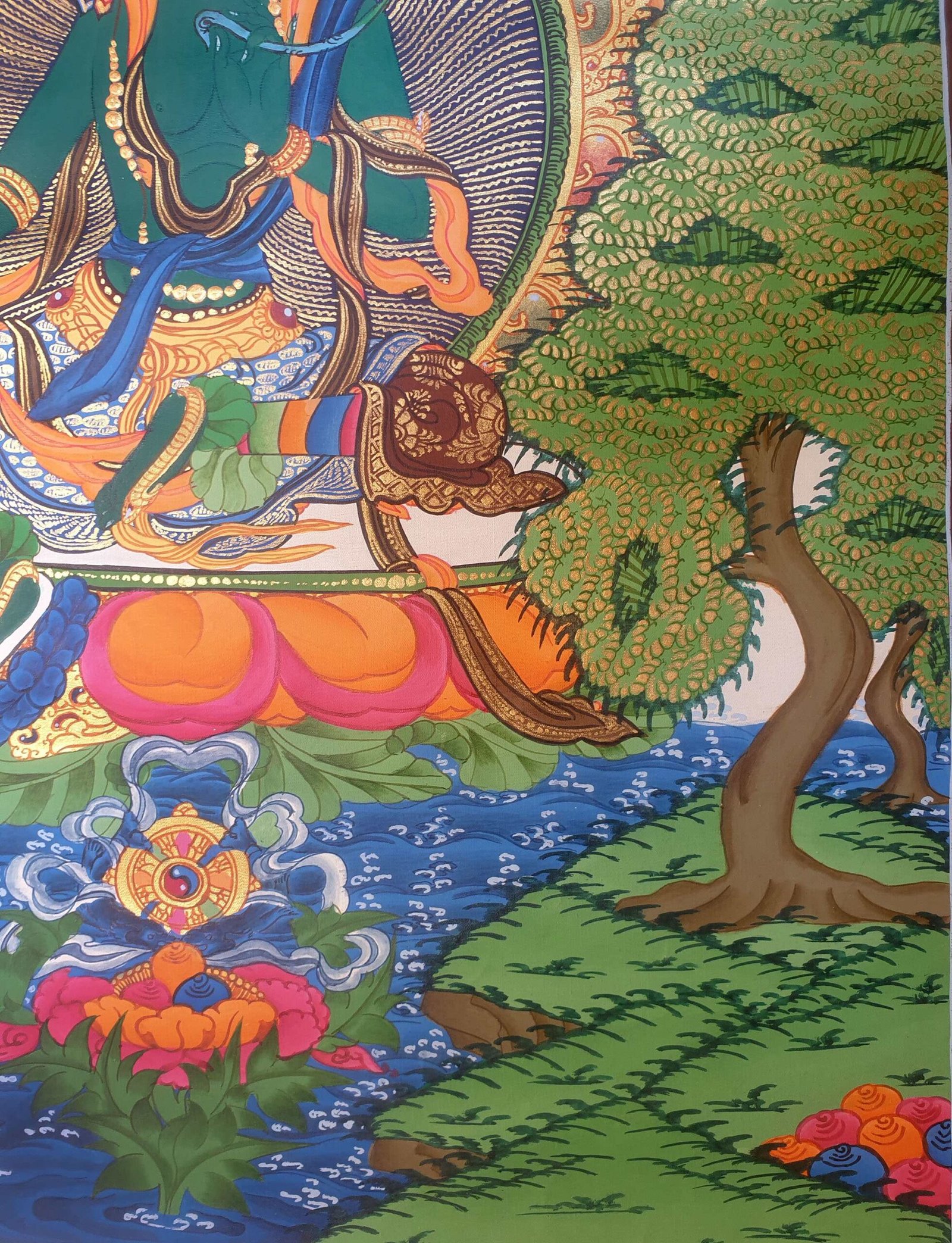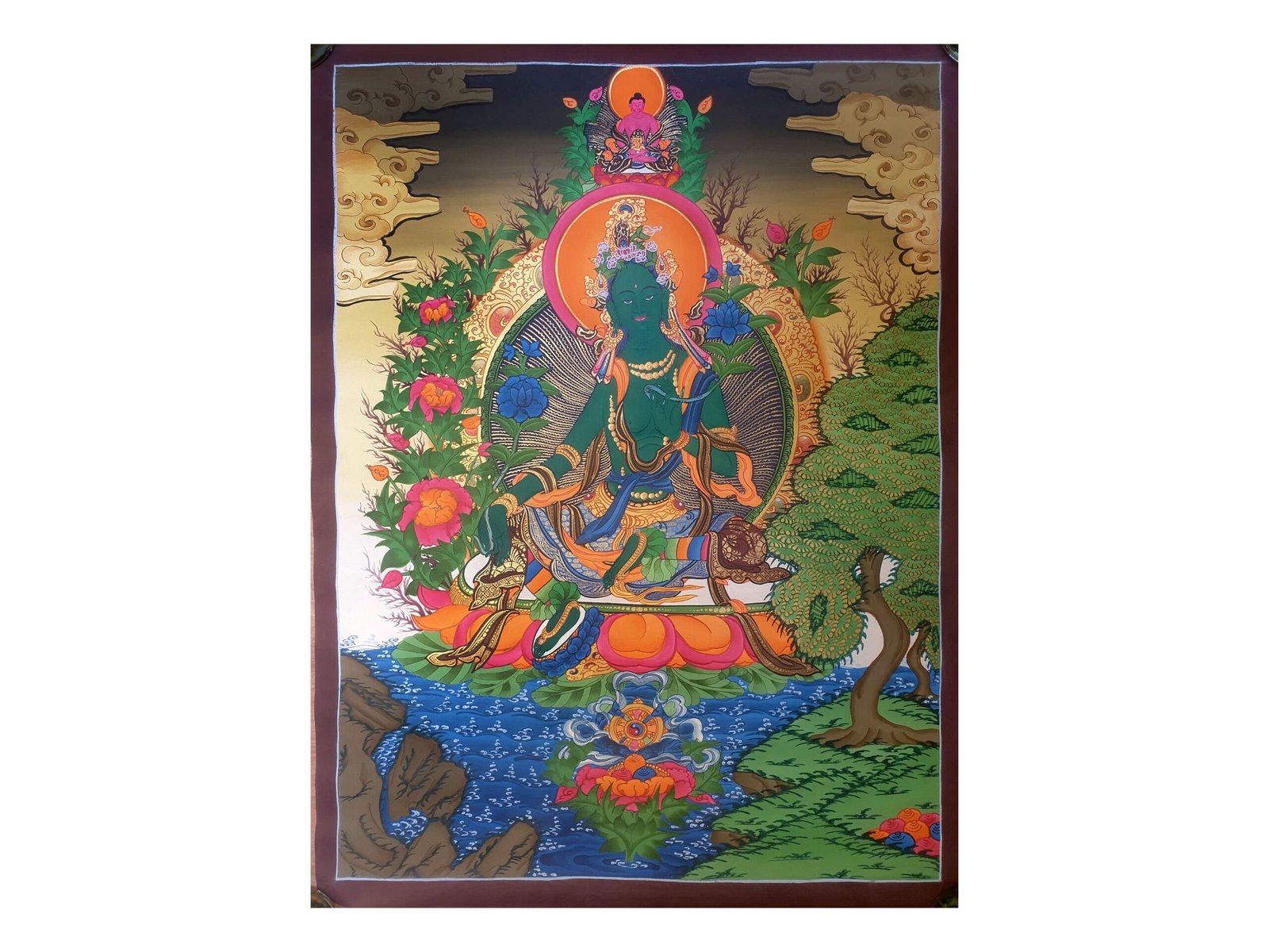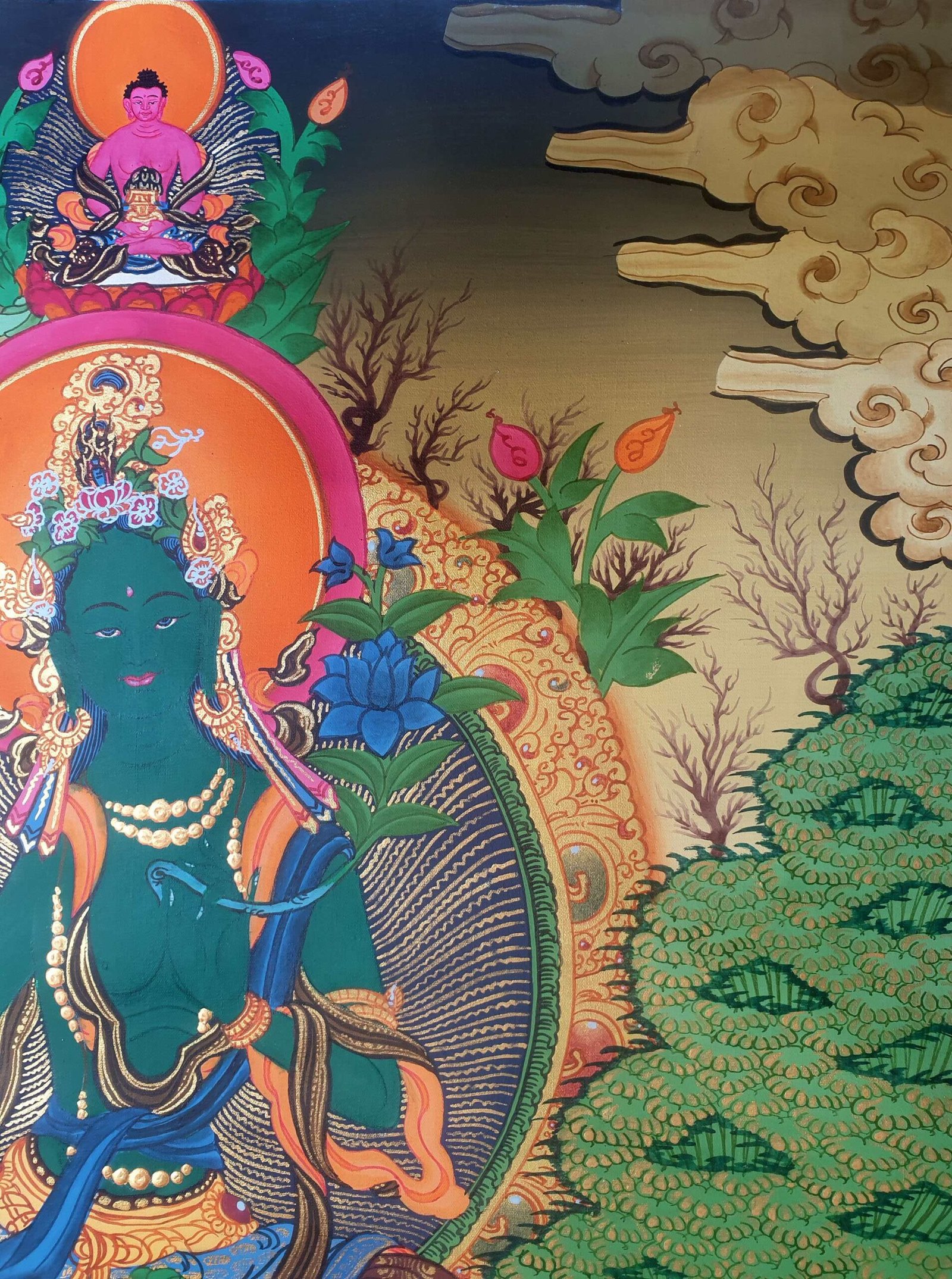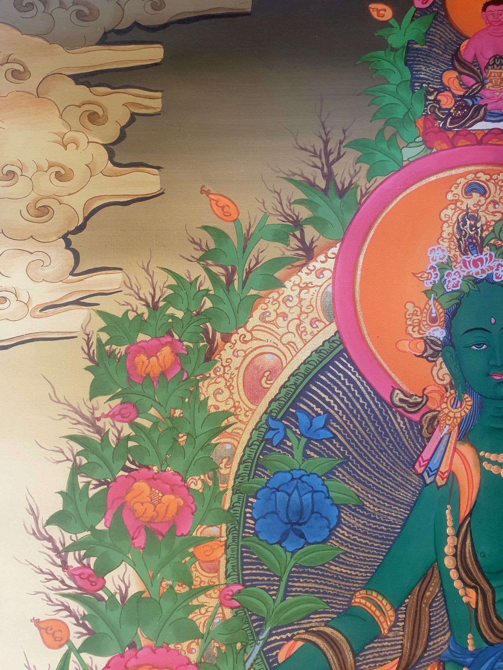 This Green Tara Thangka Painting is a masterpiece of sacred artistry, blending spiritual depth and artistic beauty. Perfect for personal devotion, meditation, or as an exquisite addition to a collection.